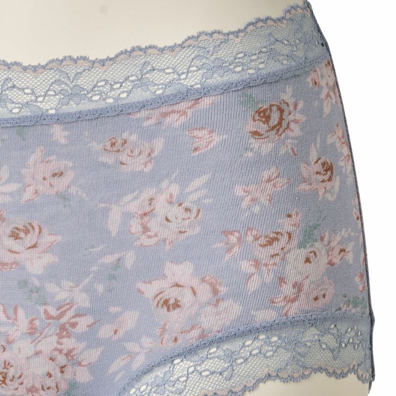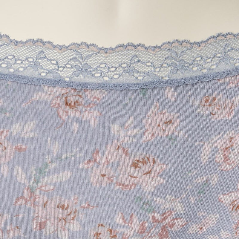 過去に人気のあったフラワープリントをリバイバル。あたたかみのあるローズのカラーが映えるアイボリーとさりげない華やかさがあるブルーの2色展開。素材はローゲージのガーゼベア天竺なのでフィット感がありながらもふわっとした肌当たりが楽しめる。花モチーフのレースの組み合わせもキッドブルーらしいシリーズです。