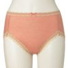 深ばきのスタンダードショーツ。リボンを通したような配色レースでかわいく仕上げました。お腹も包み込むような安心の履き心地。鼠経部のカットで足ぐりを締め付けず動きやすい。