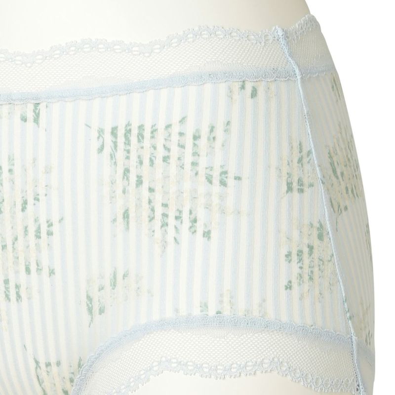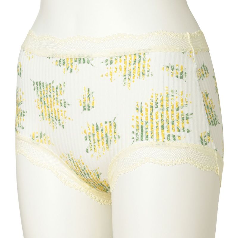 明るく華やかな総柄のショートカルソンは、ほどよいウエストの深さとヒップの包み込みがよいと履き心地が人気のアイテム。ウエストや足ぐりに施したレースが軽やかな印象。ウエストはゴムではなくレースのストレッチで伸びを出しているのでゴムの締めつけ感がなく当たりがソフトです。ブランドネームとサイズは生地にプリントしてあるので肌ストレスが少ない仕様。