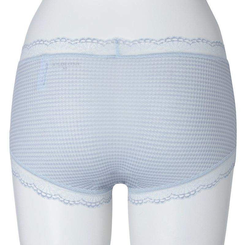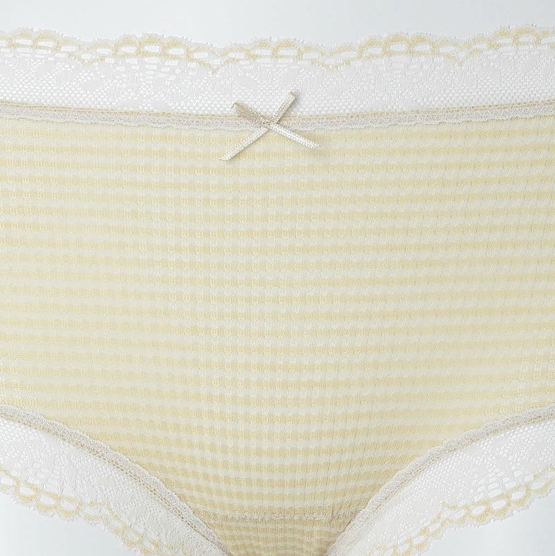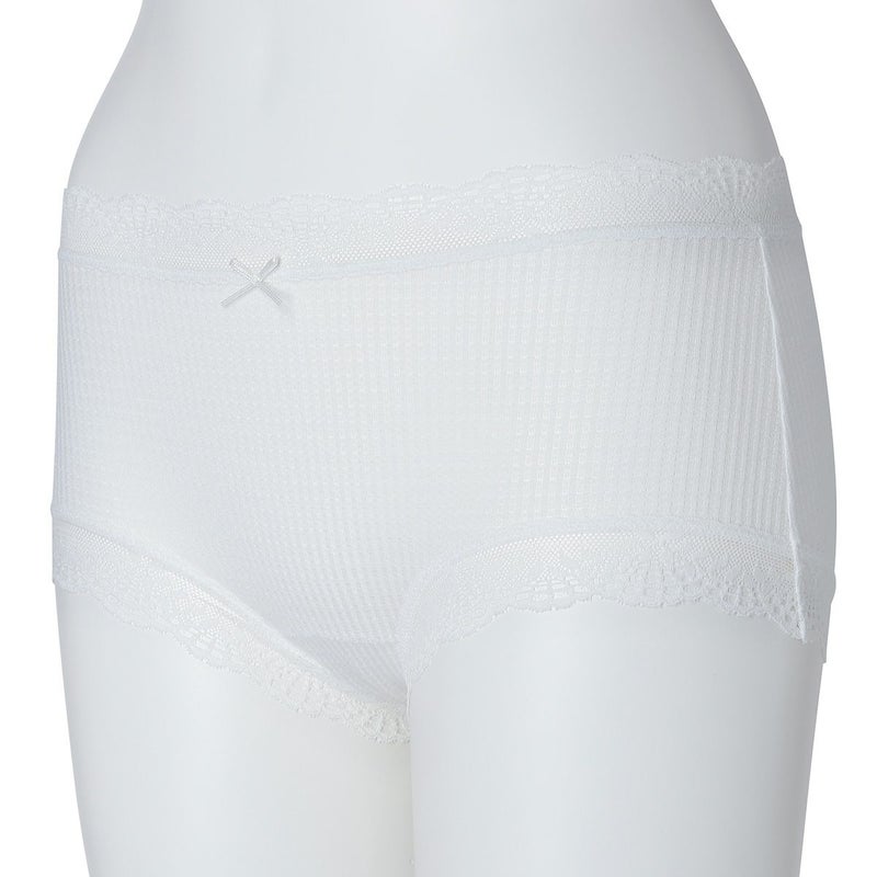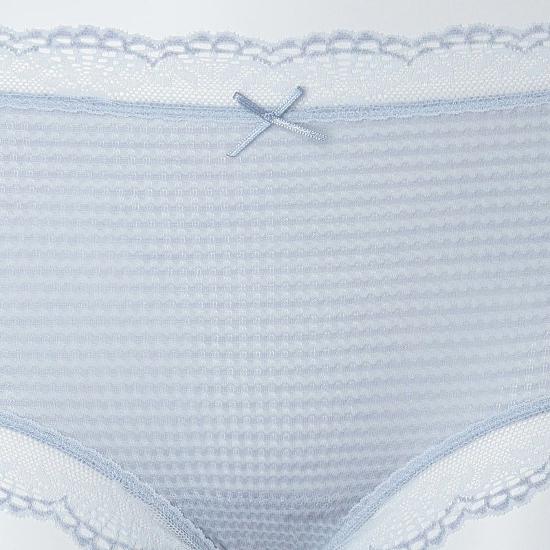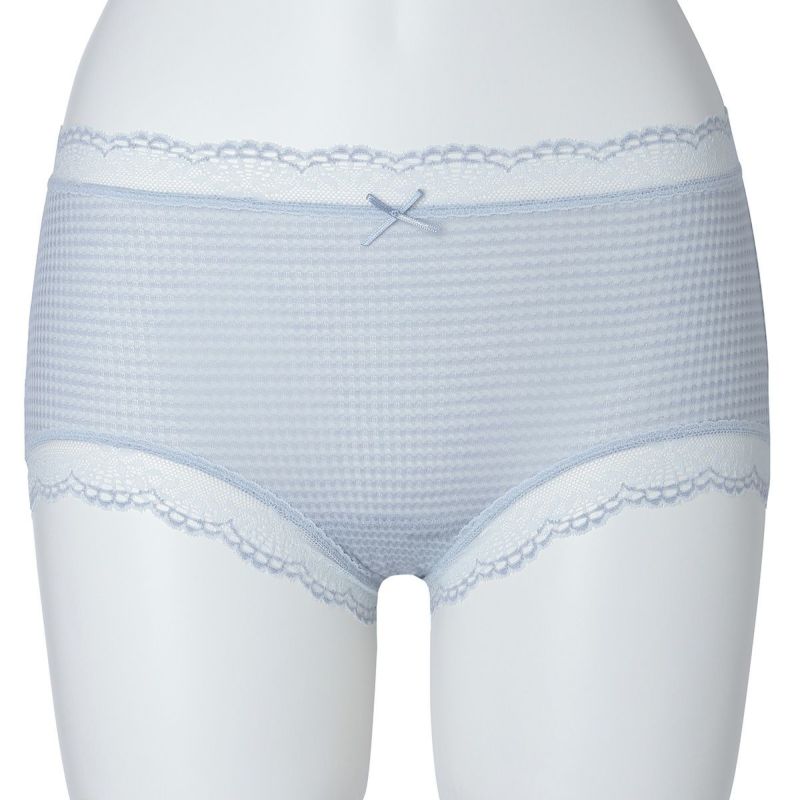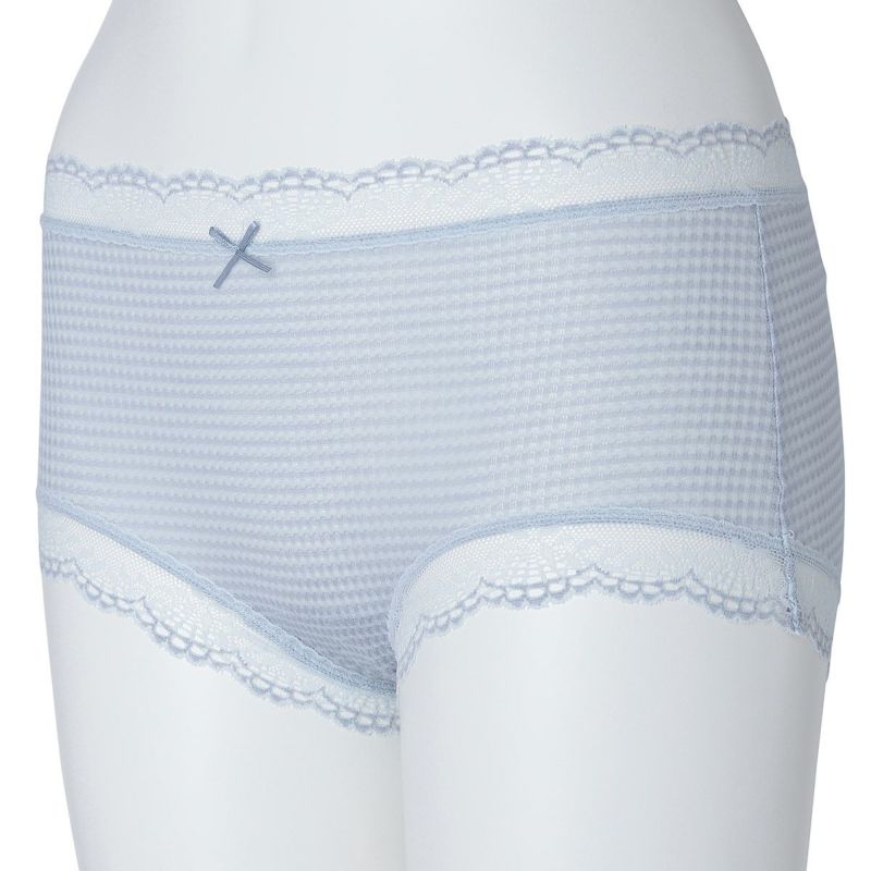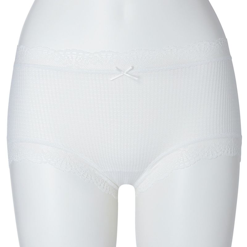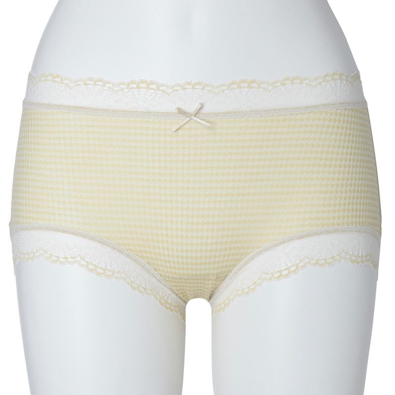 ウエストが腰骨上くらいにくるため通常のショーツよりもウエストの締め付けがなく楽に履けるヒップハンガーショートカルソン。ウエストや脚ぐりにレースをたっぷりあしらいかわいらしさをプラス。プチリボンもカジュアルなボーダーにフェミニンなアクセント。シアー感のある生地が肌に優しくフィットします。