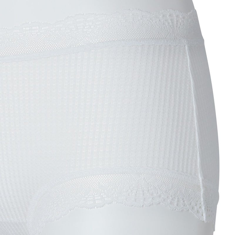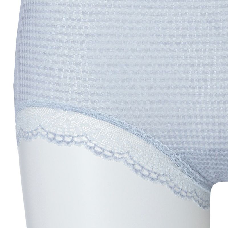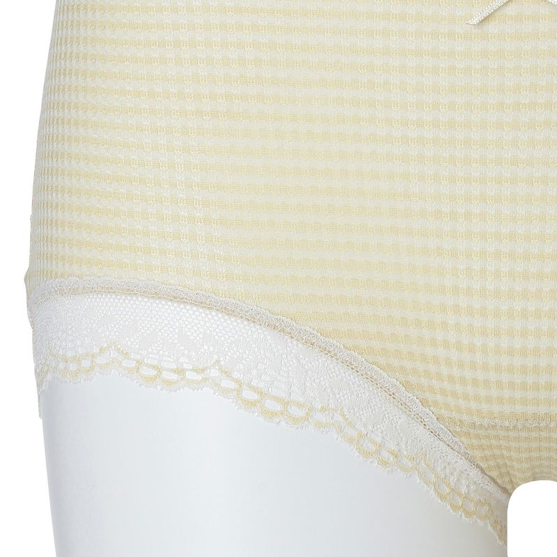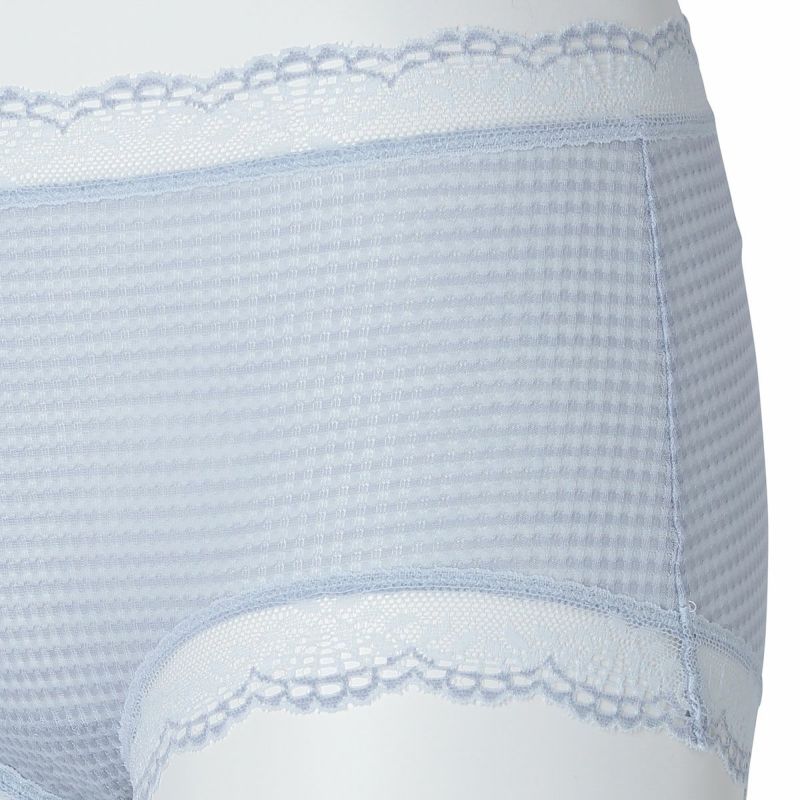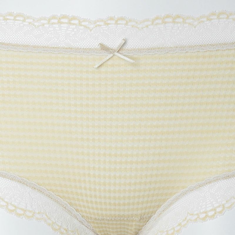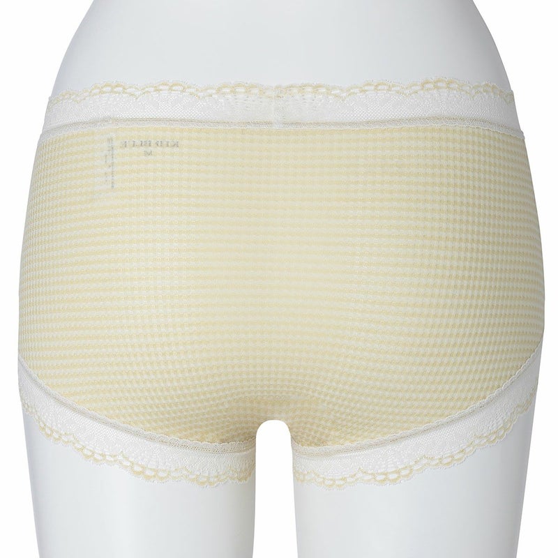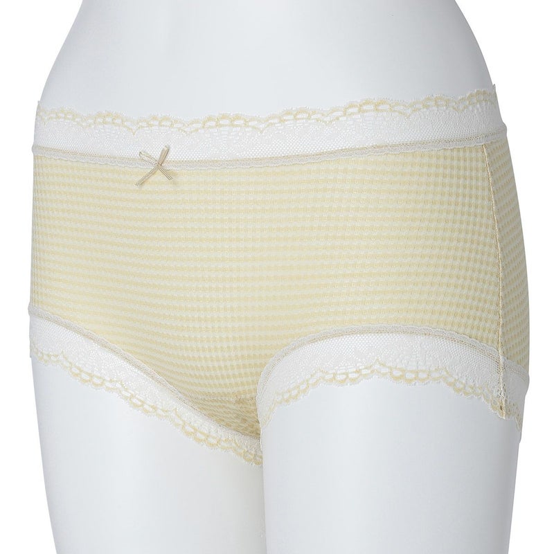 ウエストが腰骨上くらいにくるため通常のショーツよりもウエストの締め付けがなく楽に履けるヒップハンガーショートカルソン。ウエストや脚ぐりにレースをたっぷりあしらいかわいらしさをプラス。プチリボンもカジュアルなボーダーにフェミニンなアクセント。シアー感のある生地が肌に優しくフィットします。