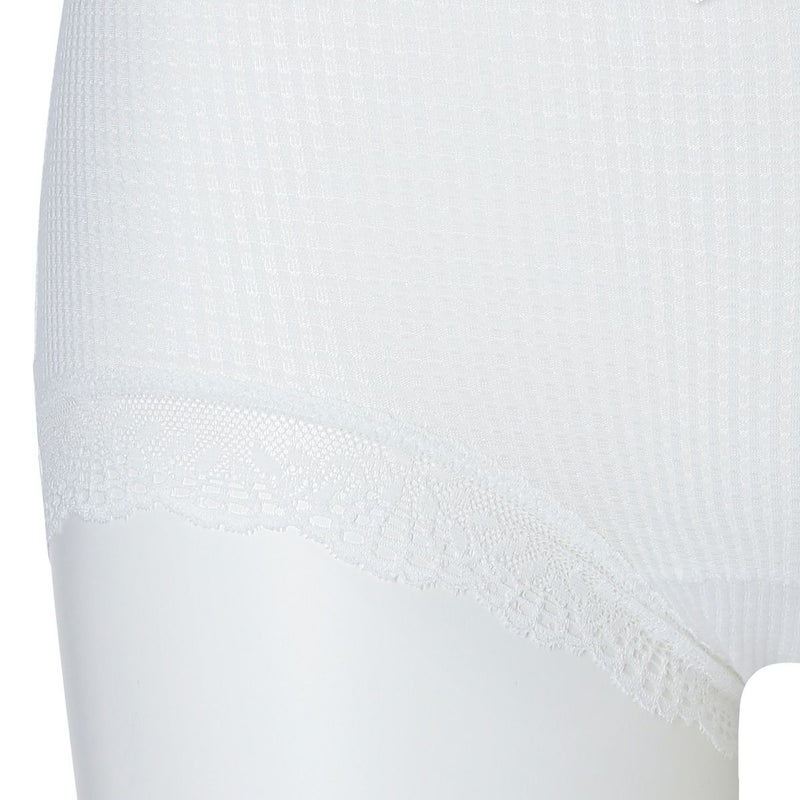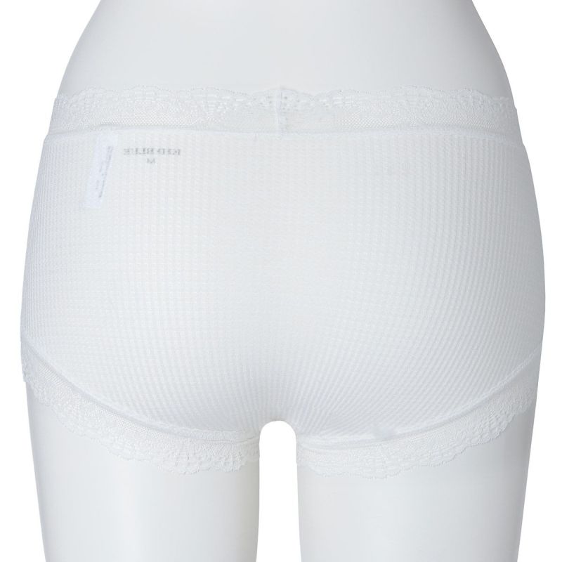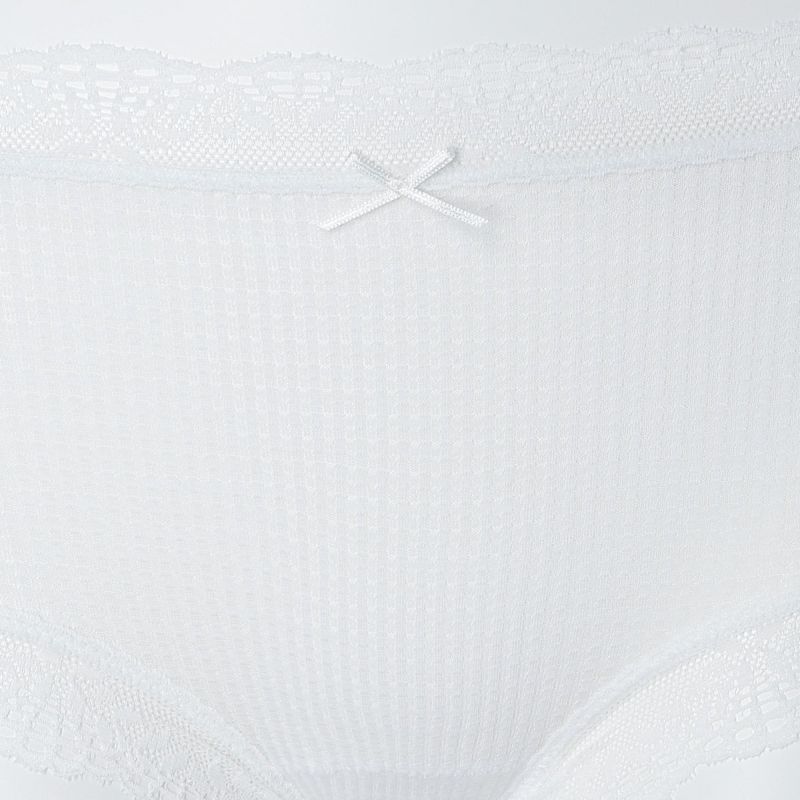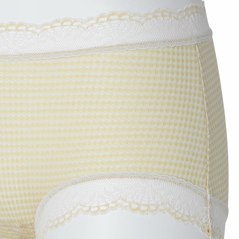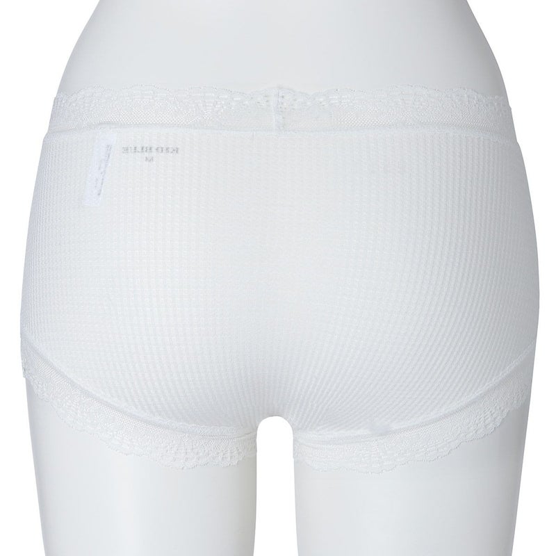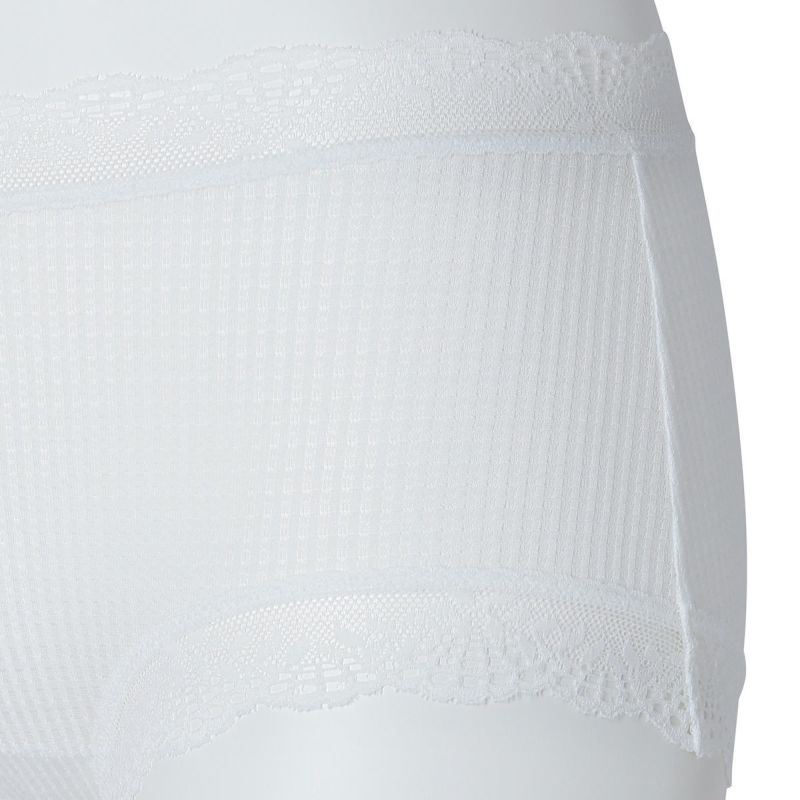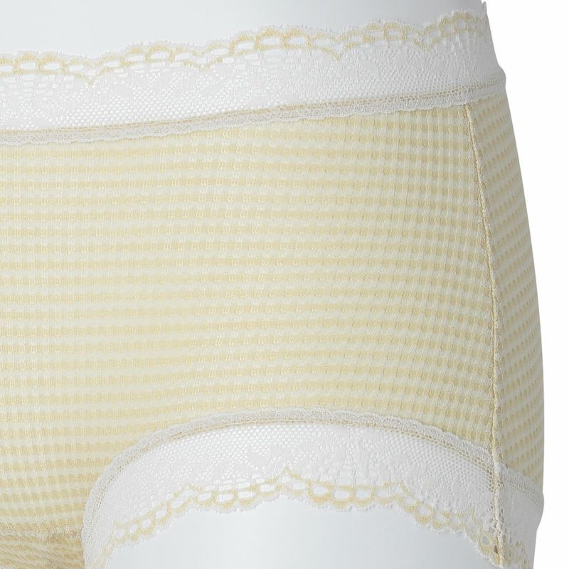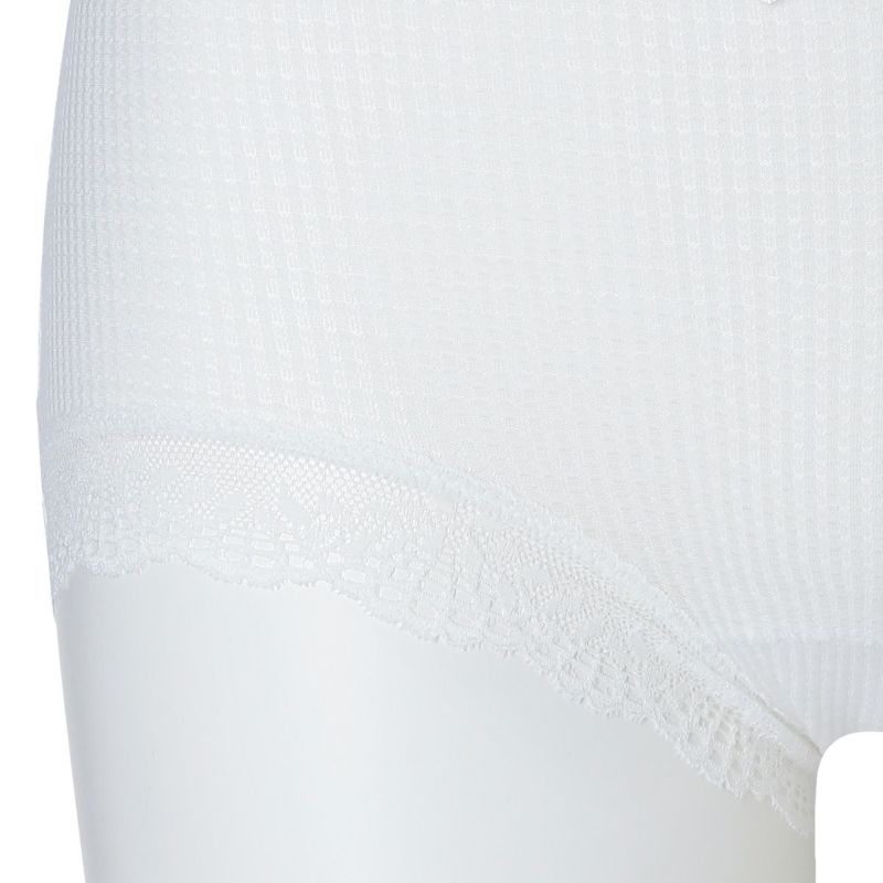 ウエストが腰骨上くらいにくるため通常のショーツよりもウエストの締め付けがなく楽に履けるヒップハンガーショートカルソン。ウエストや脚ぐりにレースをたっぷりあしらいかわいらしさをプラス。プチリボンもカジュアルなボーダーにフェミニンなアクセント。シアー感のある生地が肌に優しくフィットします。