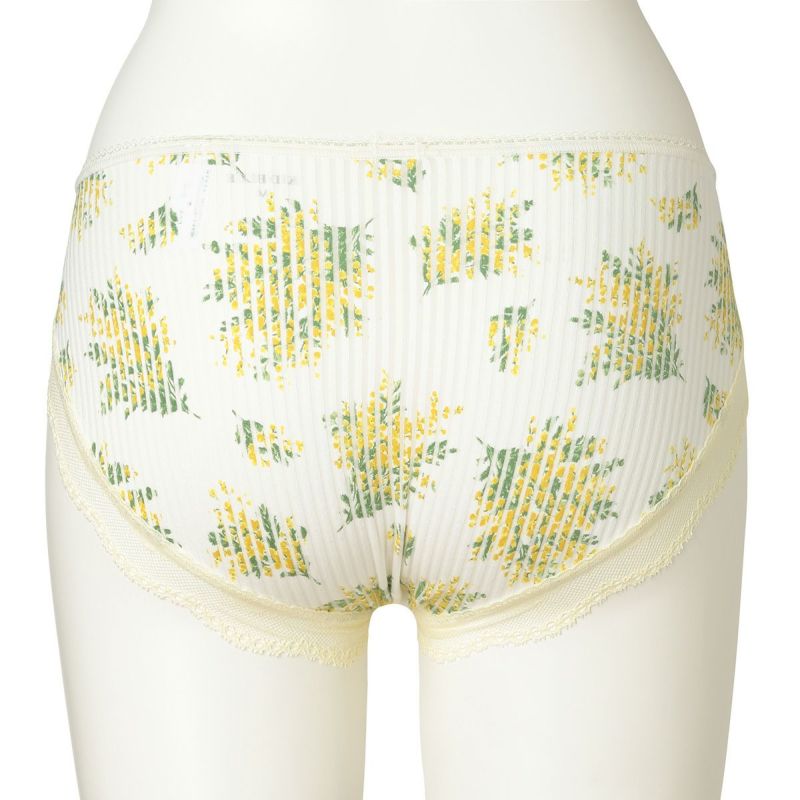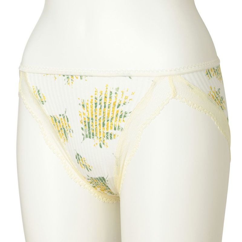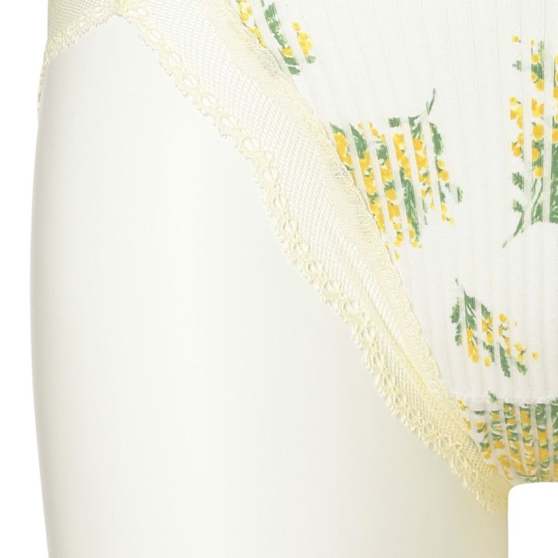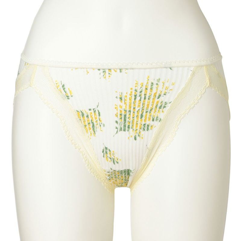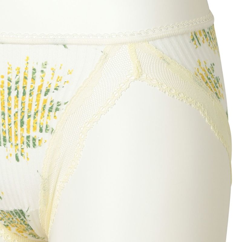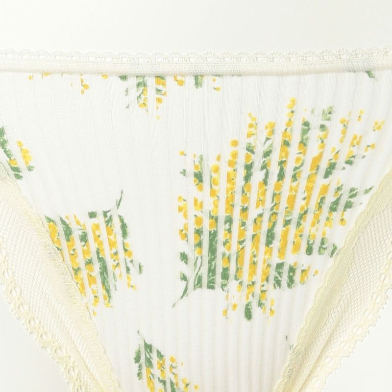 毎年人気のミモザインナーシリーズが登場。今年はストライプ地に繊細なミモザのブーケ柄をプリント。綿とエステルの交編ボーダーという凝った素材で、シアー感のあるデザインに仕上げました。春らしいレースカラーがフェミニンなアクセント◎