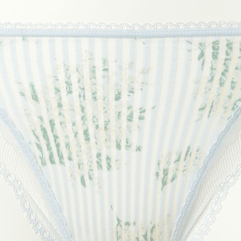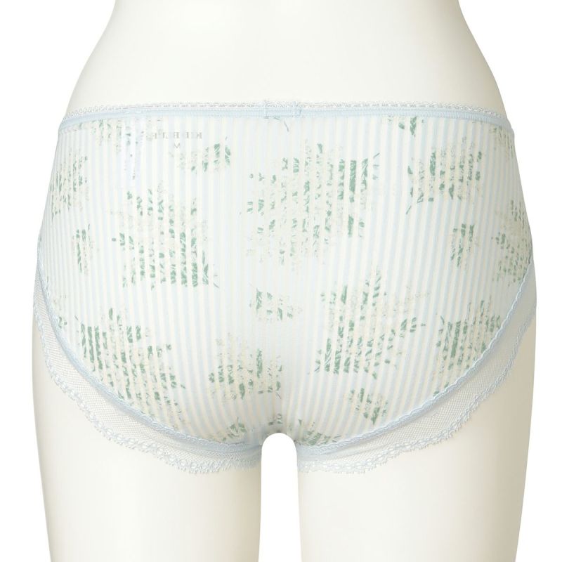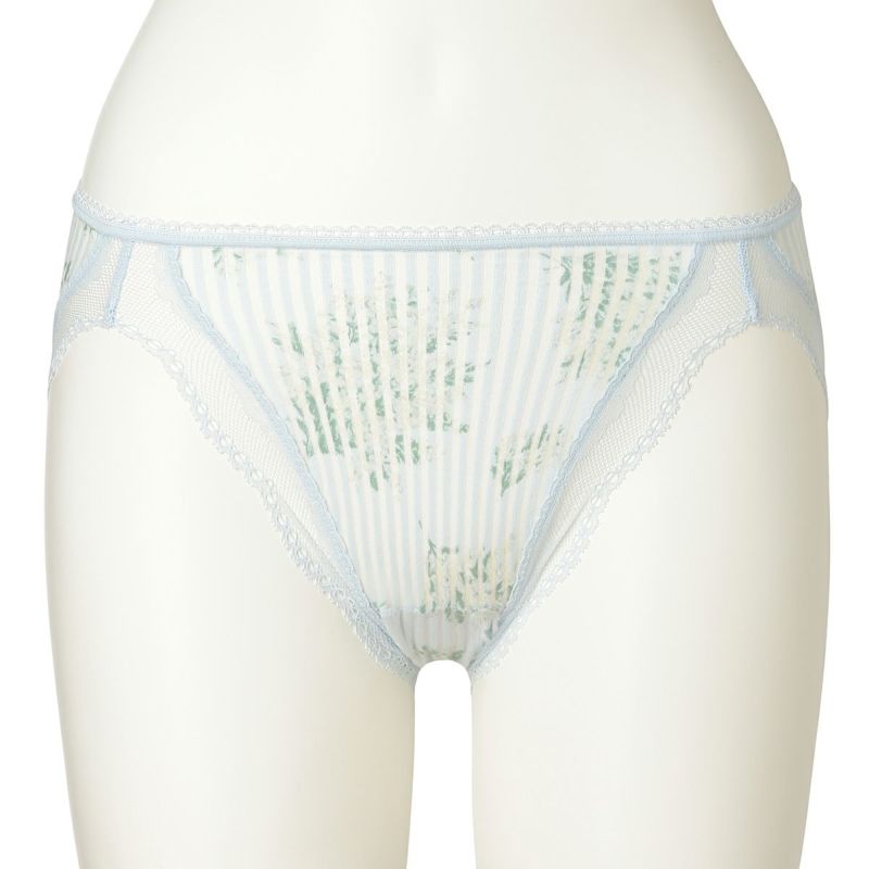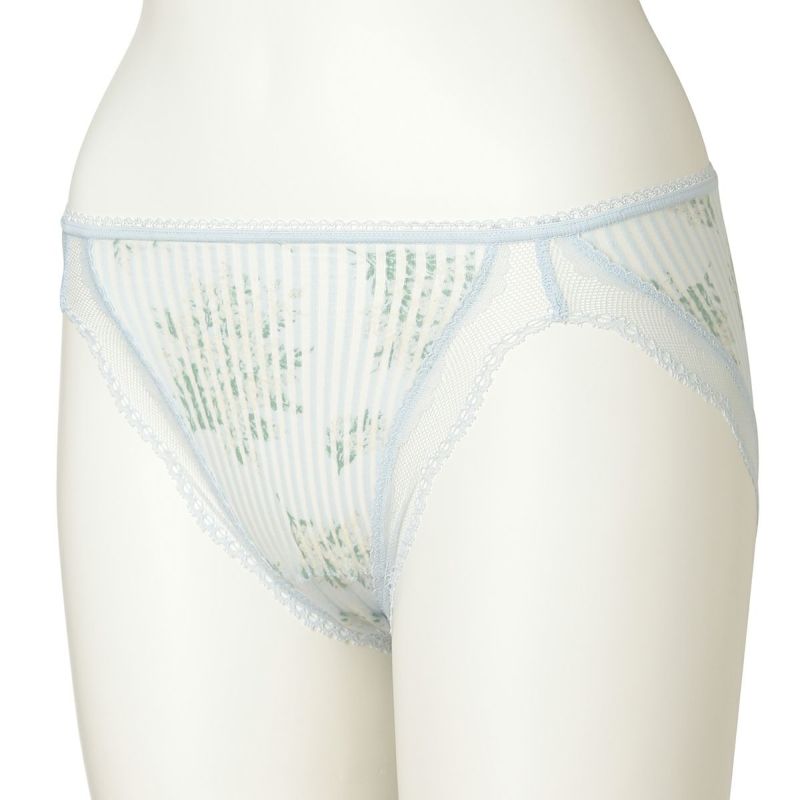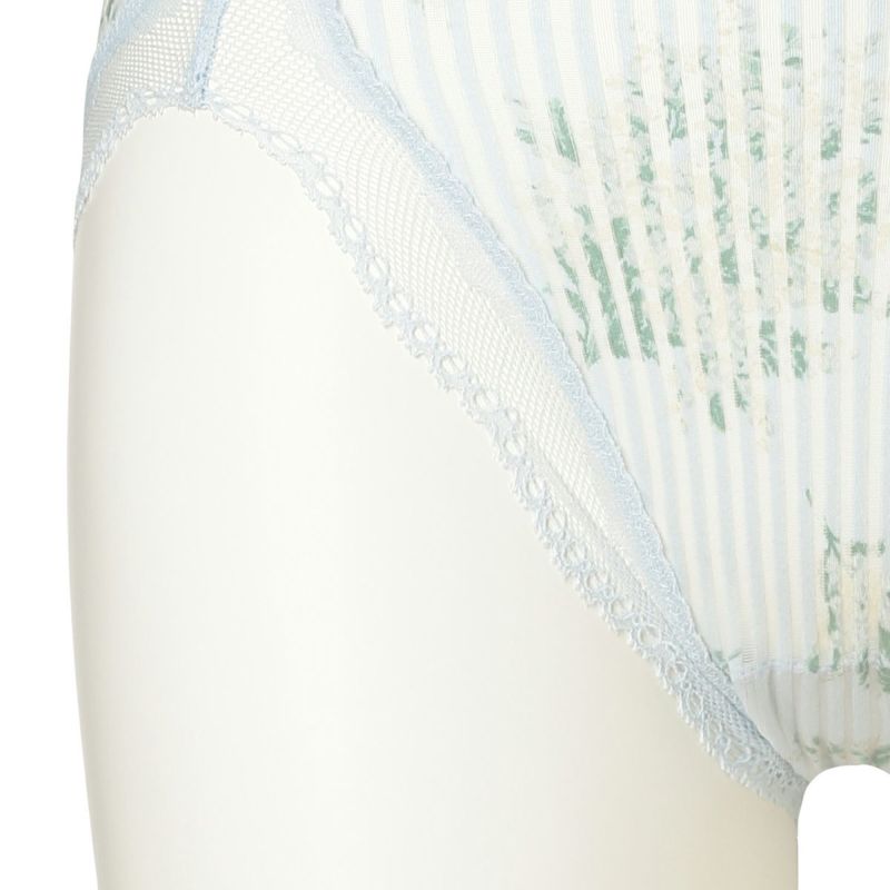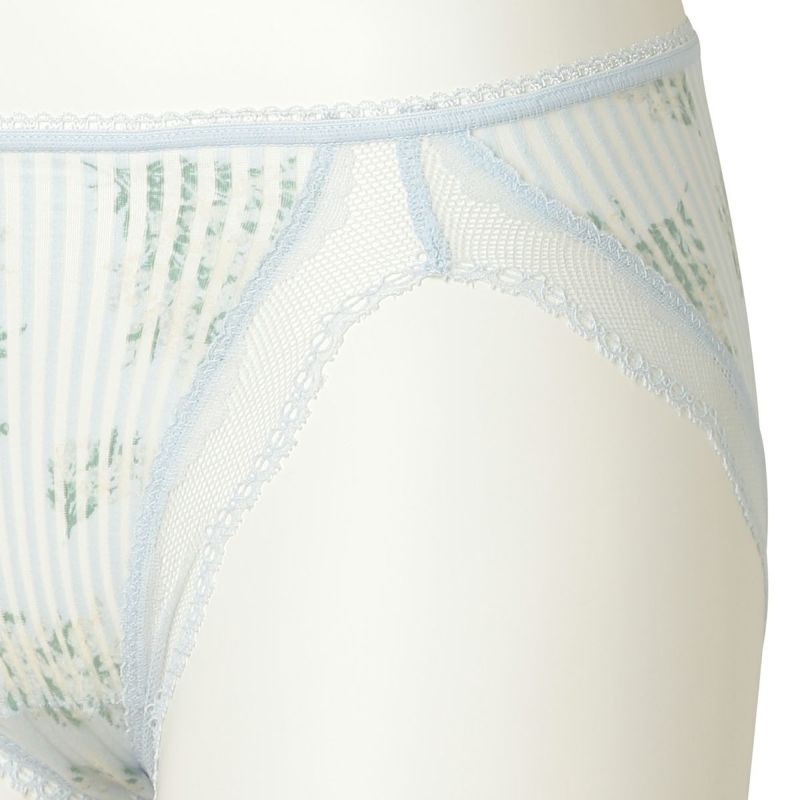 明るく華やかな総柄のノーマルショーツ。ウエストや足ぐりにレースをたっぷりあしらい、軽やかな印象に。ウエストはゴムではなくレースのストレッチで伸びを出しているのでゴムの締めつけ感がなく当たりがソフトです。鼠径部に沿った足ぐりで動きやすく脚長効果もあるスタンダードタイプ。ブランドネームとサイズは生地にプリントしてあるので肌ストレスが少ない仕様。