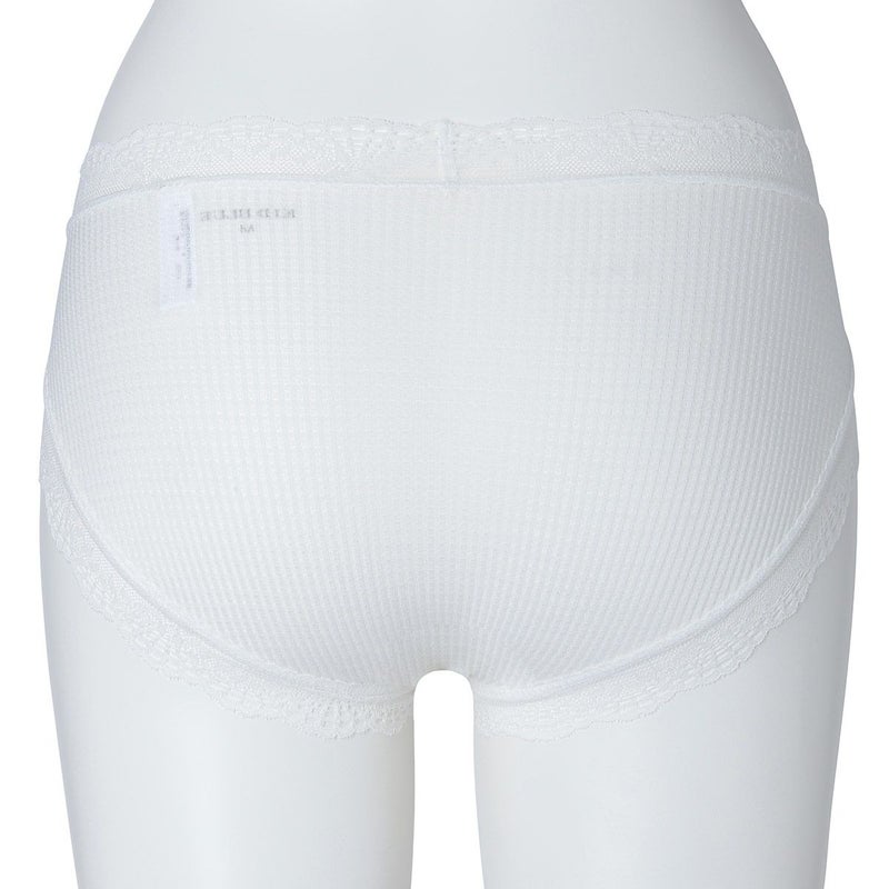 広い脚口で動きやすいノーマルショーツ。ウエストや脚ぐりにレースをたっぷりあしらいかわいらしさをプラス。プチリボンもカジュアルなボーダーにフェミニンなアクセント。ブランドネームとサイズは生地にプリントしてあるので肌ストレスが少ない仕様。シアー感のある生地が肌に優しくフィットします。