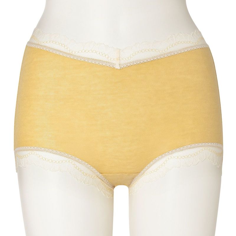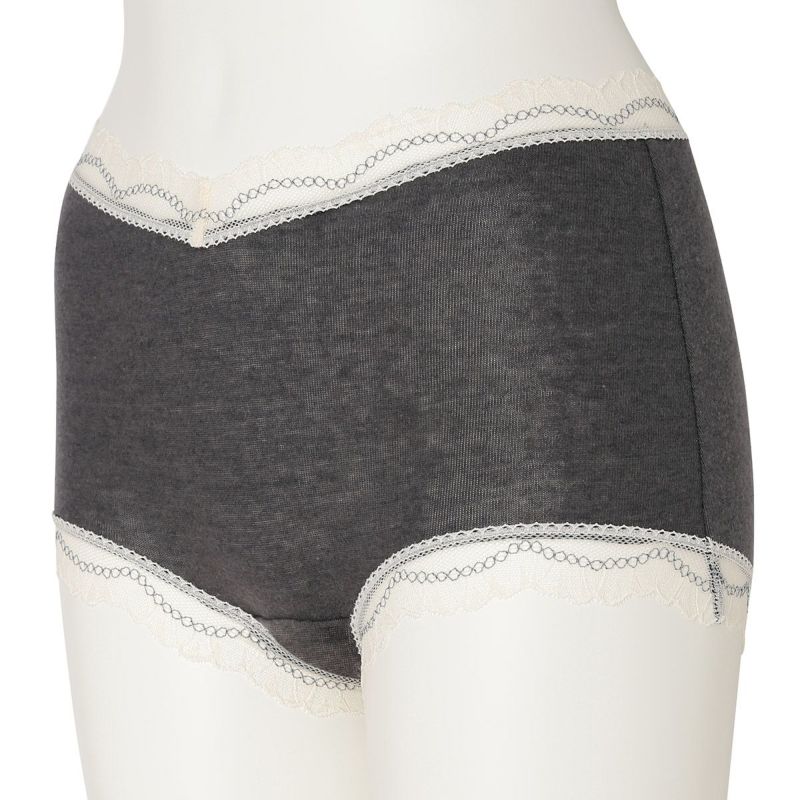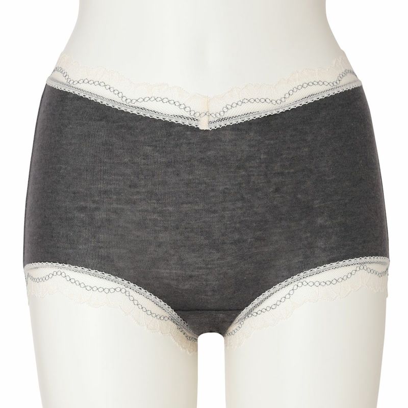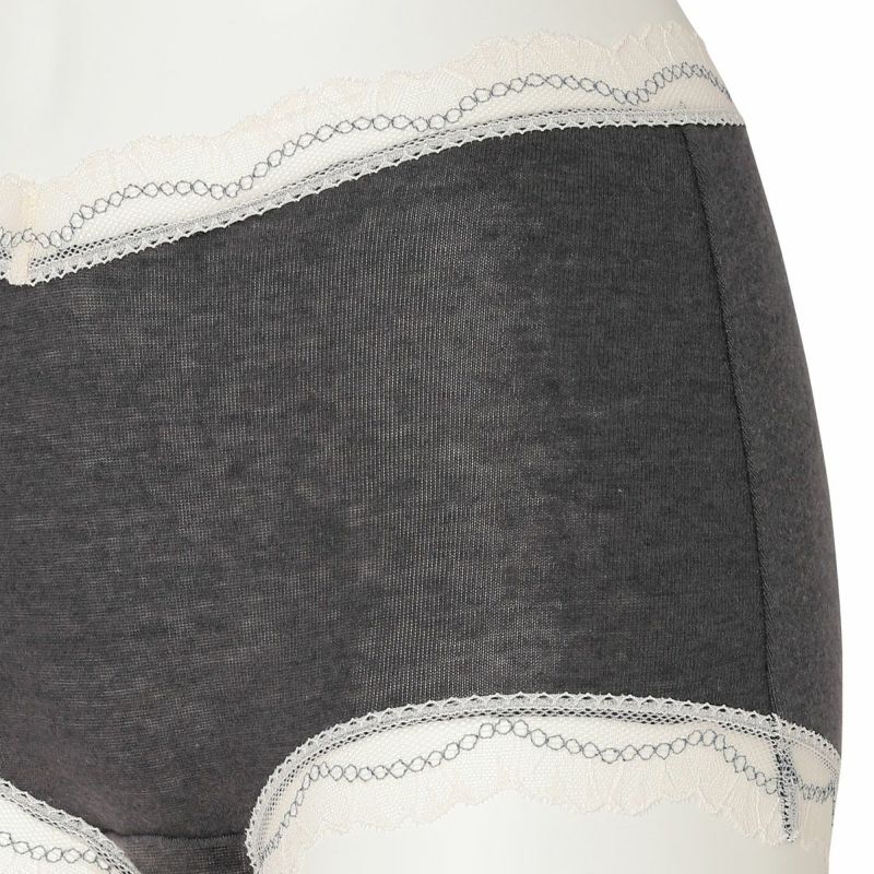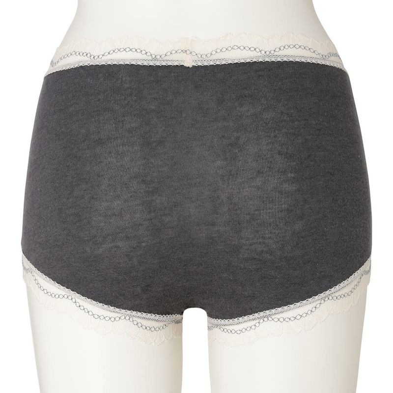 ほどよいウエストの深さとヒップの包み込みが人気のショートカルソン。たっぷり施したウエストと脚口のレースがポイントです。ブランドタグとサイズタグは生地にプリントする仕様にし、肌へ触れるごろつきを軽減。優しい履き心地にこだわりました。