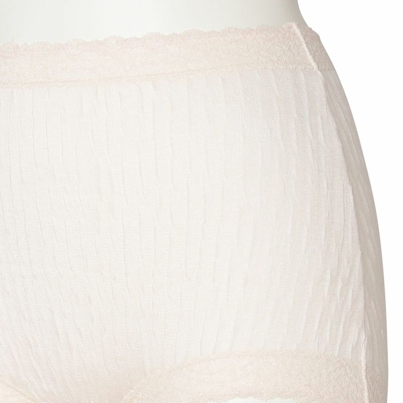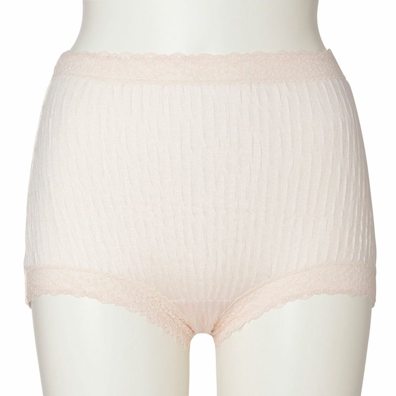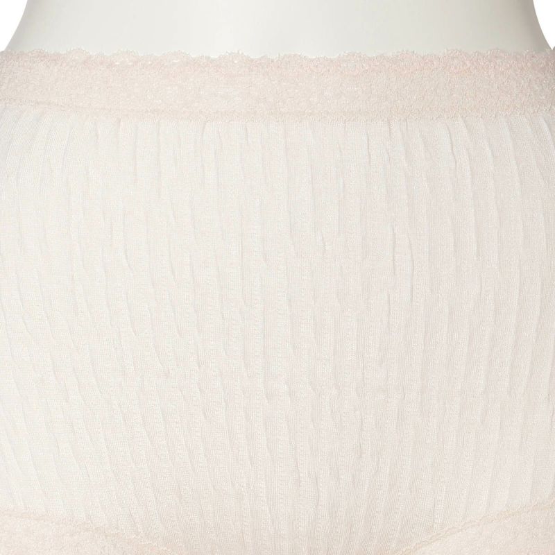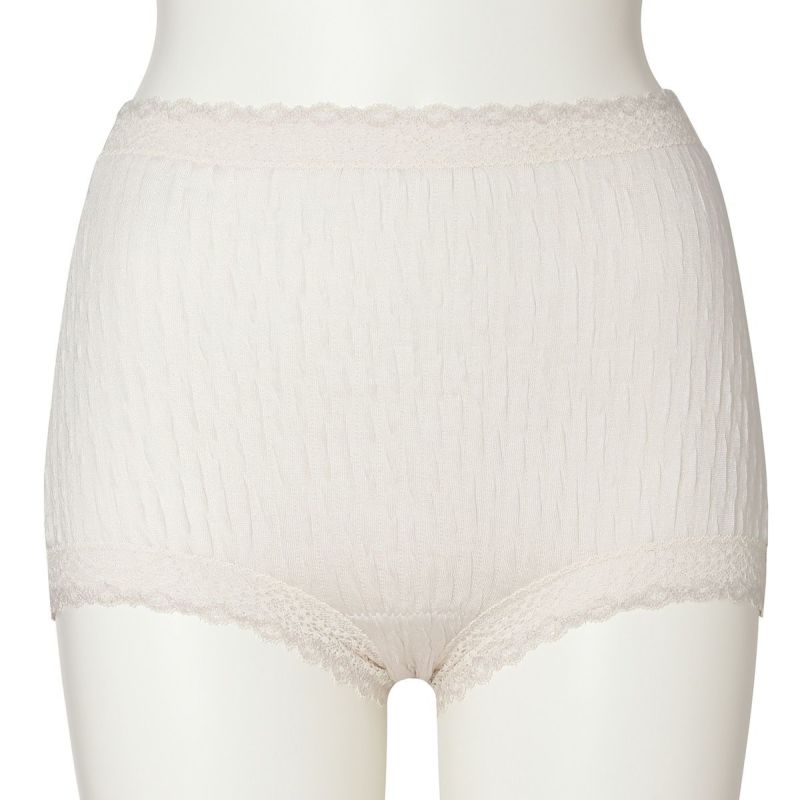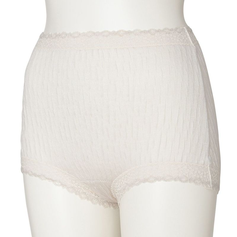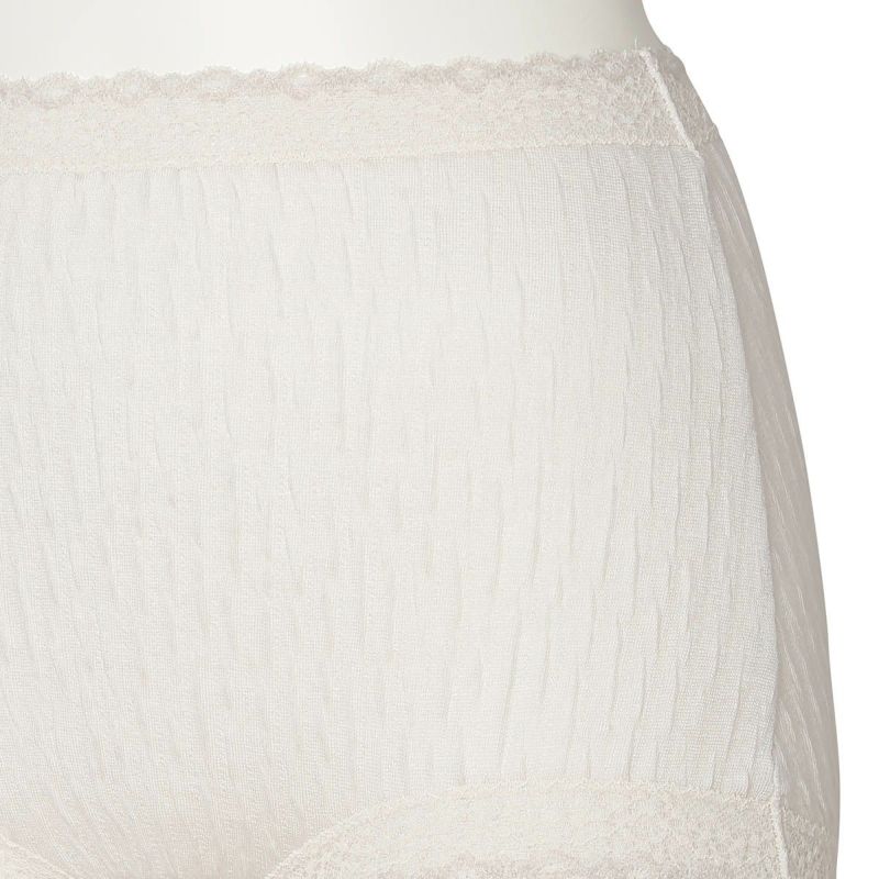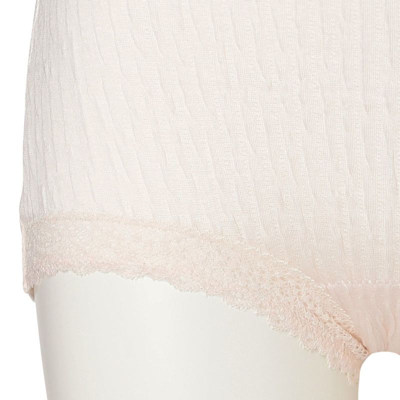 脚ぐりがヒップ下でカットされているのでヒップの包み込みがよく安定感のある履き心地が人気のショートカルソン。ウエスト・裾のレースは生地の上に重ねているのでレースが直接肌に当たらない優しい仕様に。