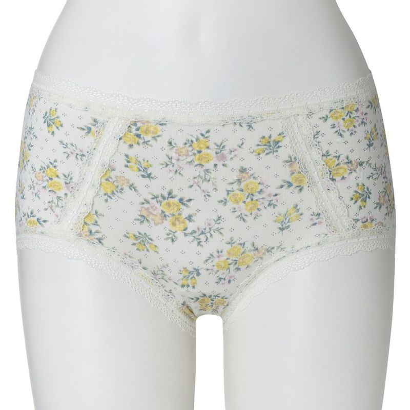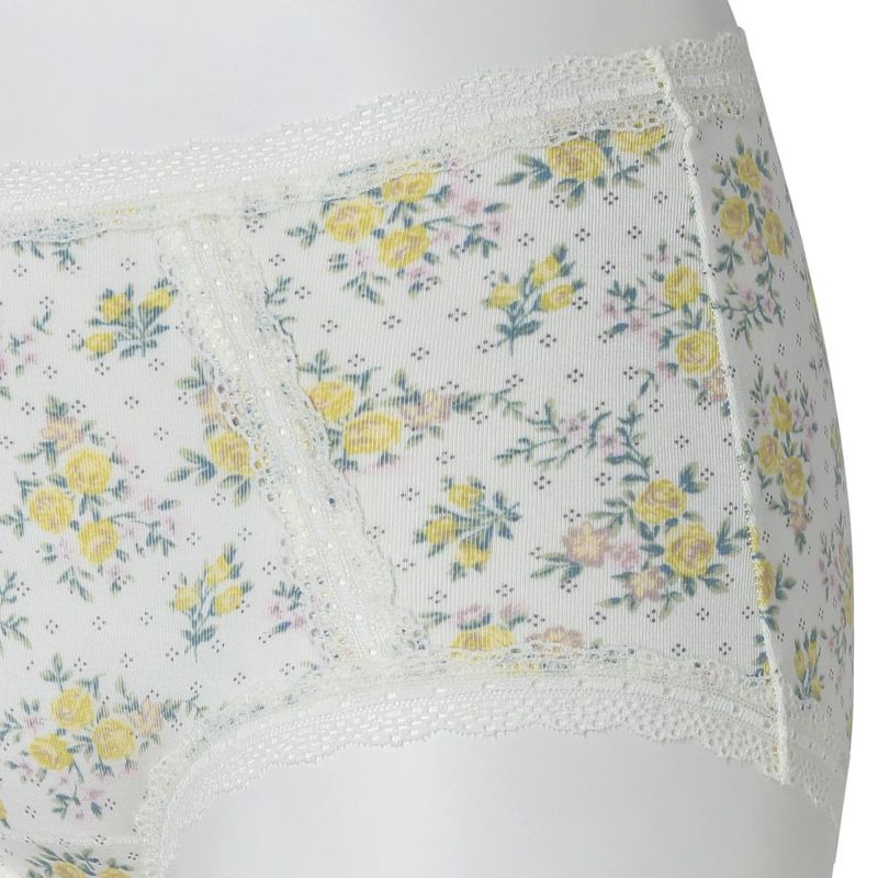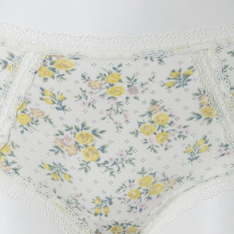 はき込み丈が浅めのヒップハンガーショートカルソン。フロントの透かしたレースが手の込んだポイント。ブランドネームとサイズは生地にプリントしてあるので肌ストレスの少ない仕様。