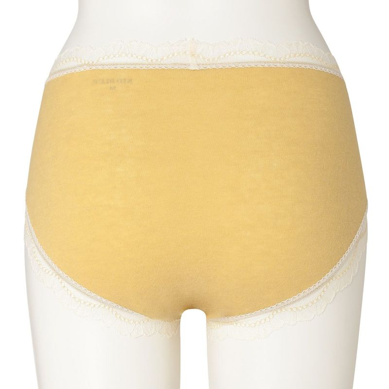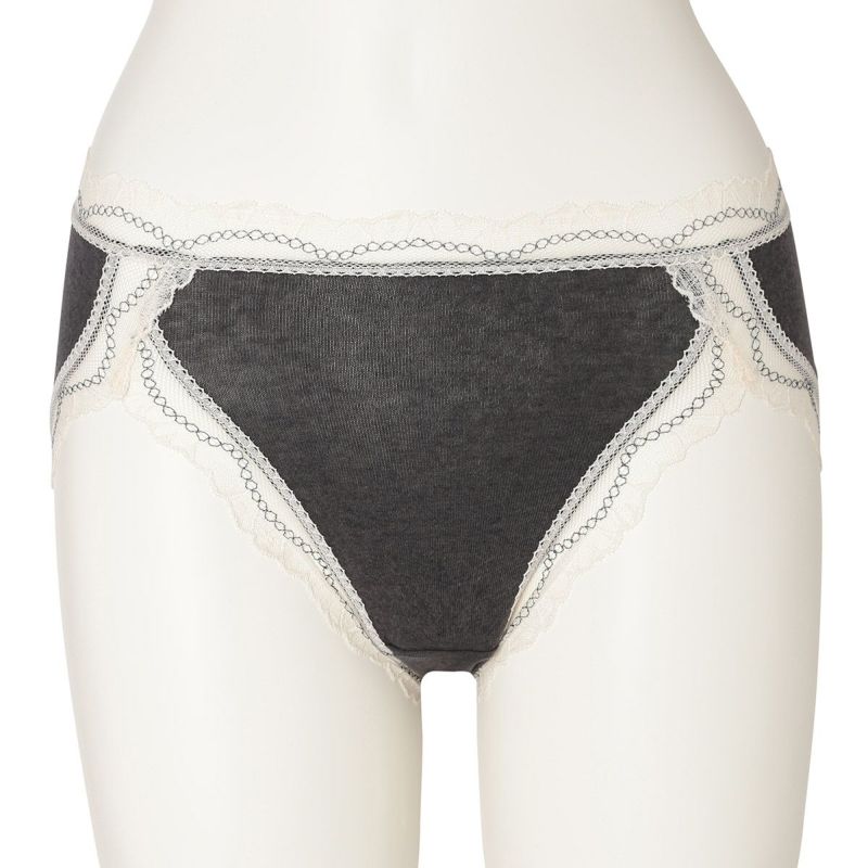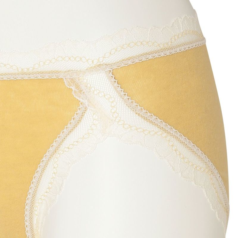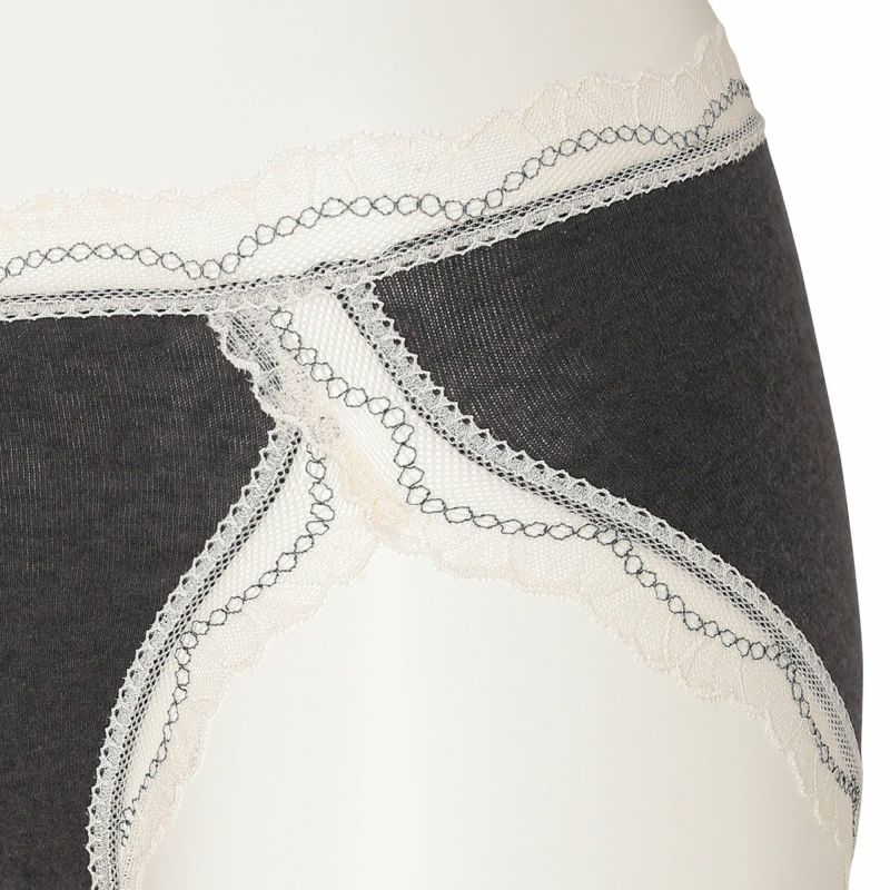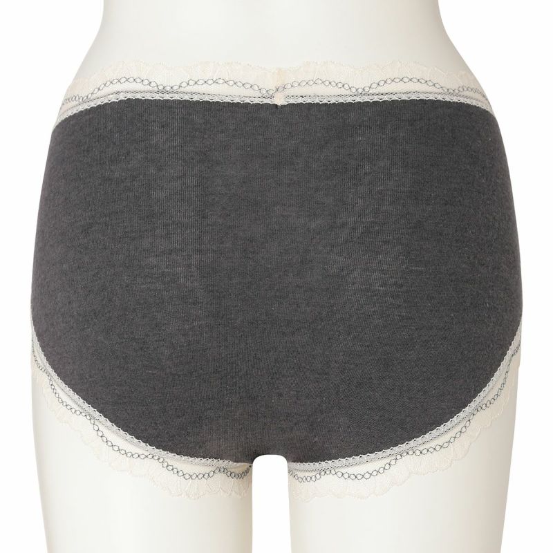 たっぷり施した配色レースがかわいらしいノーマルショーツ。鼠径部に沿った足ぐりのデザインは動きやすい。ブランドタグとサイズタグは生地にプリントする仕様にし、肌へ触れるごろつきを軽減。優しい履き心地にこだわりました。