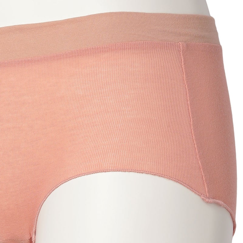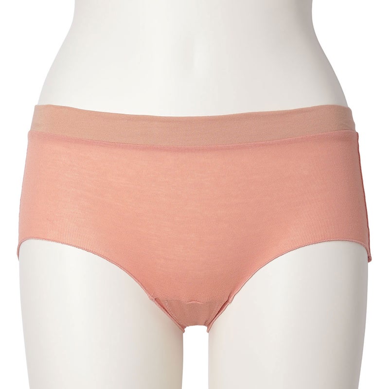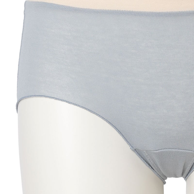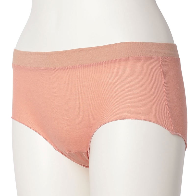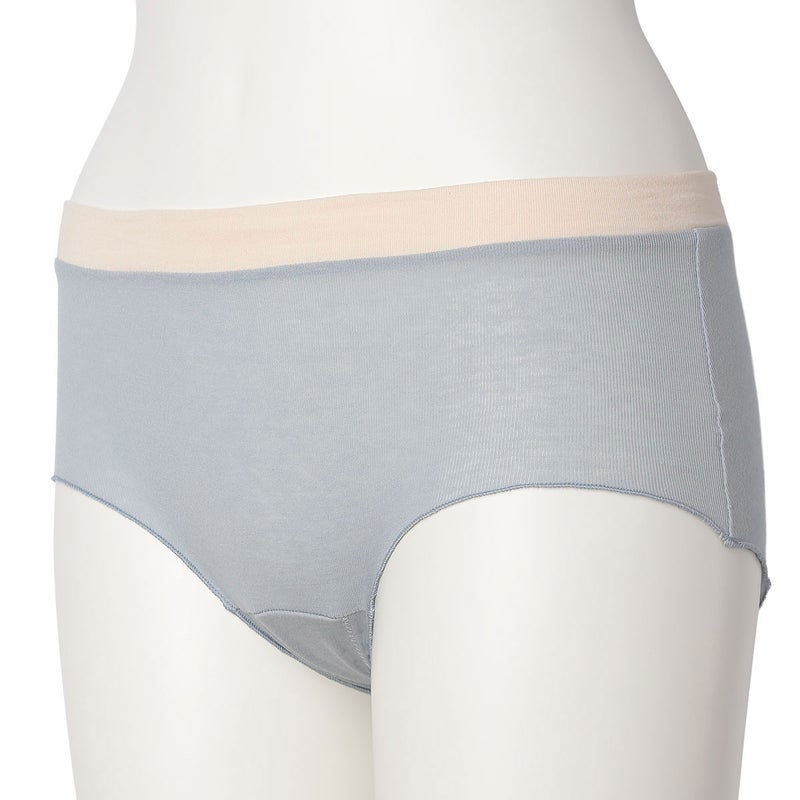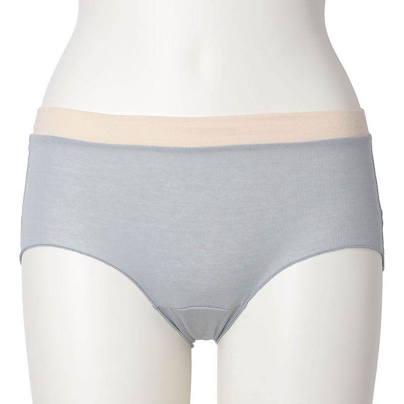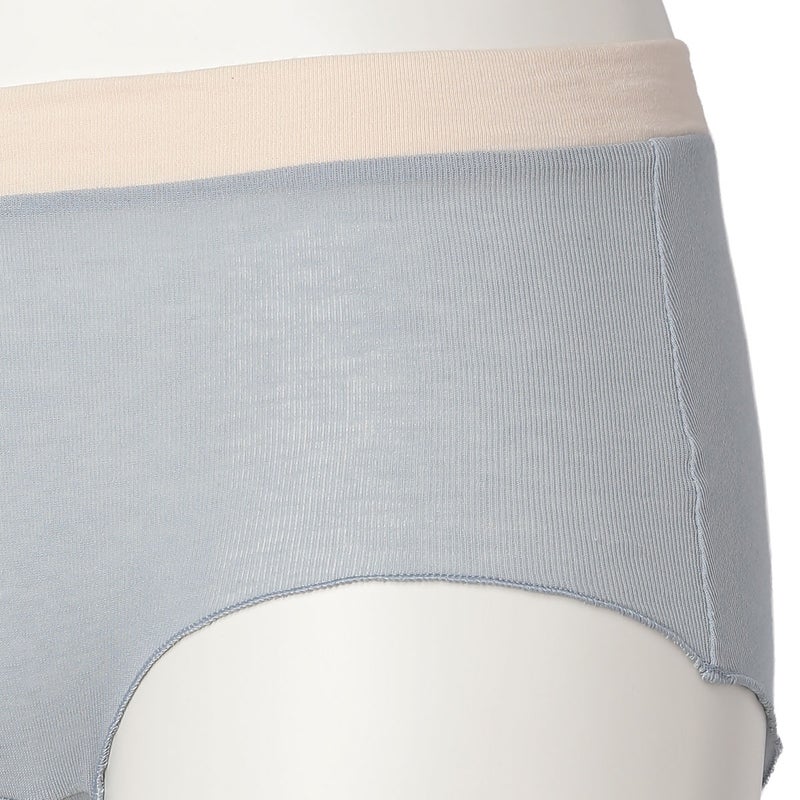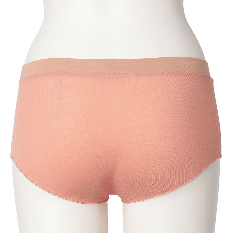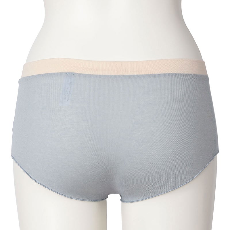 脚口にゴムやストレッチレースを使用していない新しいデザインのヒップハンガーショートカルソン。脚口をメロー仕立てにし締め付けがなくやさしいフィット感。ブランドネームとサイズ表示は生地にプリント、取り扱い表示は外しやすいよう2点止めの縫い付けにし肌へのごろつきを軽減。
