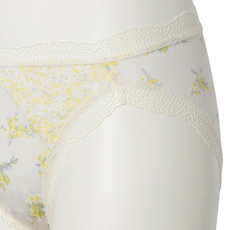 プリントの切り替えデザインにウエスト・脚口にレースをあしらった華やかなノーマルショーツ。ブランドネームとサイズは生地にプリントしてあるので肌ストレスの少ない仕様。