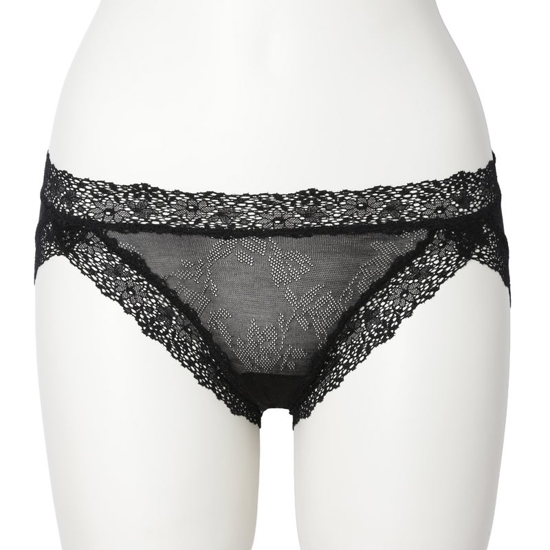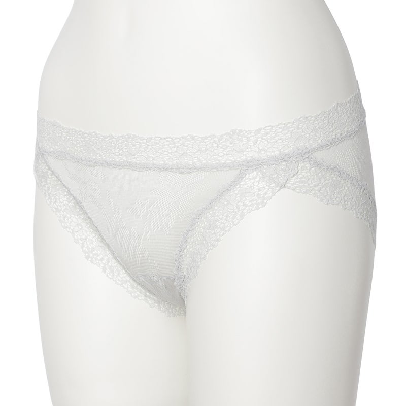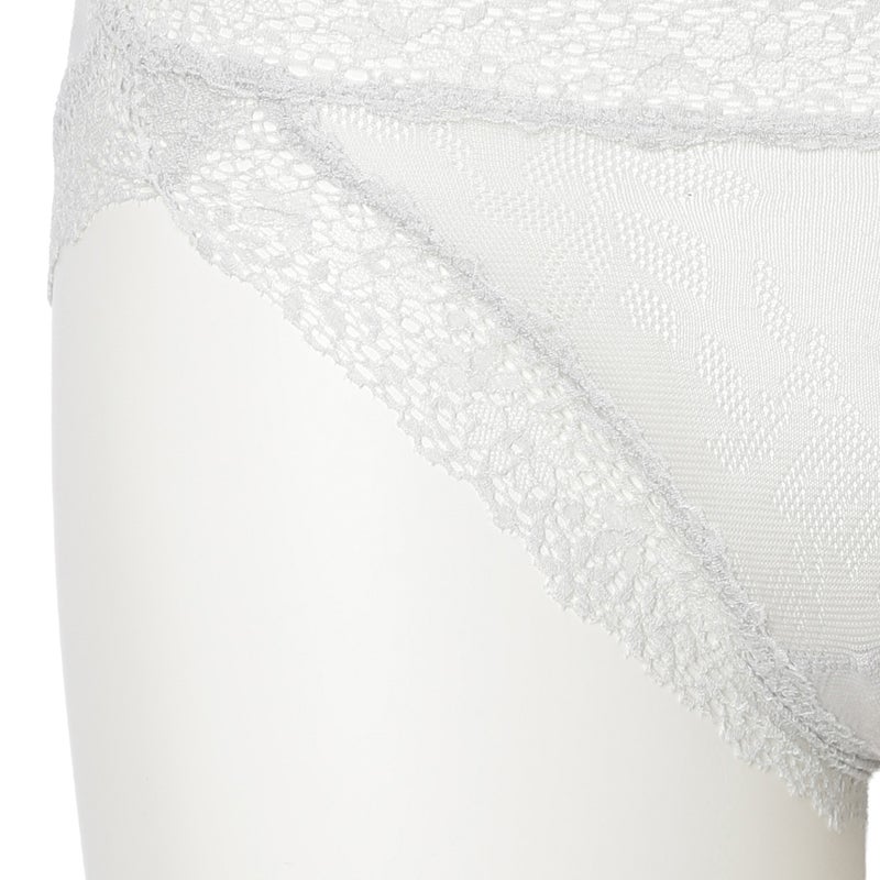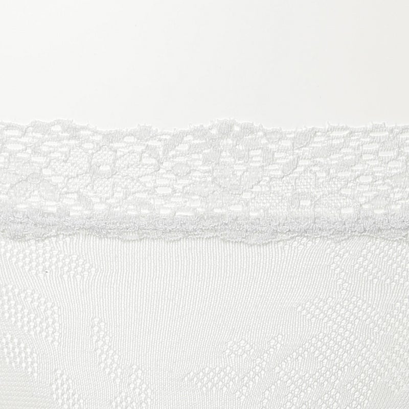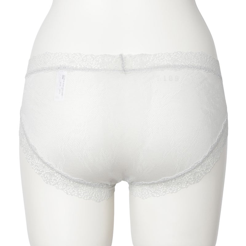 やや太幅の同色花柄レースが華やかなノーマルショーツ。薄くてソフト、べたつきにくい。レースの透け感が軽やか。ゴムを使わずレースのストレッチを活かしているため心地よくフィットします。