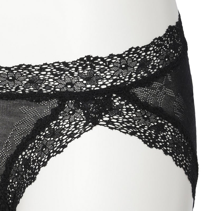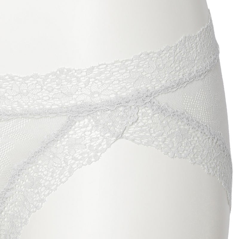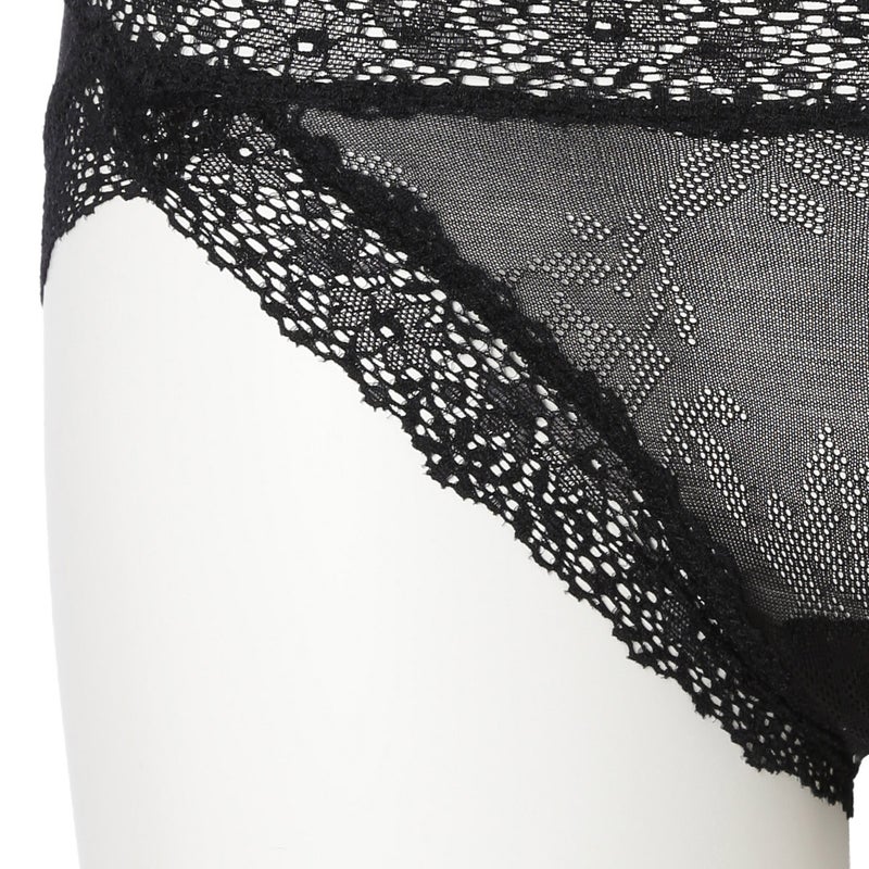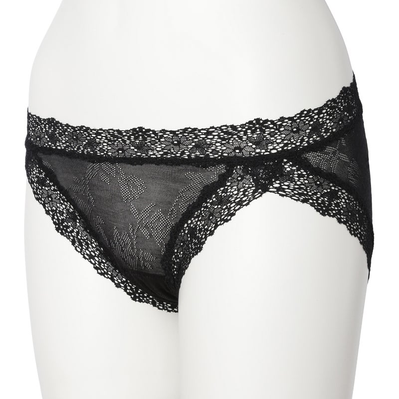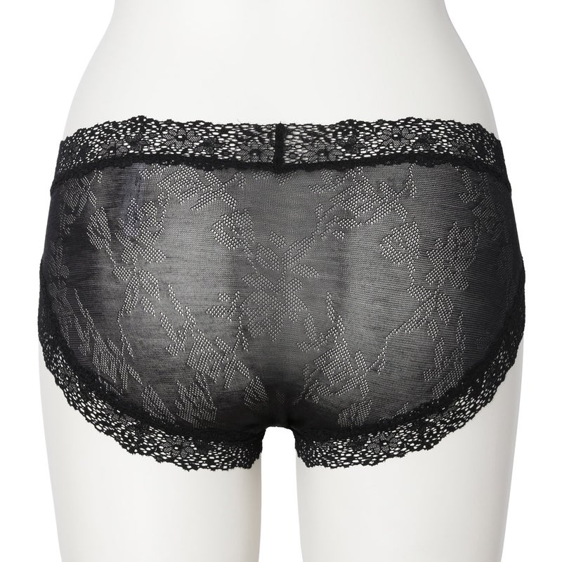 やや太幅の同色花柄レースが華やかなノーマルショーツ。薄くてソフト、べたつきにくい。レースの透け感が軽やか。ゴムを使わずレースのストレッチを活かしているため心地よくフィットします。