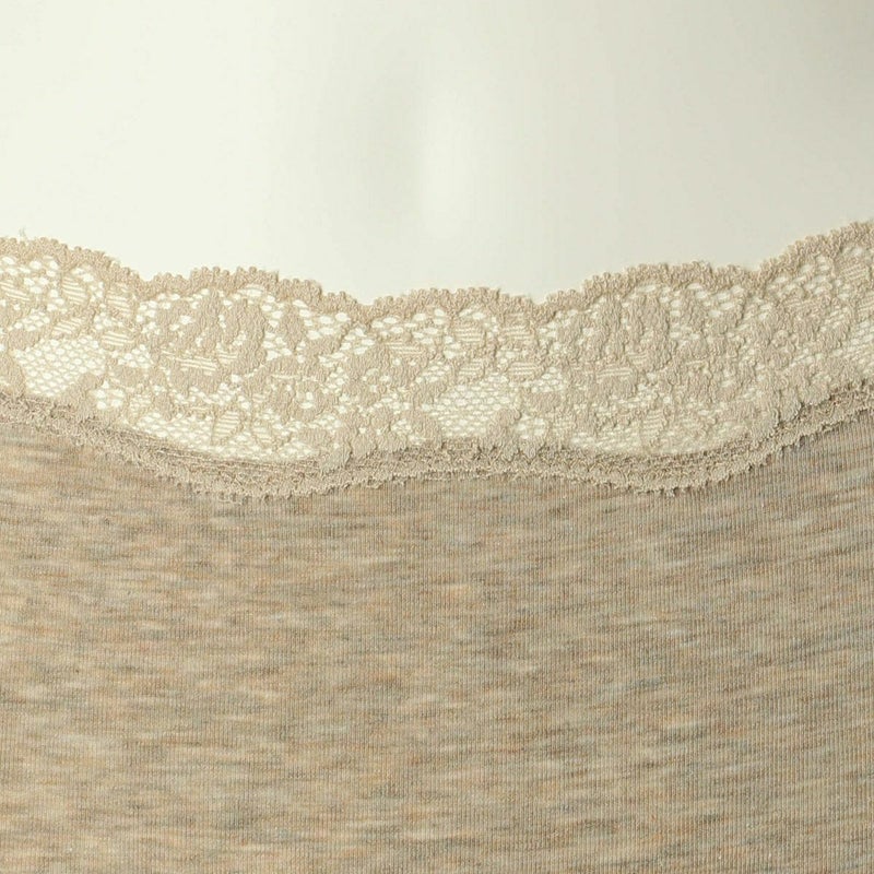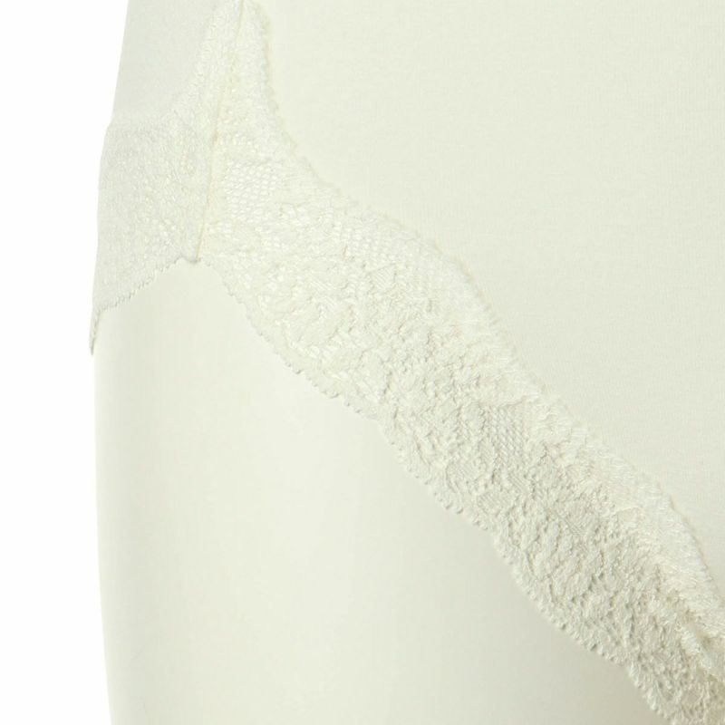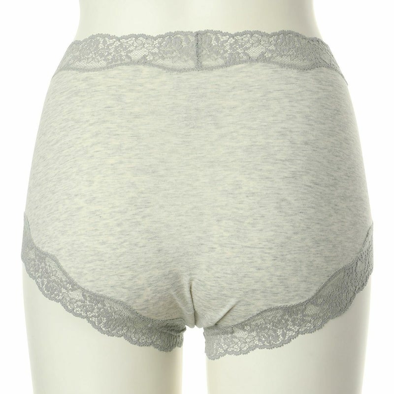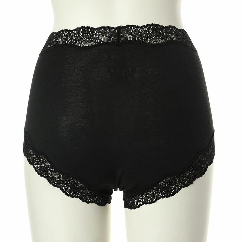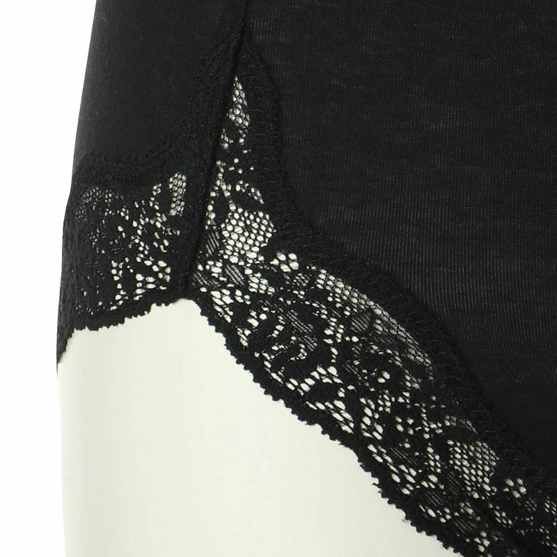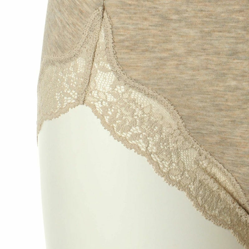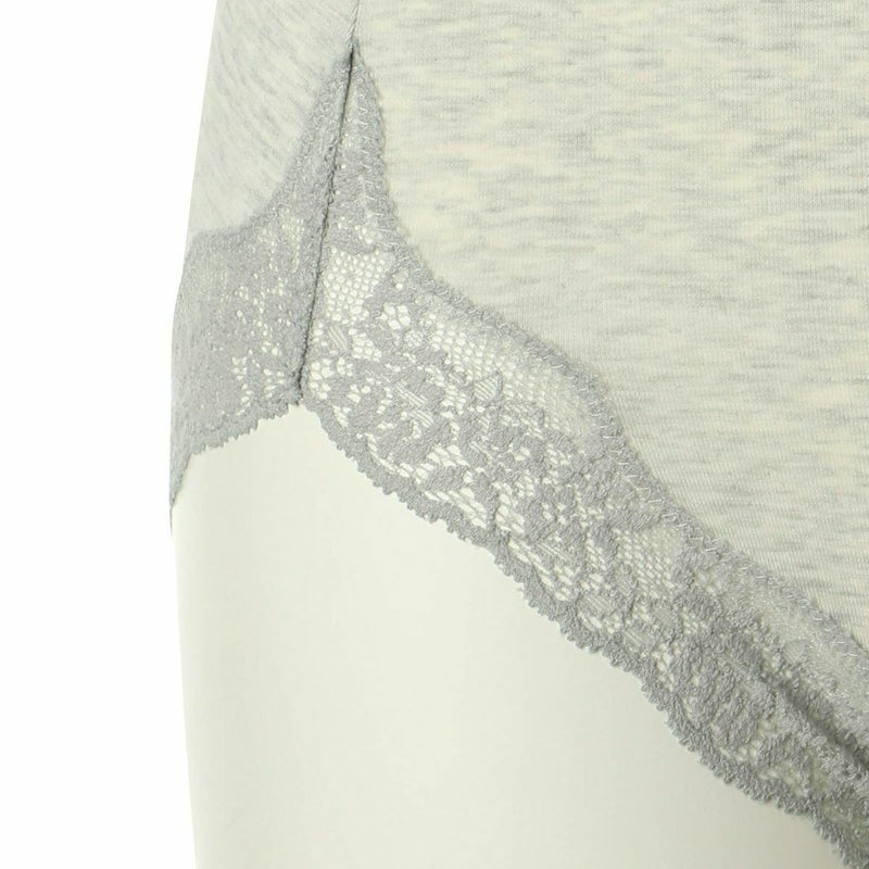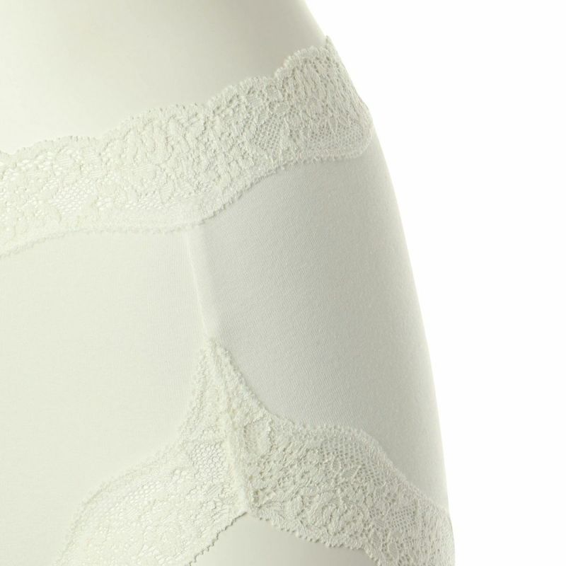 お腹周りをすっぽり包み込むような安心感のある履き心地の深型ショーツ。ウエストはレースで楽な履き心地。脚口は締め付け感のない綿混レース。