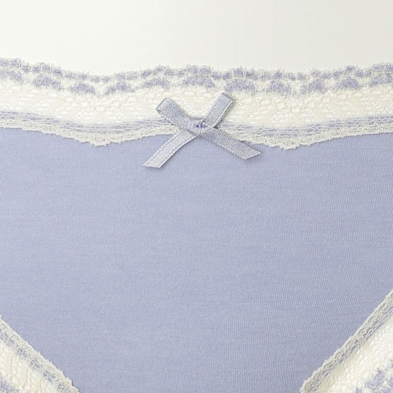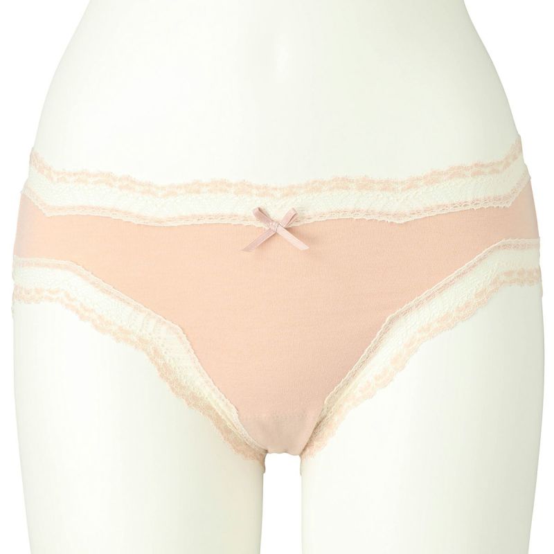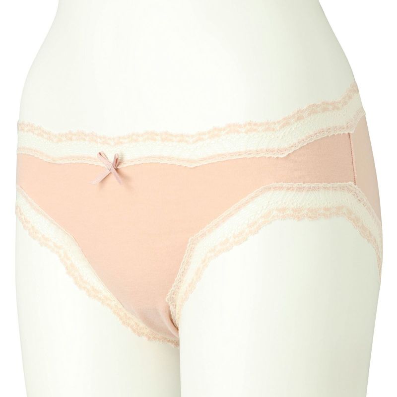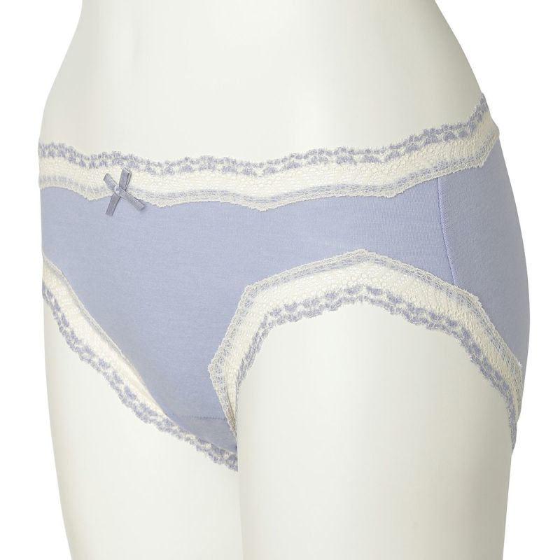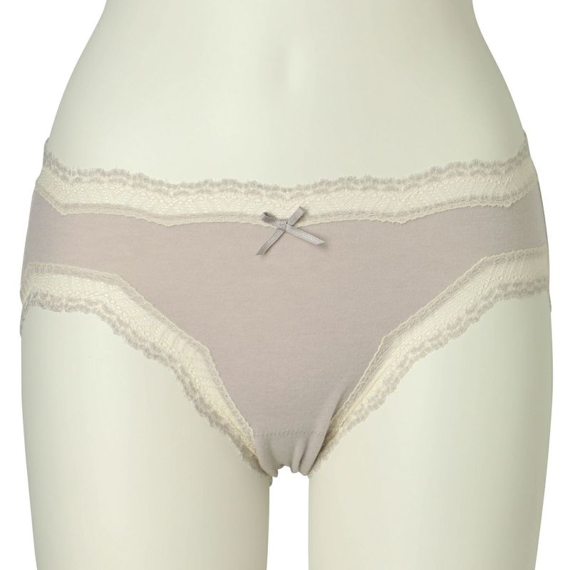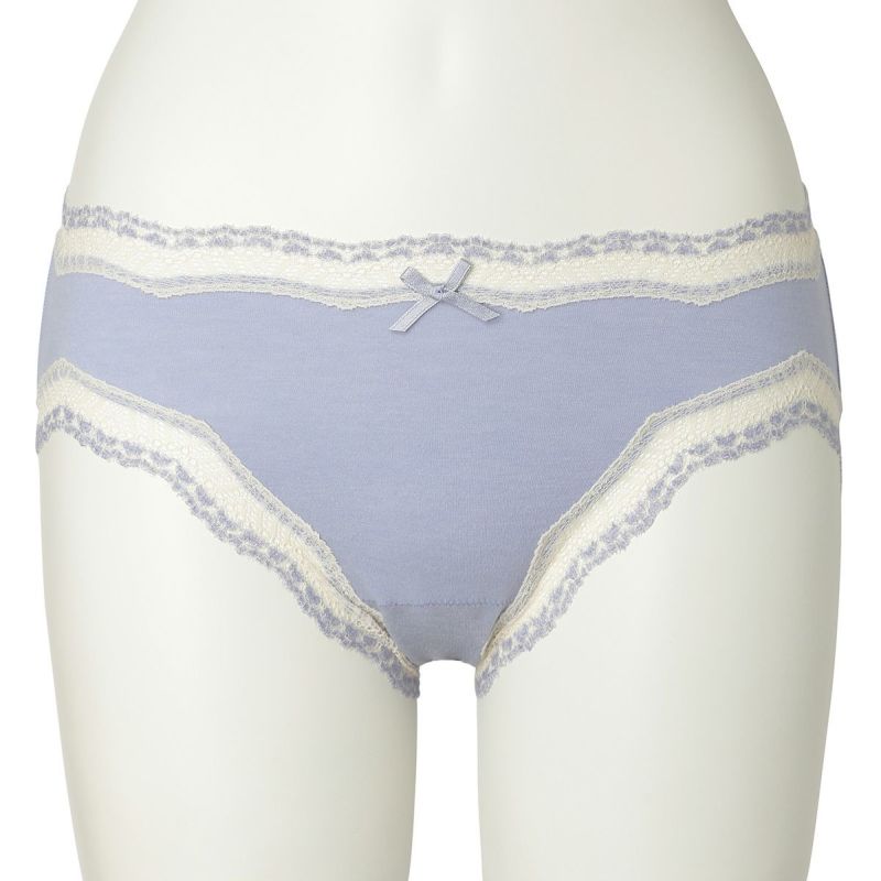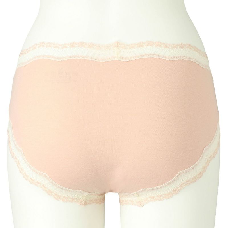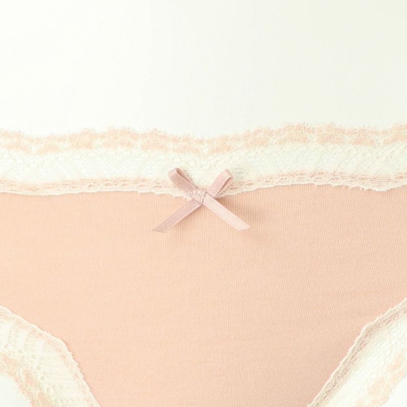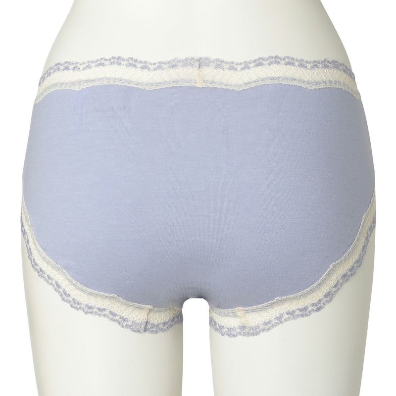 ノーマルショーツは、鼠径部に沿った脚口が広く動きやすい。ウエストはゴムではなくストレッチレースの為、楽な履き心地。フロントのリボンがワンポイント。ブランドネーム・サイズは生地にプリントしてあるので肌ストレスの少ない仕様。
