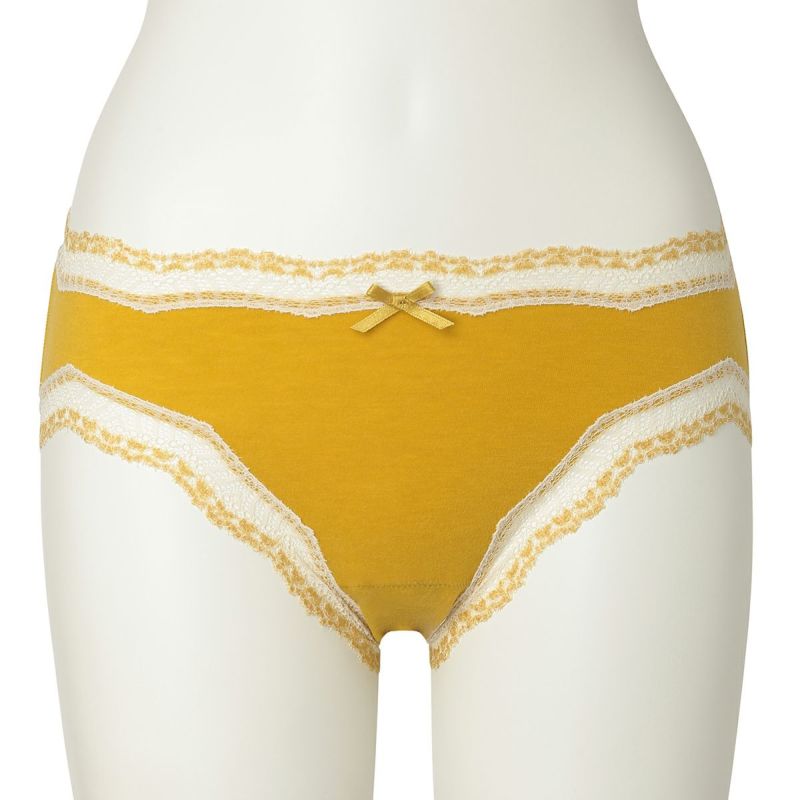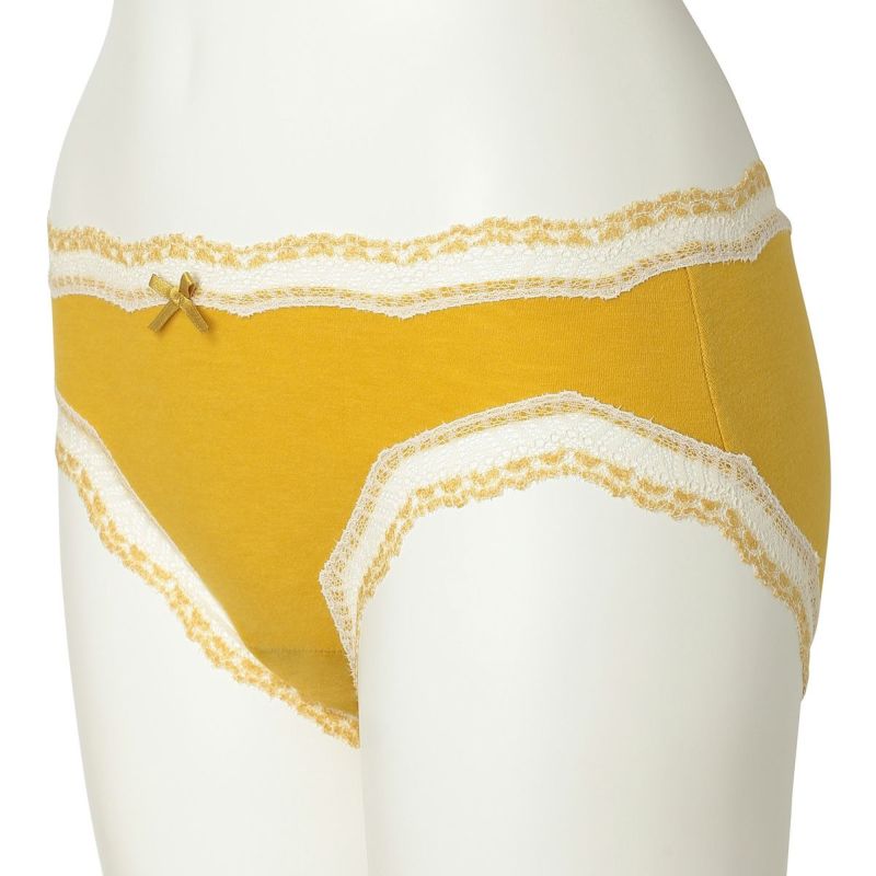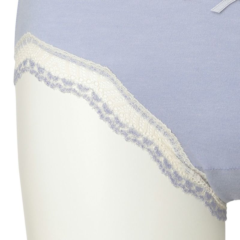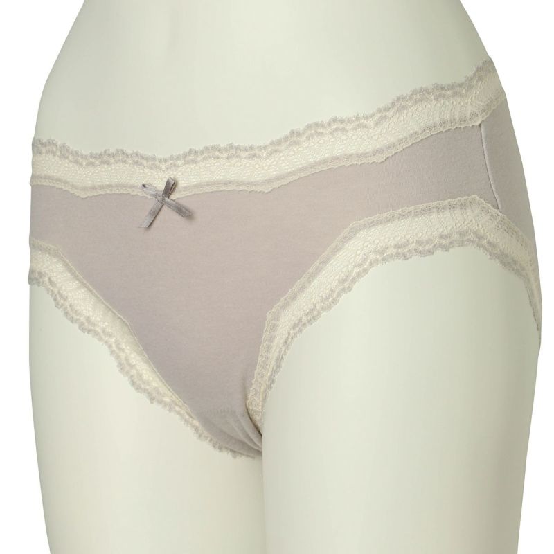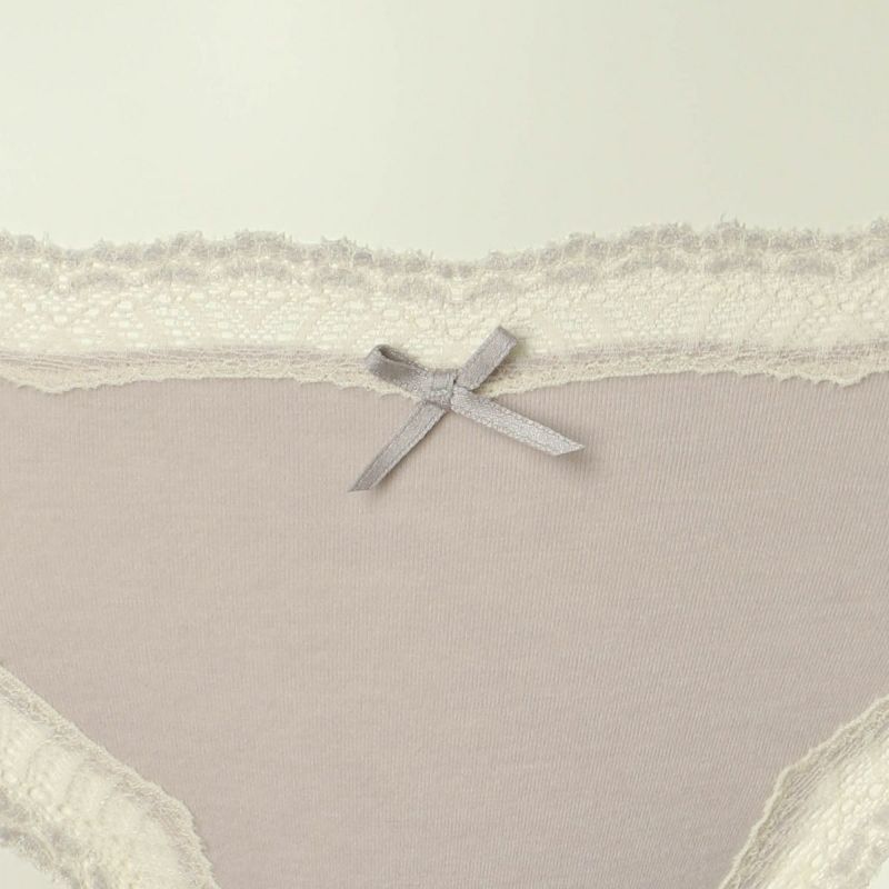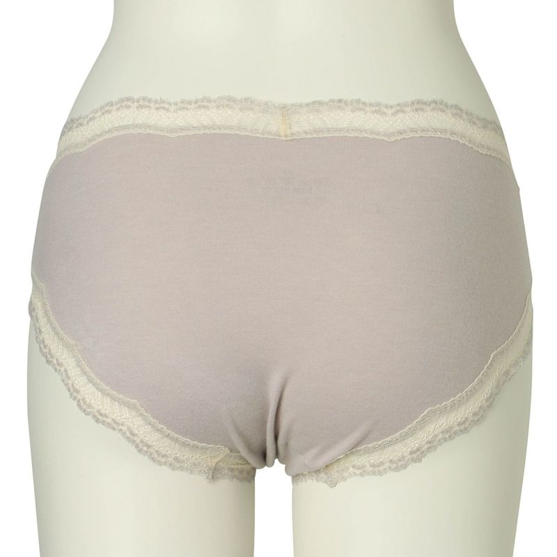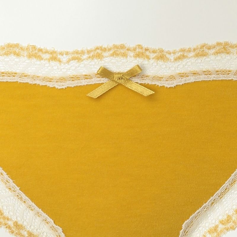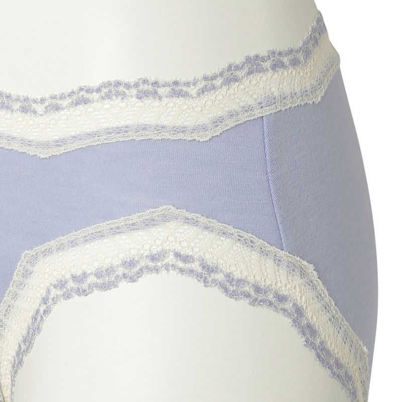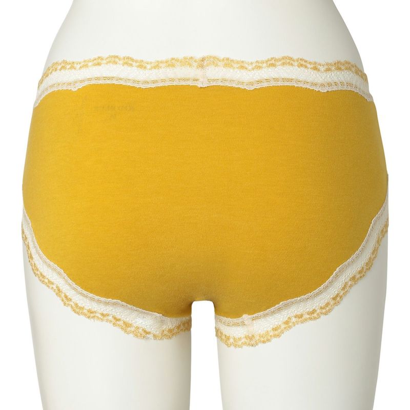 ノーマルショーツは、鼠径部に沿った脚口が広く動きやすい。ウエストはゴムではなくストレッチレースの為、楽な履き心地。フロントのリボンがワンポイント。ブランドネーム・サイズは生地にプリントしてあるので肌ストレスの少ない仕様。