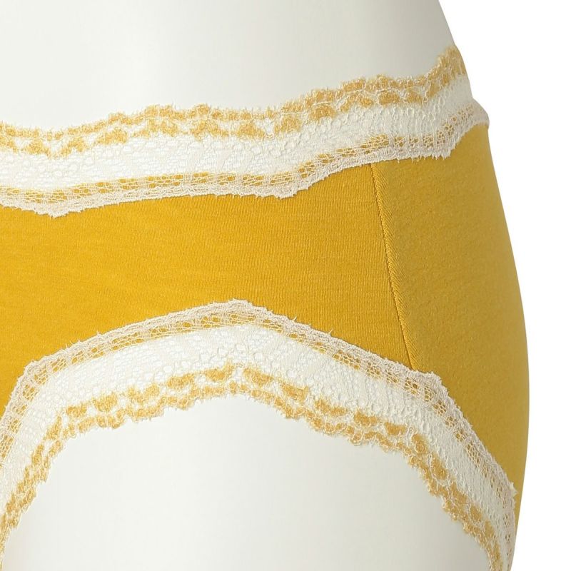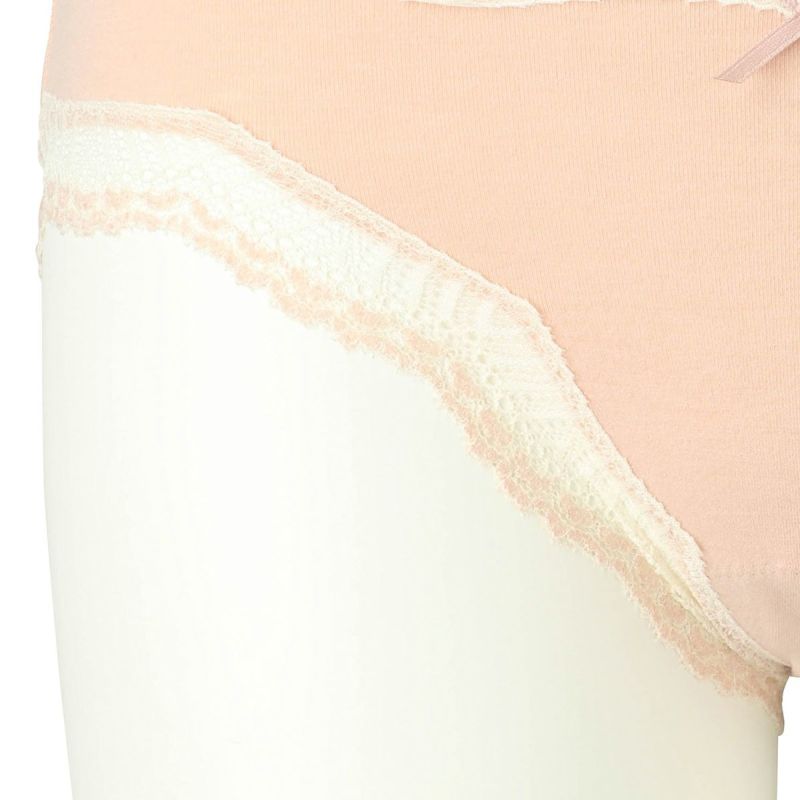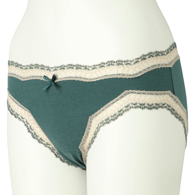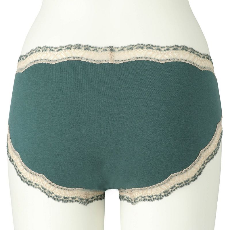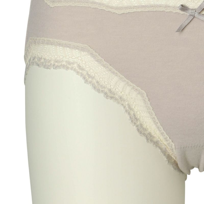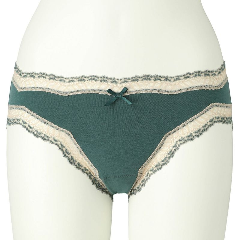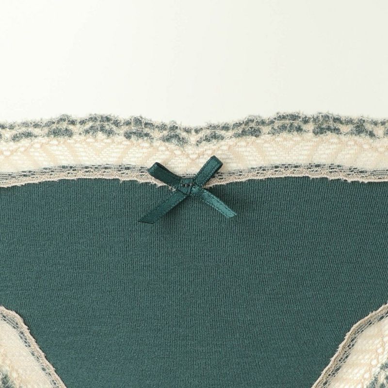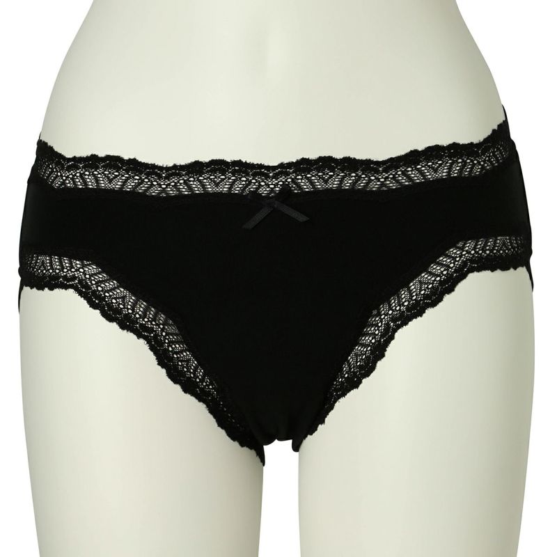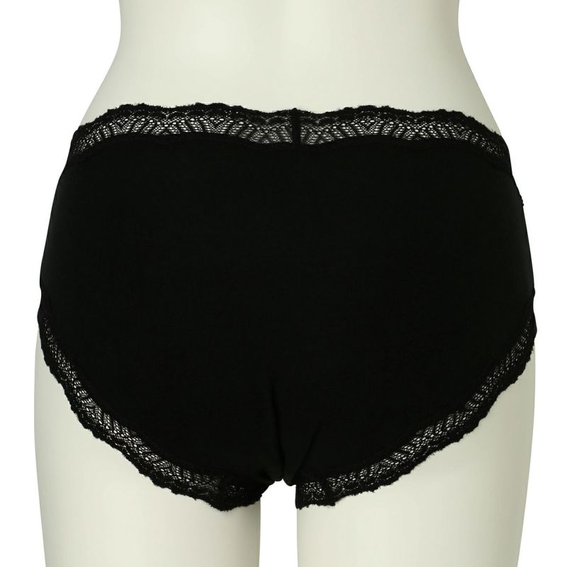 ノーマルショーツは、鼠径部に沿った脚口が広く動きやすい。ウエストはゴムではなくストレッチレースの為、楽な履き心地。フロントのリボンがワンポイント。ブランドネーム・サイズは生地にプリントしてあるので肌ストレスの少ない仕様。