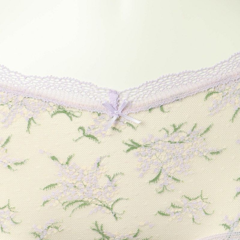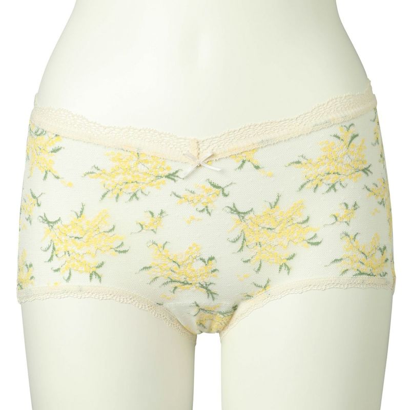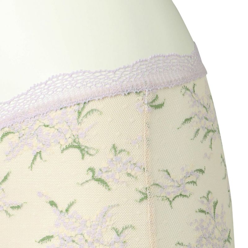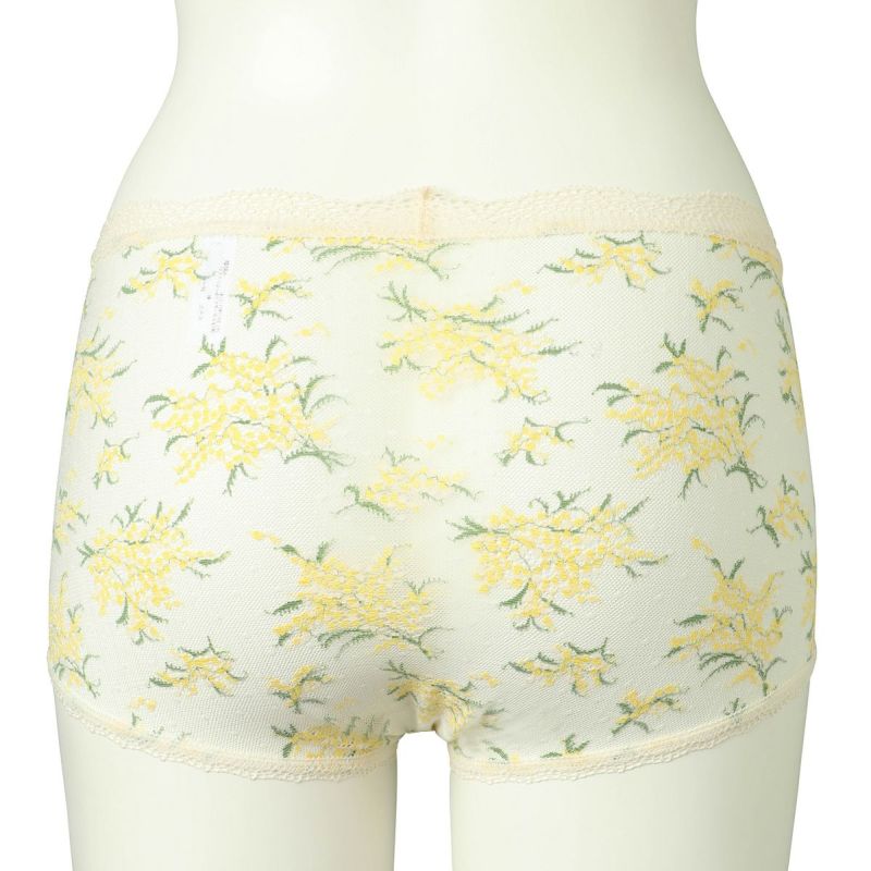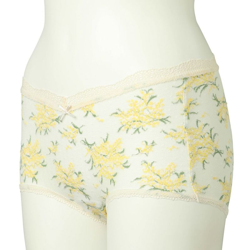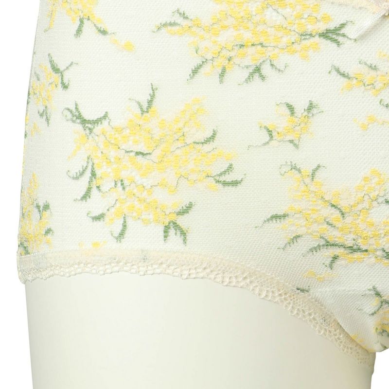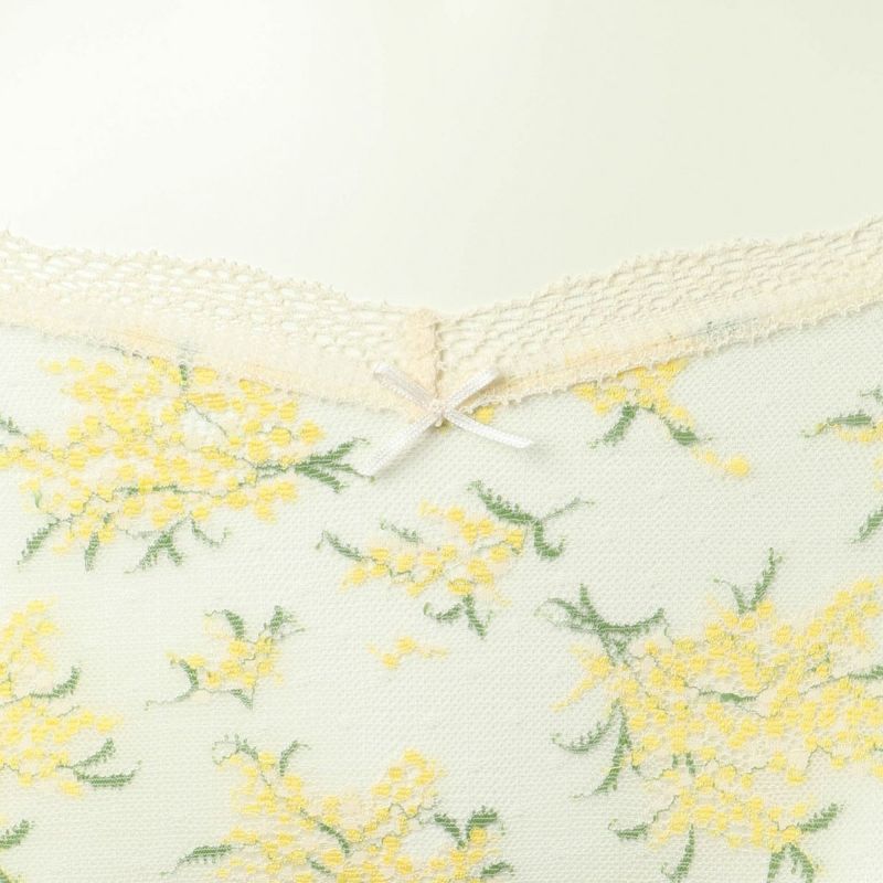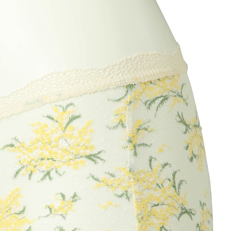 上品で華やかな人気のミモザレース柄が復刻。生地の一部にリサイクルナイロンを使用しよりサステナブルにブラッシュアップしたインナーシリーズ。先染めと後染めを使い分け、柄に立体感を出しました。