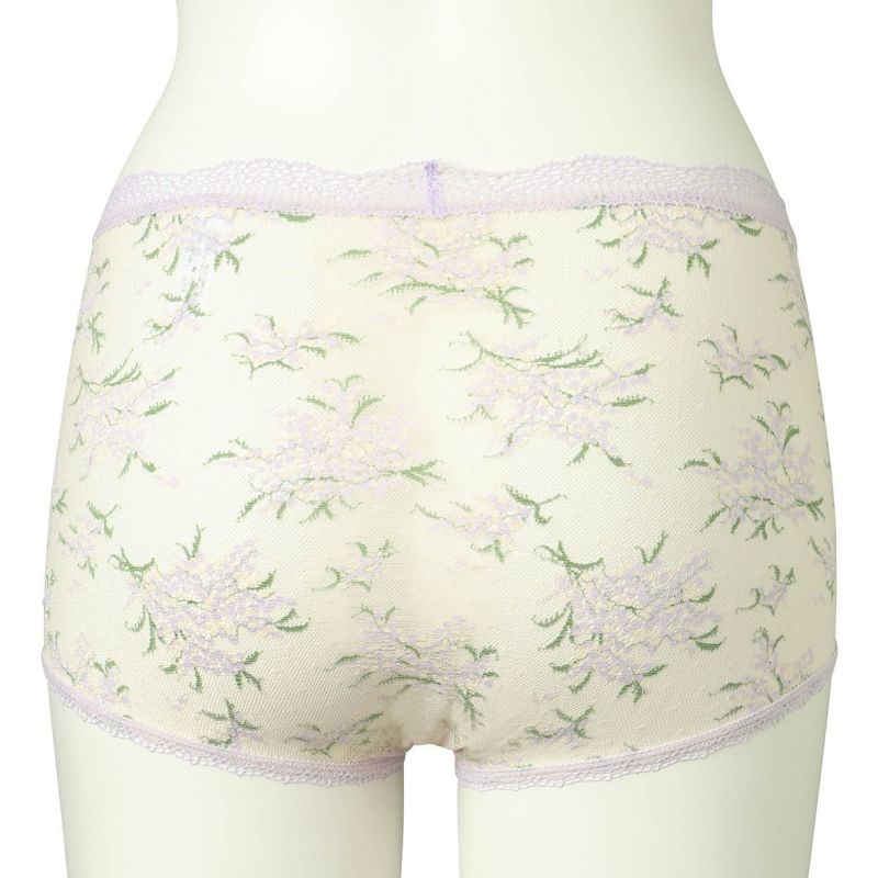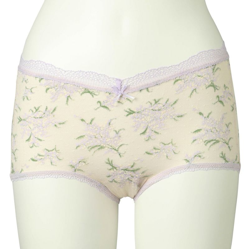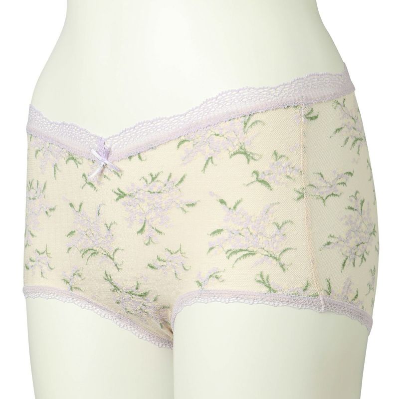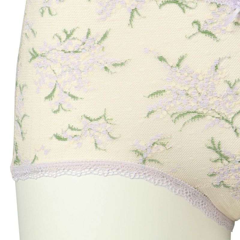 総レースのショートカルソンは、やや深めの履き込み。締め付けの少ないV字のウエスト。前身頃はレースに薄手のパワーネットを重ね付けした、透け防止仕様。