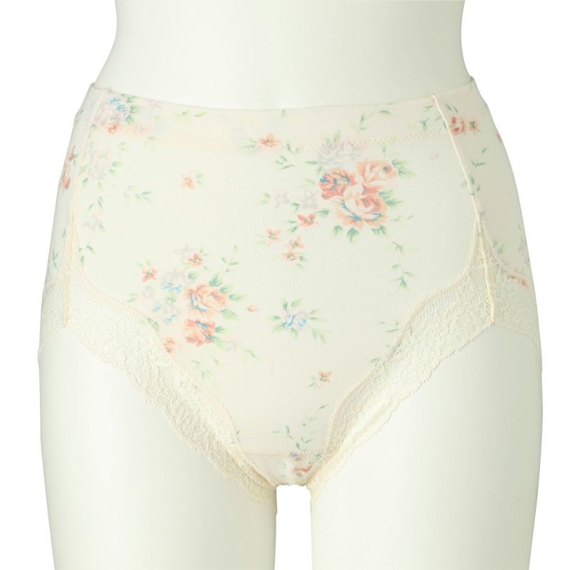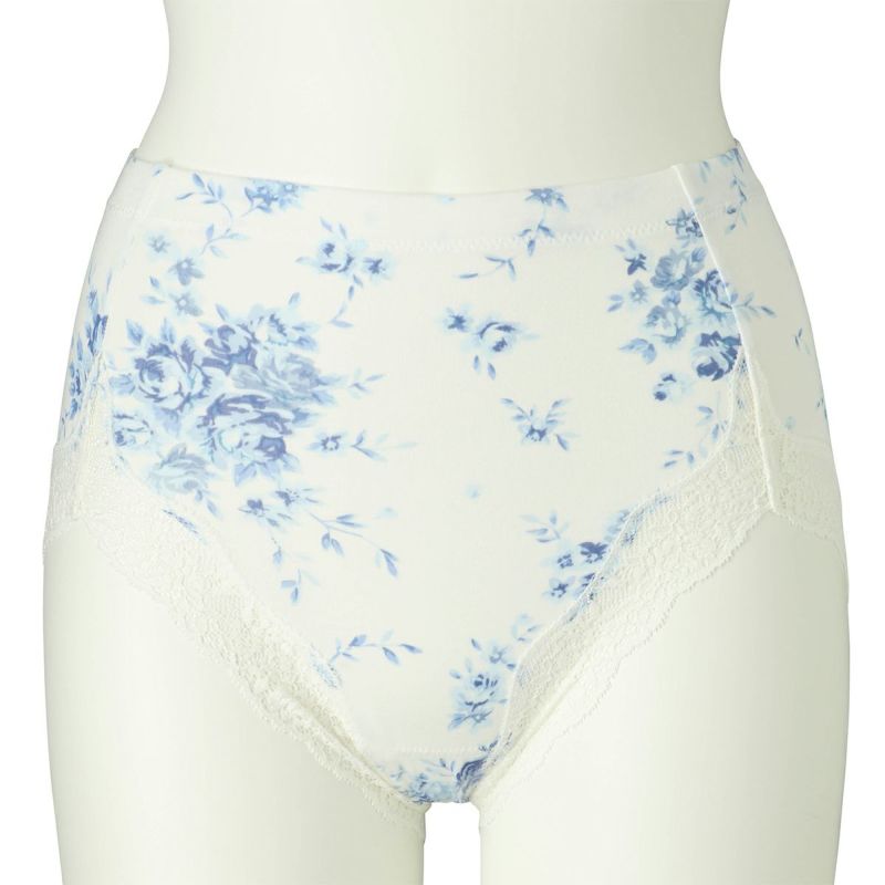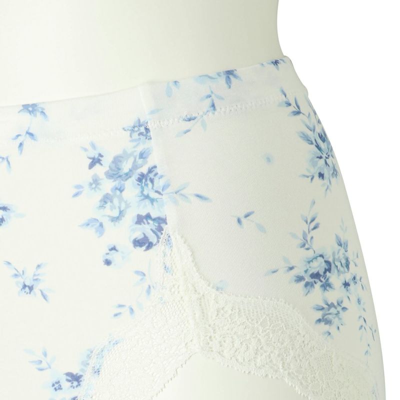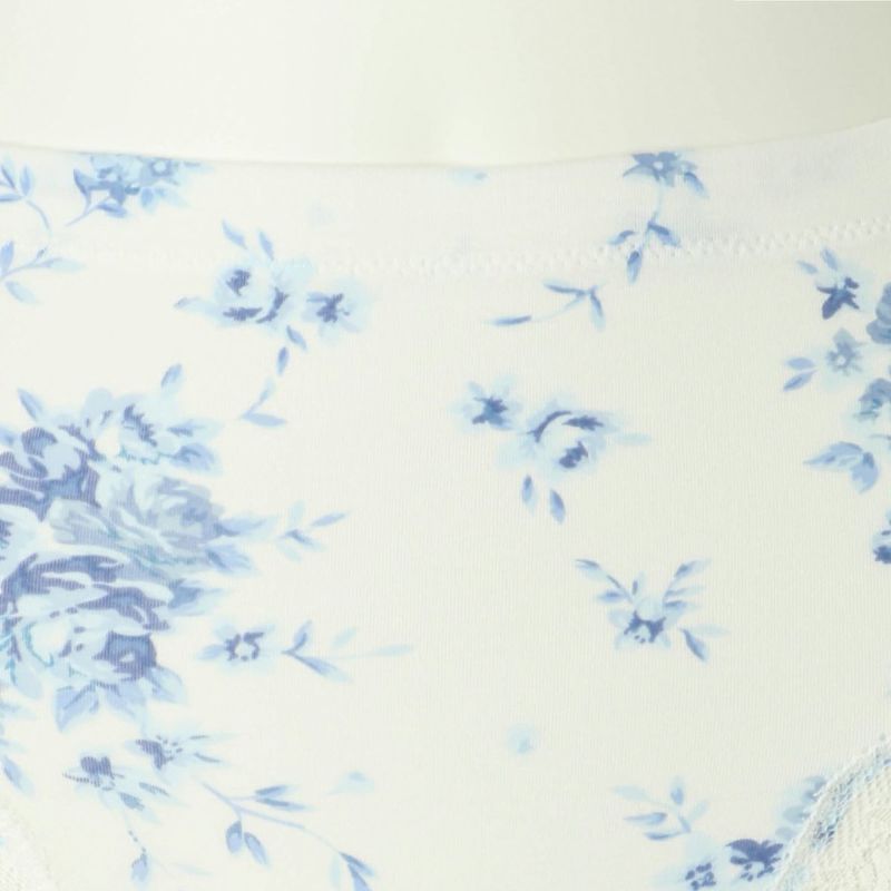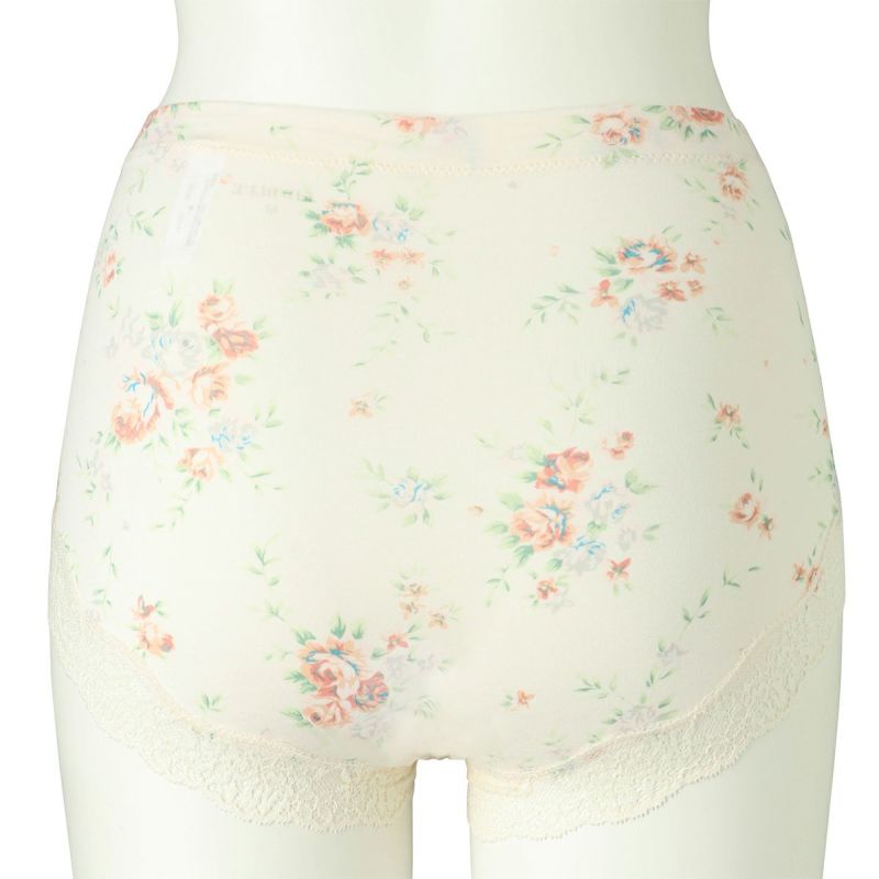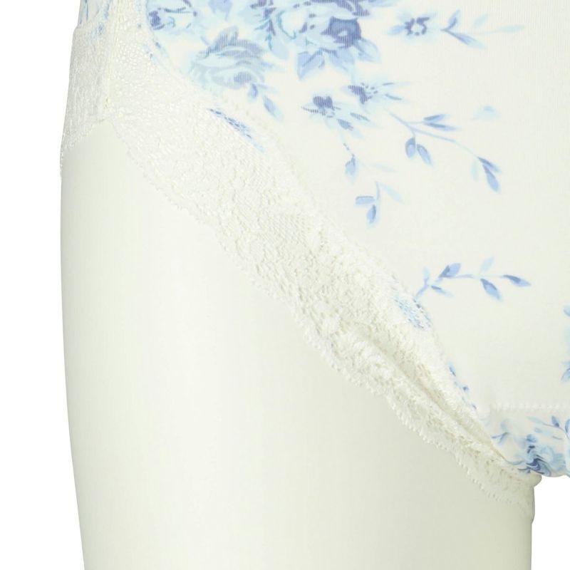 お腹周りをすっぽり包み込むような安心感のある履き心地の深型ショーツ。ウエストはゴムではなく身生地にパワーネットを挟んでいるのでソフトにフィット。身生地を折り返し柄が際立つ仕様に。脚口は締め付け感のない綿混レース。