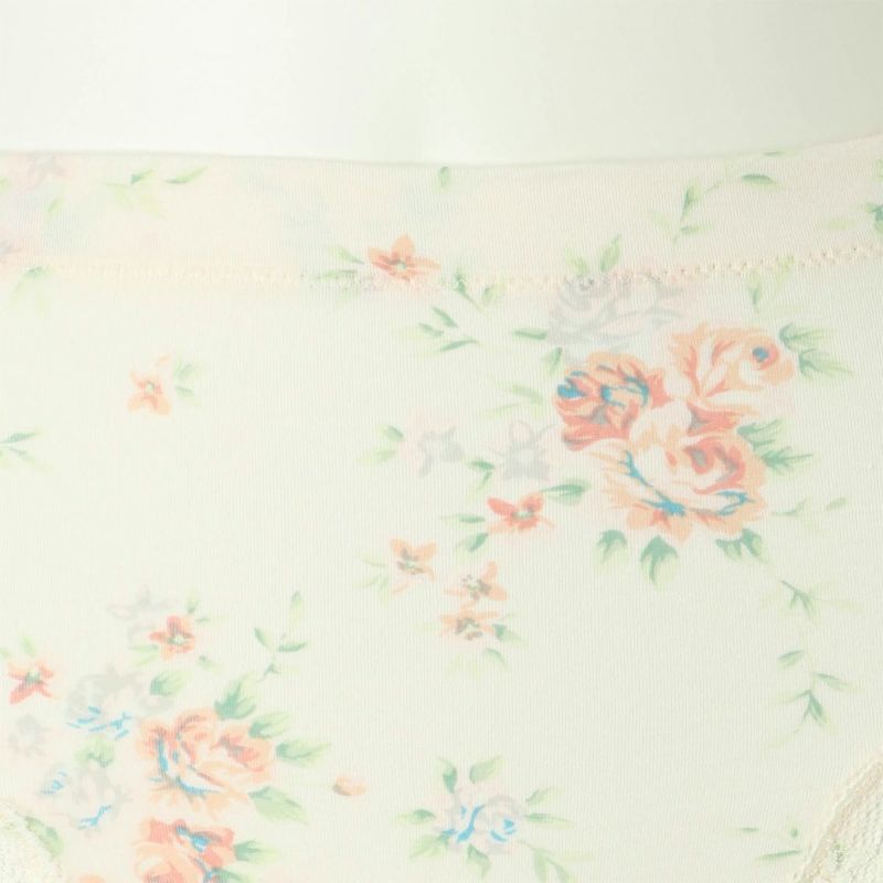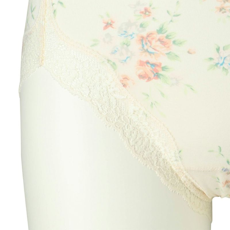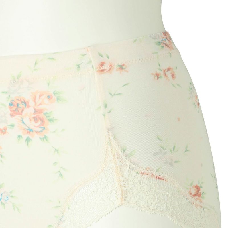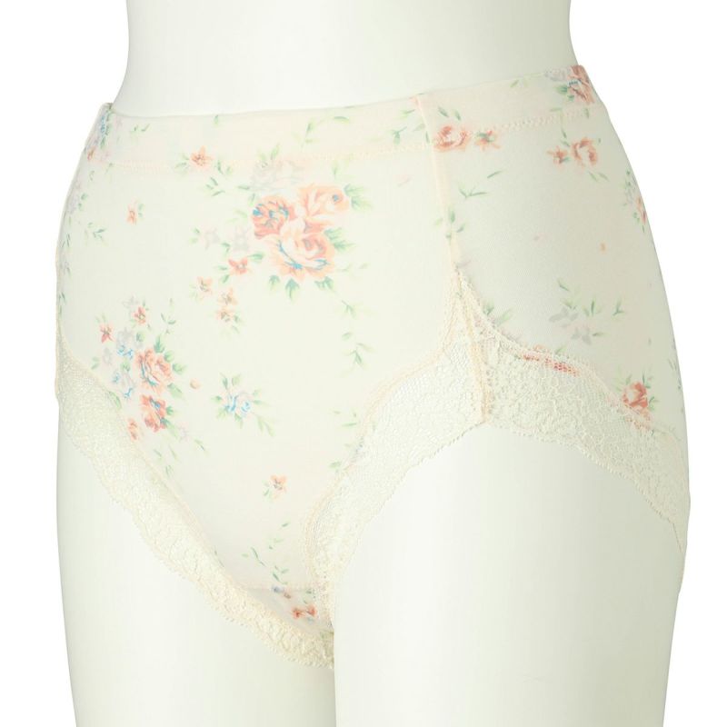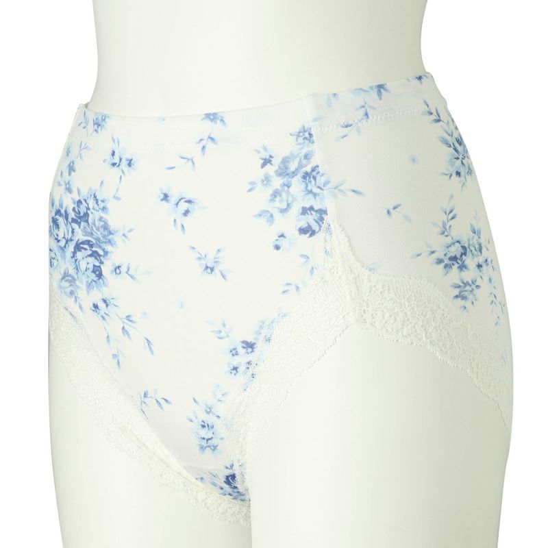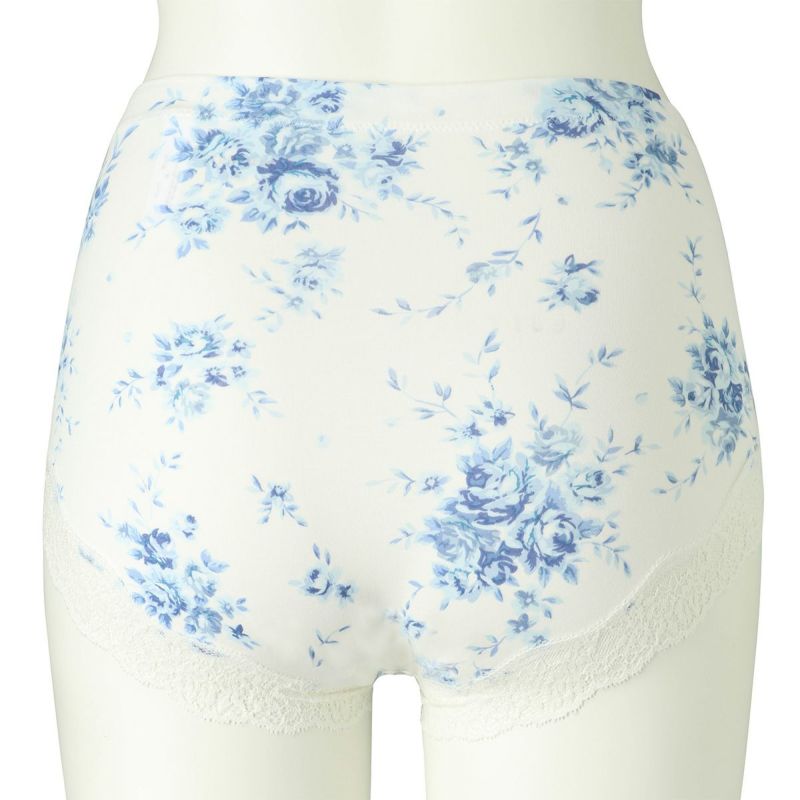 お腹周りをすっぽり包み込むような安心感のある履き心地の深型ショーツ。ウエストはゴムではなく身生地にパワーネットを挟んでいるのでソフトにフィット。身生地を折り返し柄が際立つ仕様に。脚口は締め付け感のない綿混レース。