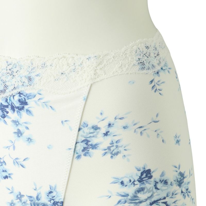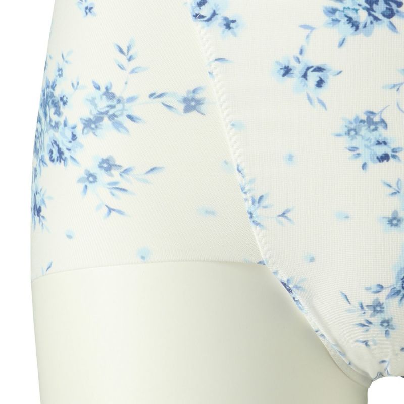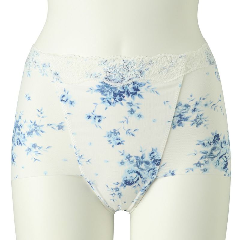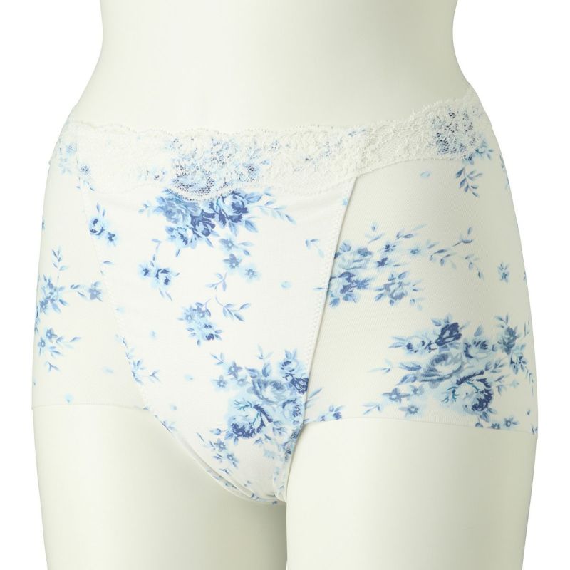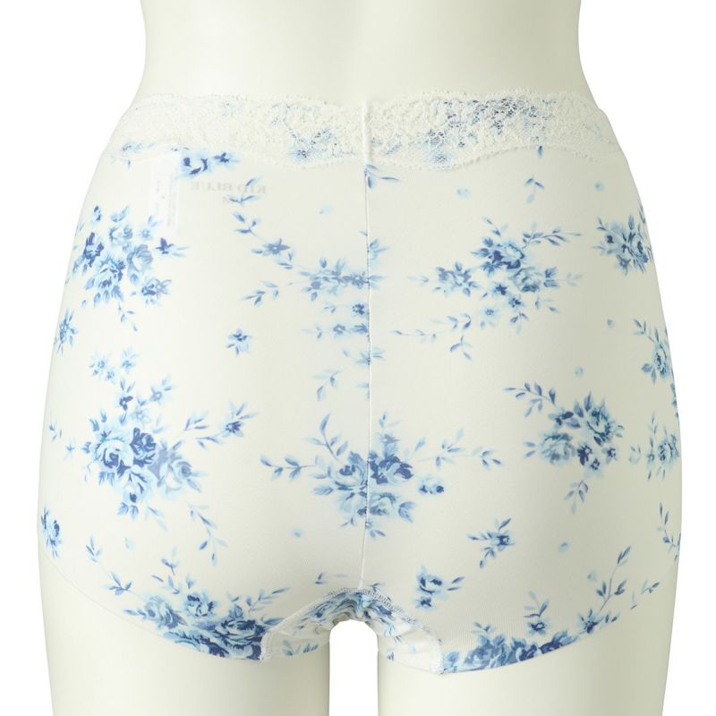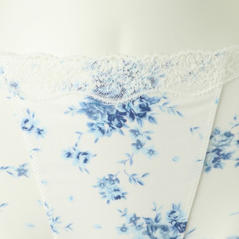 肌側綿混でふちに縫い目のないヘム素材を活かしたシリーズ。肌との段差が出にくくなめらかなシルエットに。キッドブルーのオリジナルの華やかなブラッサムプリントを施しました。