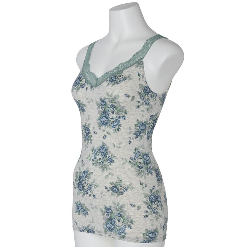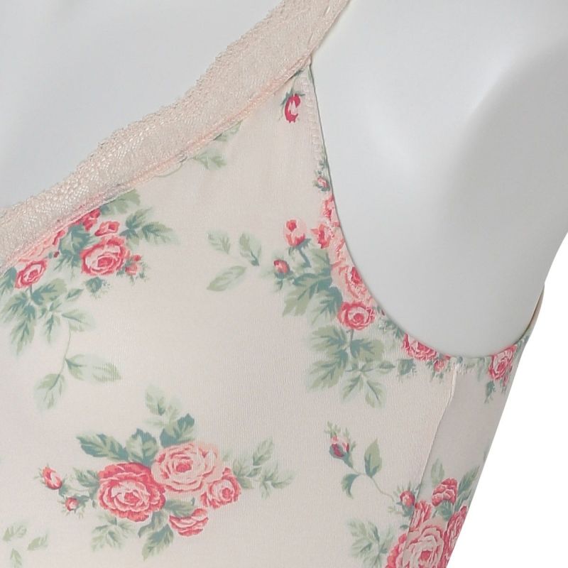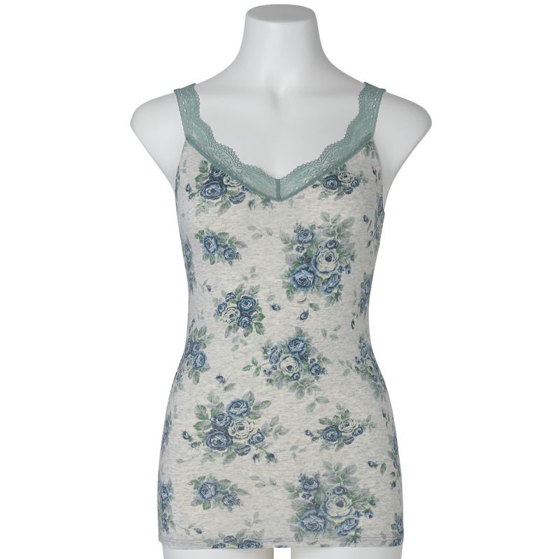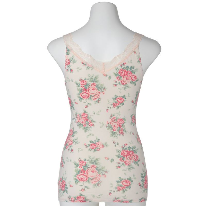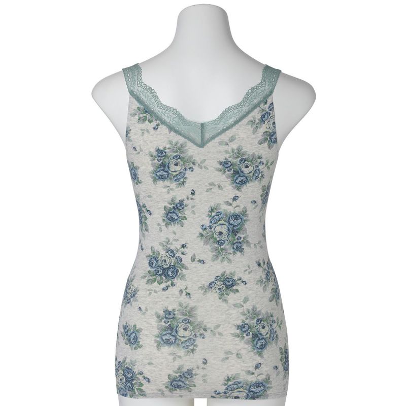 華やかな柄をたっぷりたのしめるキャミソール。フロントからストラップ、背中まで続くレースが軽やかで可愛らしい。生地の編みを活かしたソフトな着心地。V開きなのでデコルテ部分をすっきりときれいに見せてくれるのも嬉しいポイント。