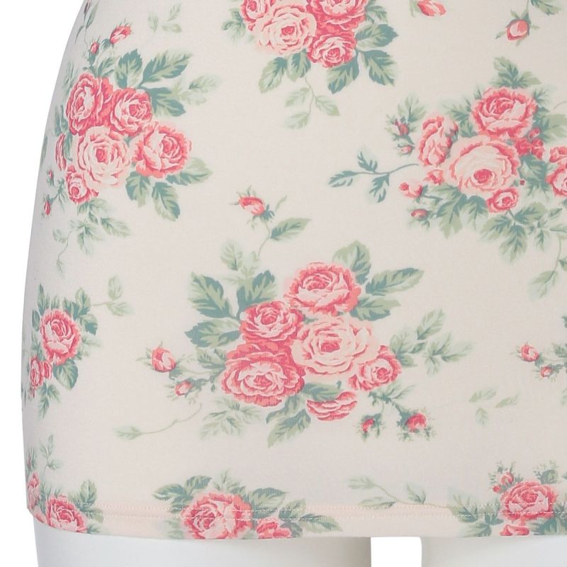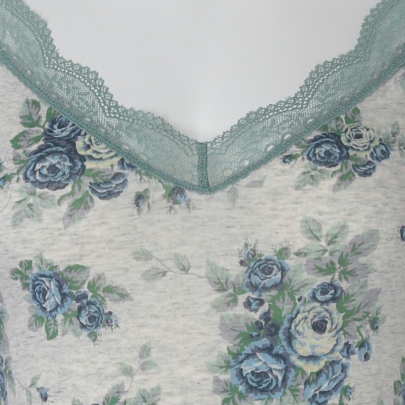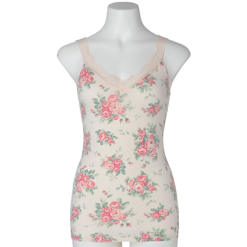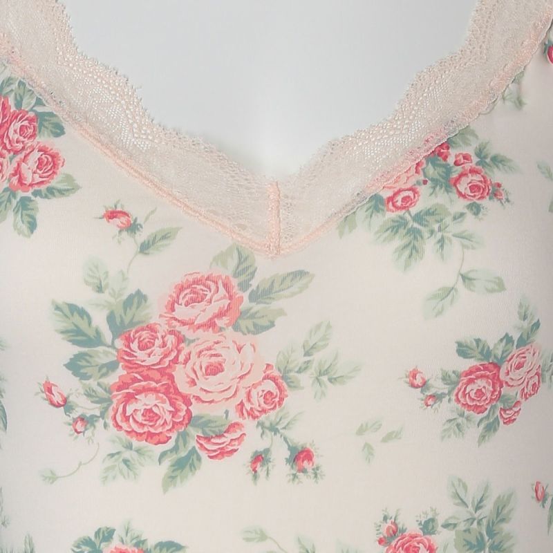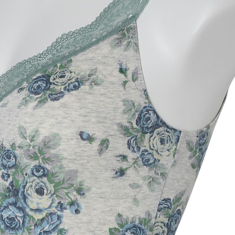 華やかな柄をたっぷりたのしめるキャミソール。フロントからストラップ、背中まで続くレースが軽やかで可愛らしい。生地の編みを活かしたソフトな着心地。V開きなのでデコルテ部分をすっきりときれいに見せてくれるのも嬉しいポイント。