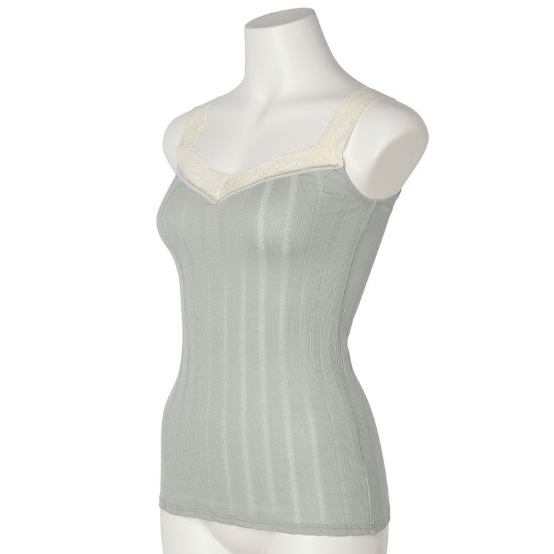 天然素材ならではの安心感のあるキャミソール。胸元からストラップ、背中までトリミングしたレースでかわいらしさをプラス。