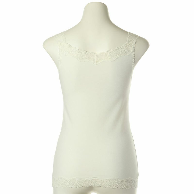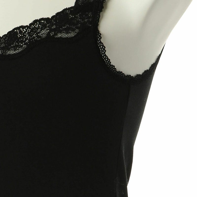 ほどよいフィット感と厚みでオールシーズン着用できるキャミソール。肩ストラップはレースで伸び縮みがよく調整いらずでやや幅広なのでずれにくい。