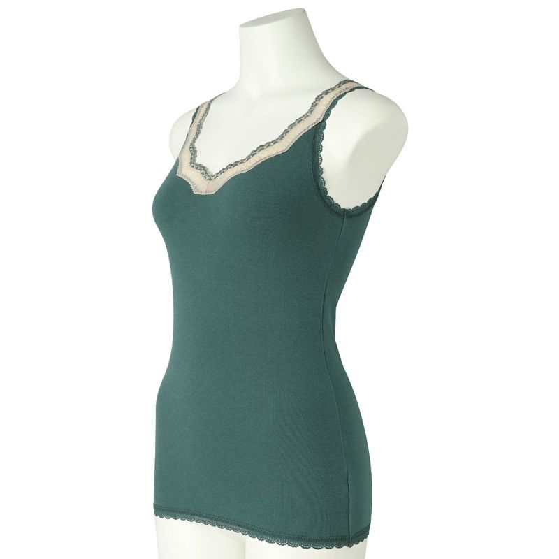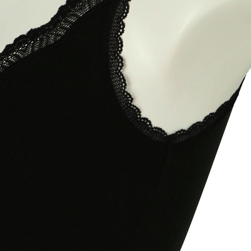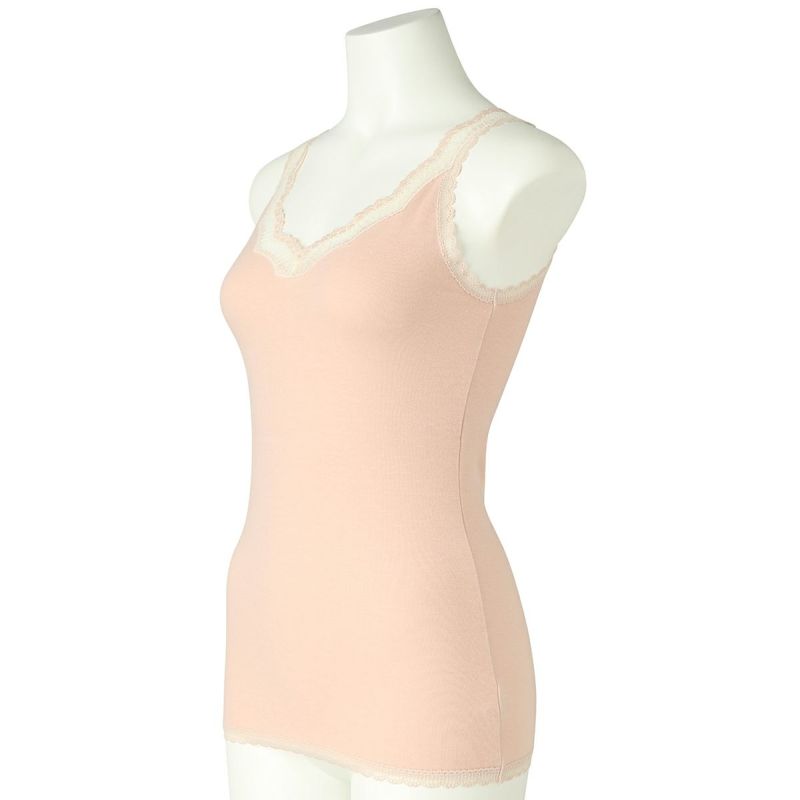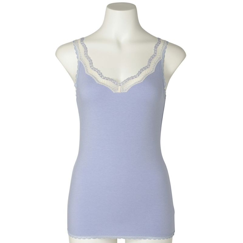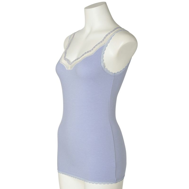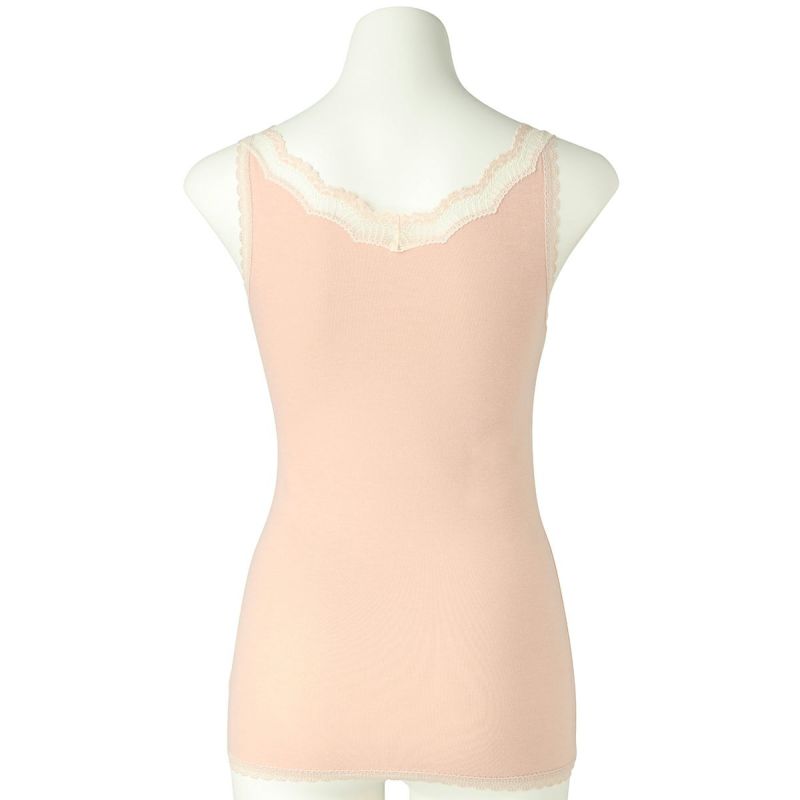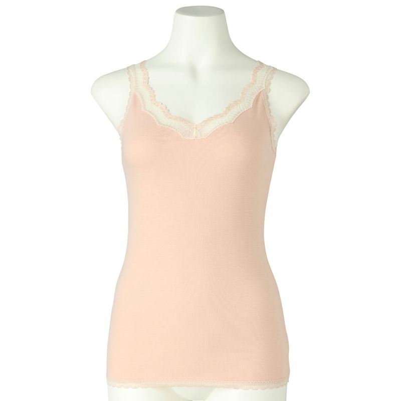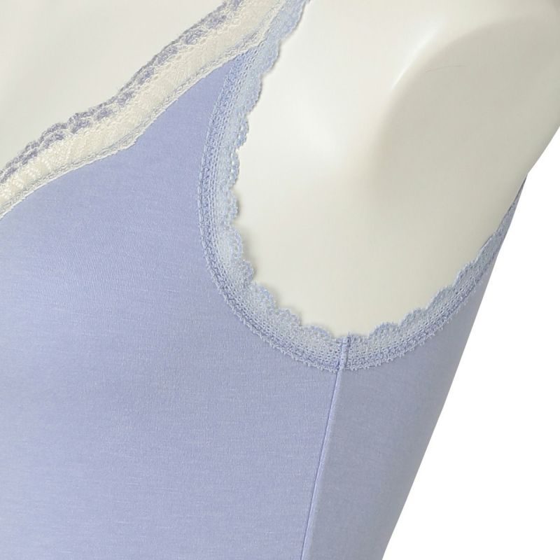 V開きのキャミソールは、フロントから背中までレースの肩紐が続く華やかなデザイン。かわいさプラスやや太め幅のレースでずれにくいところも嬉しいポイント。アジャスターもないのでごろつきなく快適な着心地。
