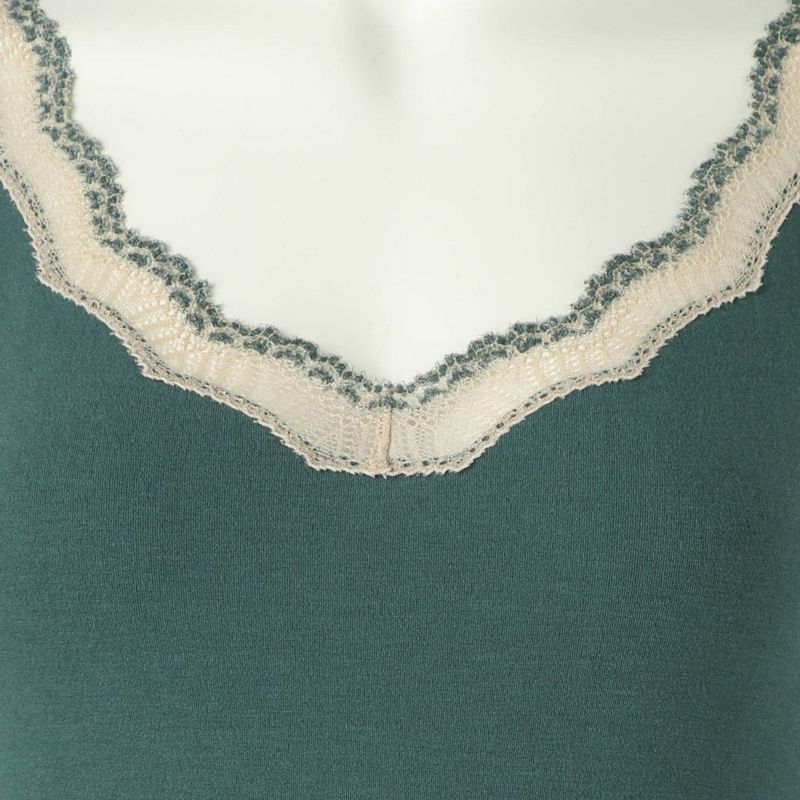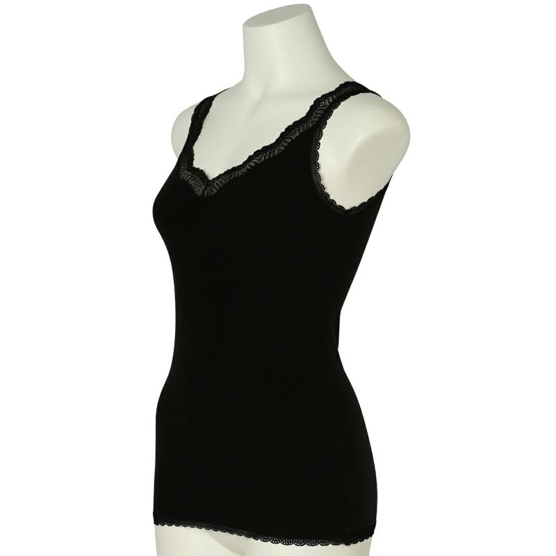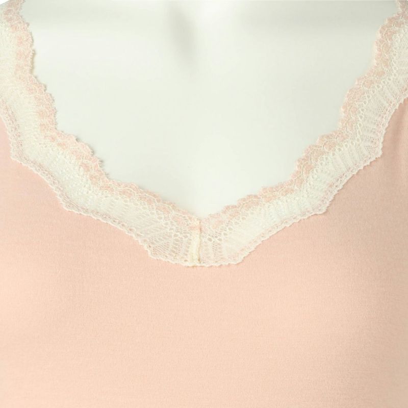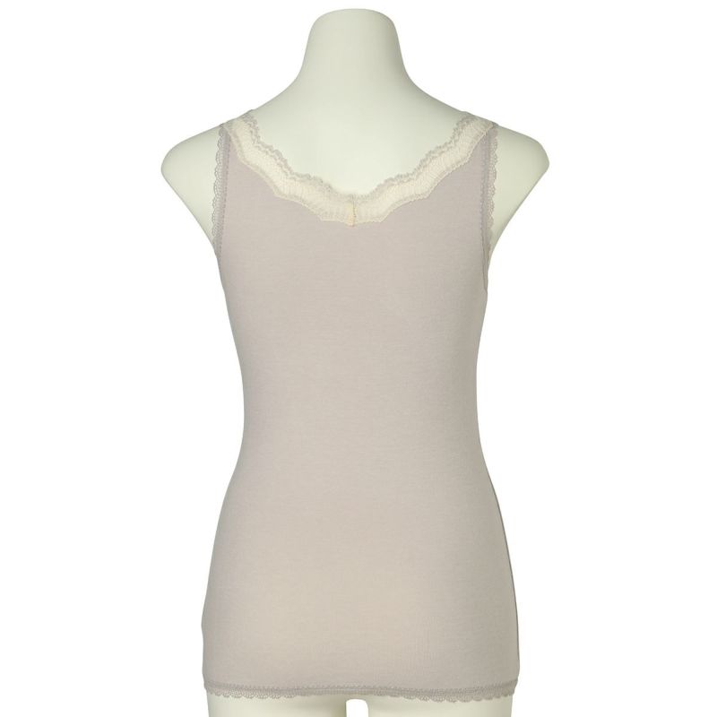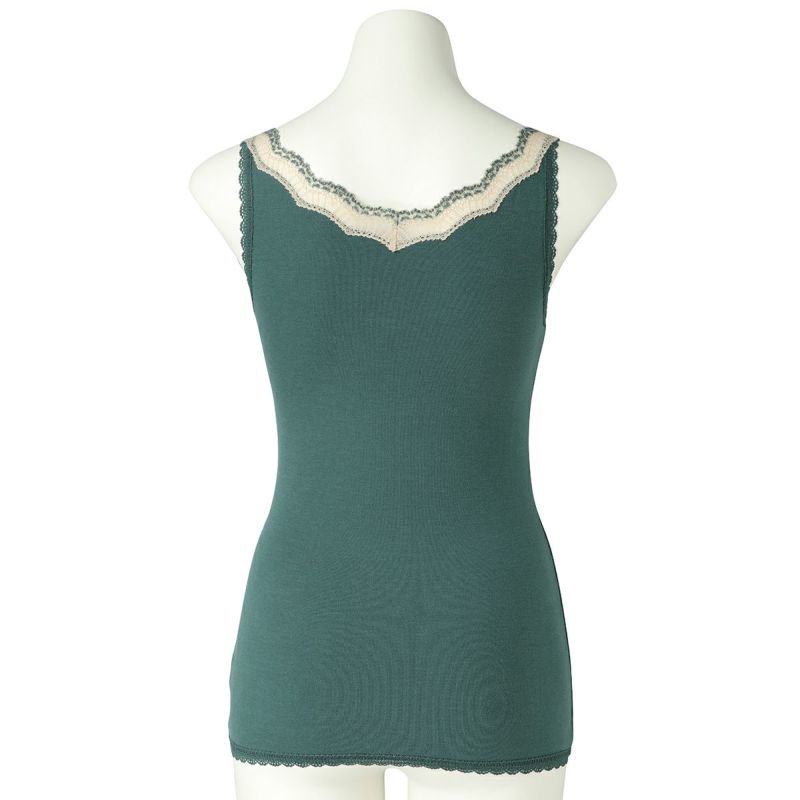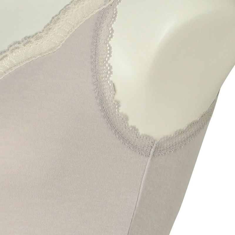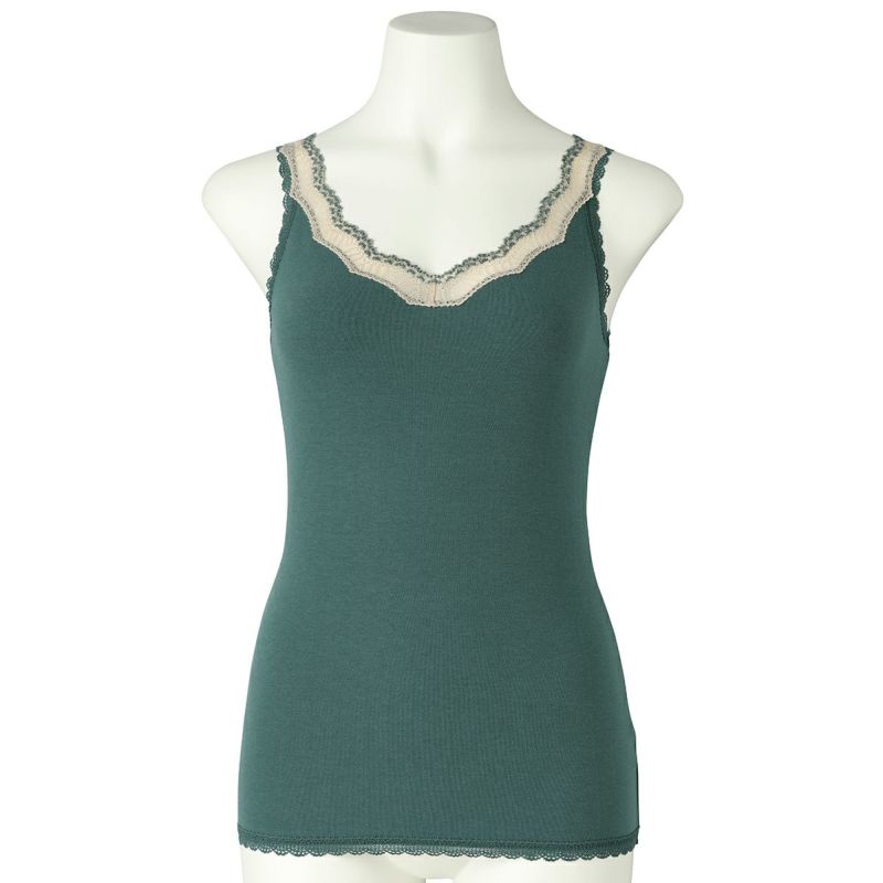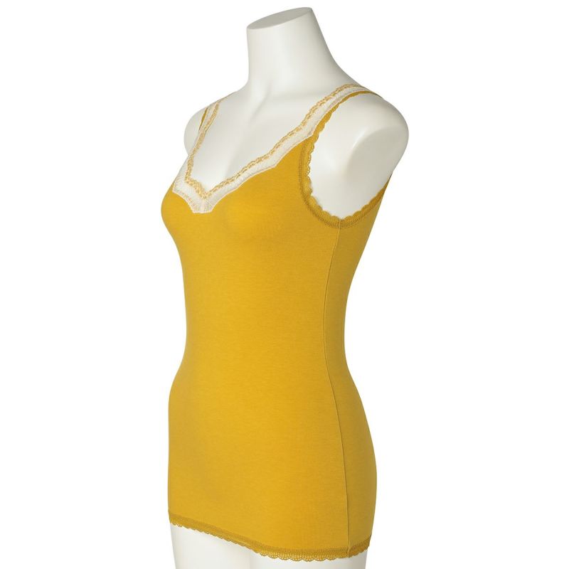 V開きのキャミソールは、フロントから背中までレースの肩紐が続く華やかなデザイン。かわいさプラスやや太め幅のレースでずれにくいところも嬉しいポイント。アジャスターもないのでごろつきなく快適な着心地。
