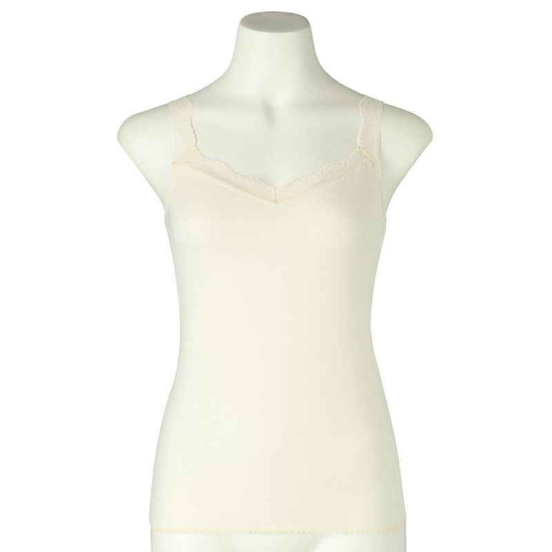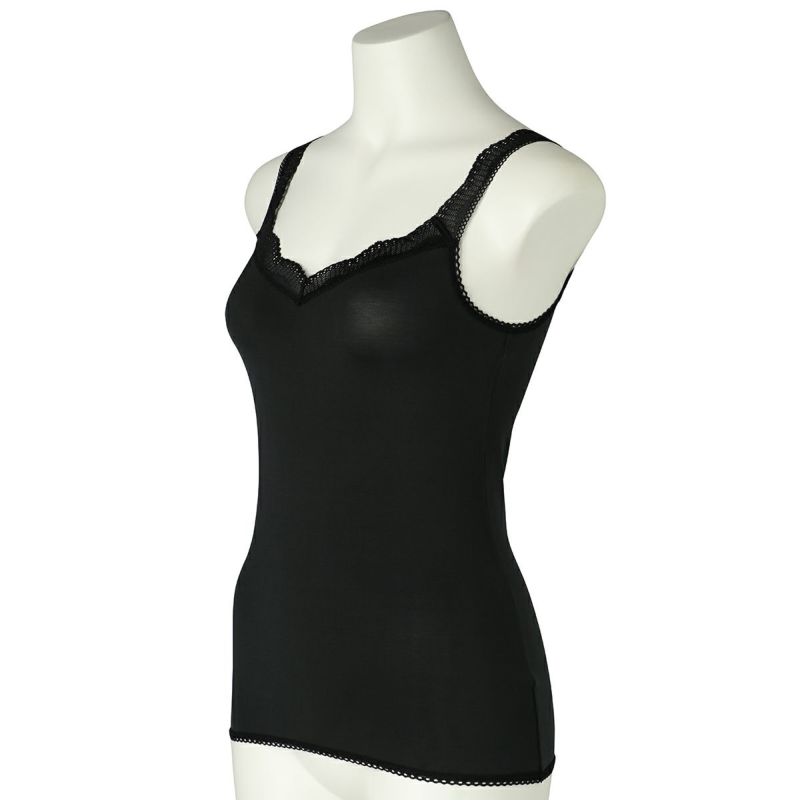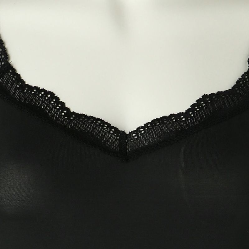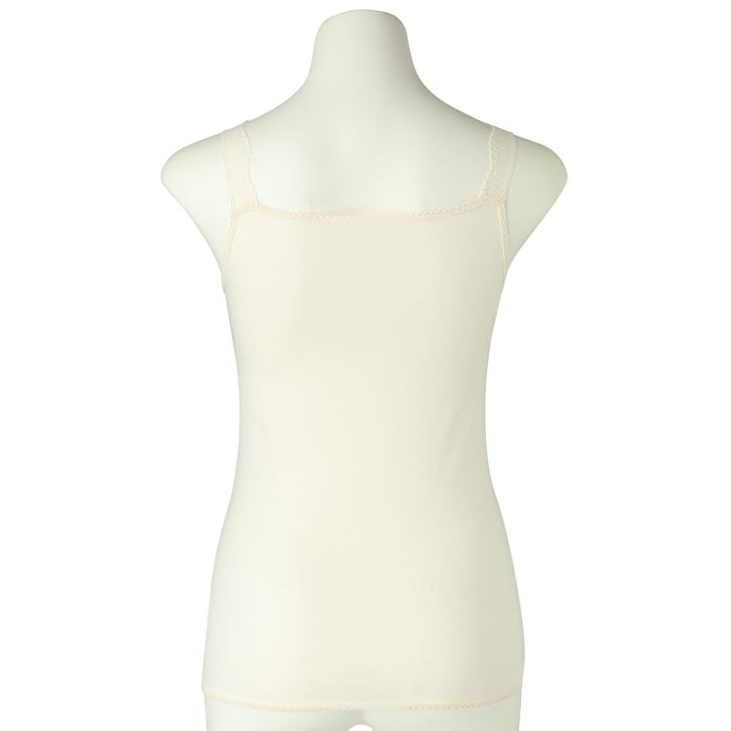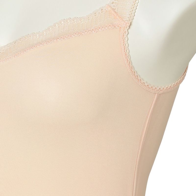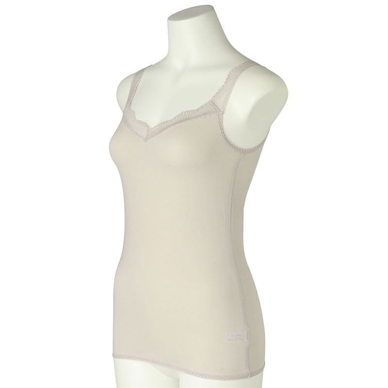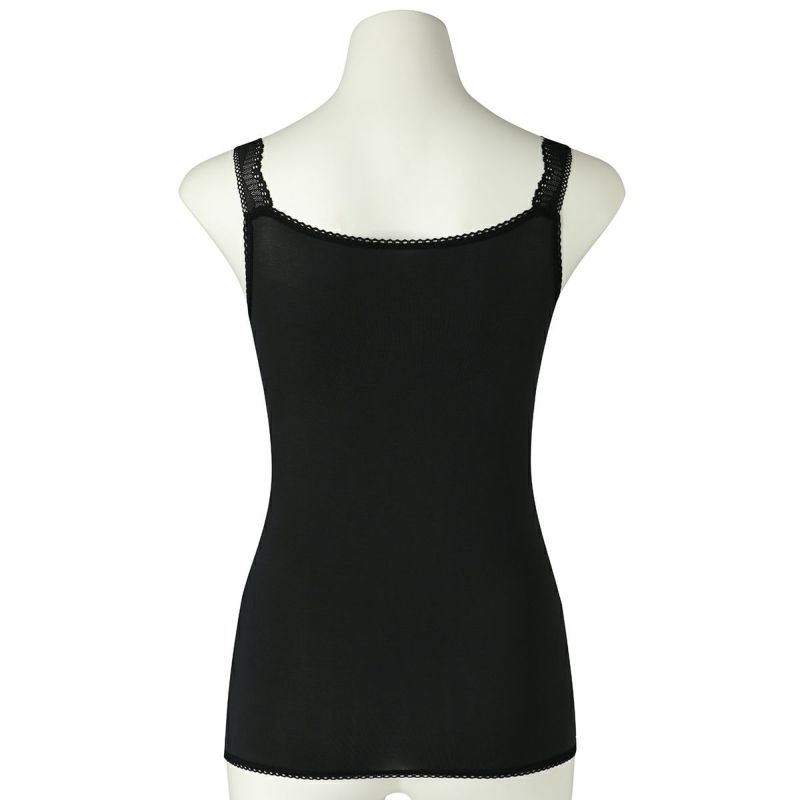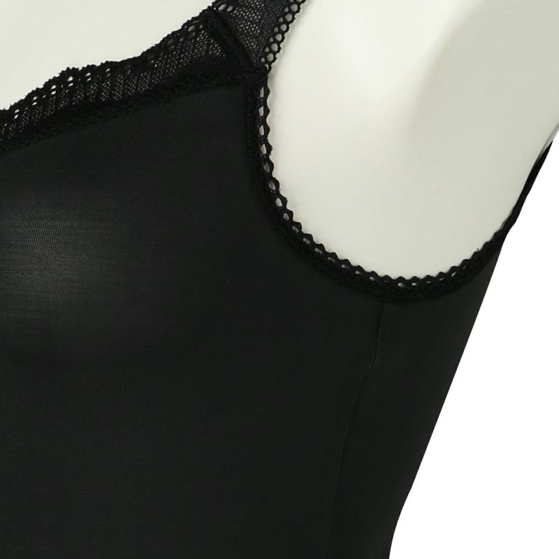 伸びがよくサラッと着れほどよくフィットする素材を活かしたキャミソール。胸元にはストライプ調のすっきりした柄ゆきの身生地同色の幅広レースをあしらいスタイリッシュな印象に。