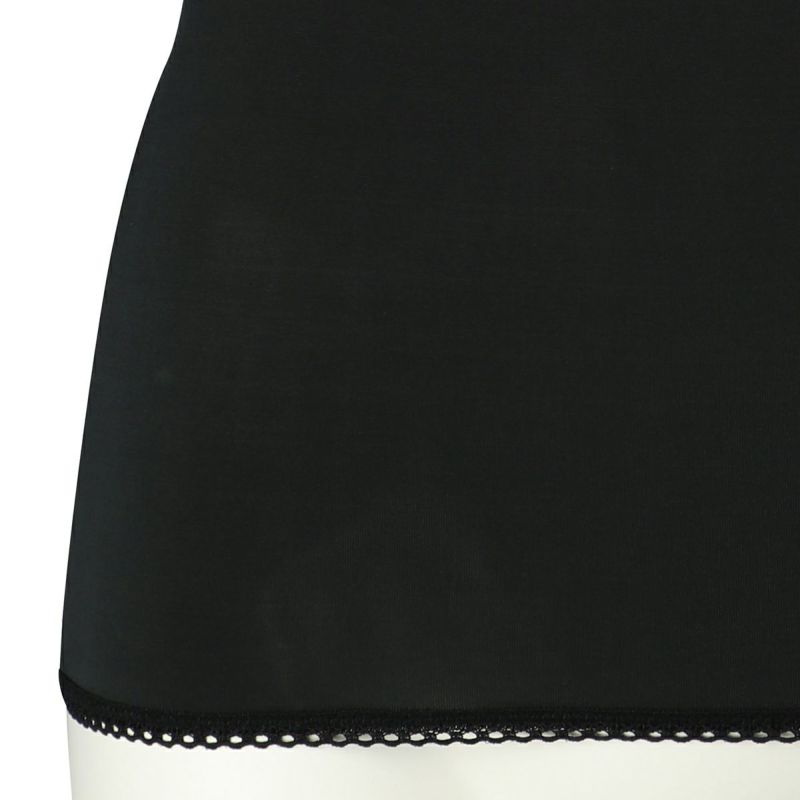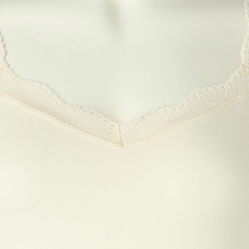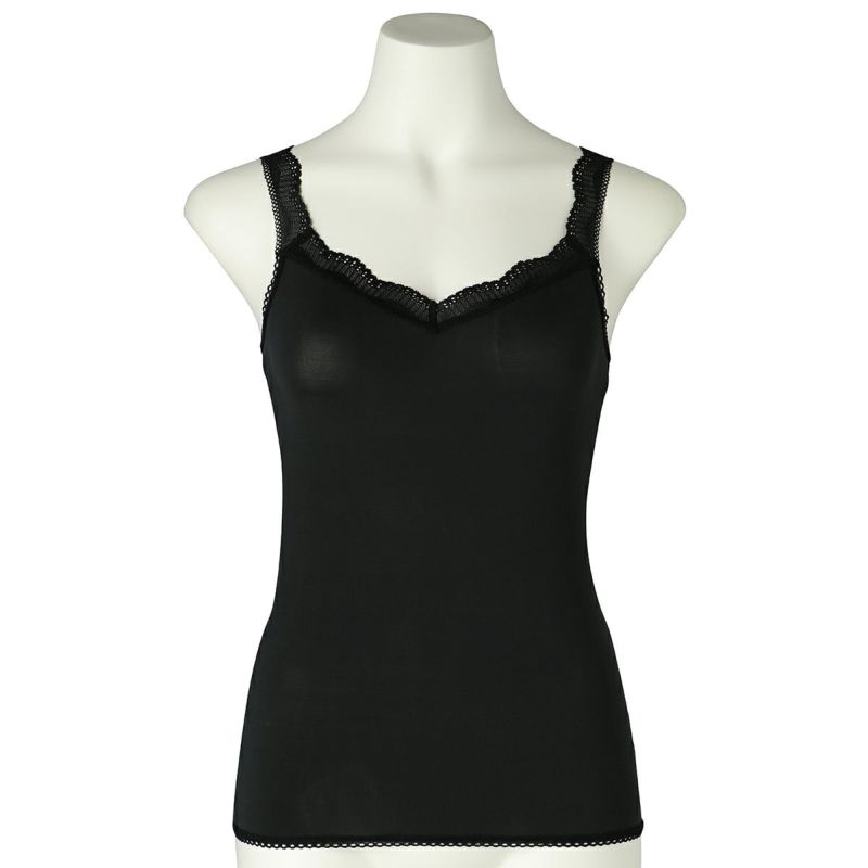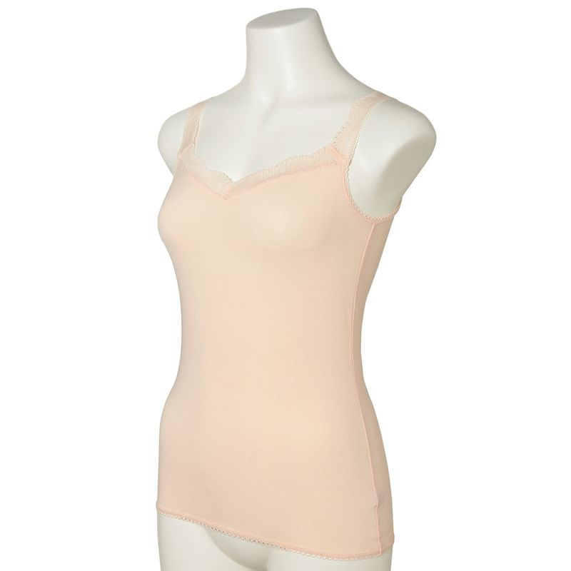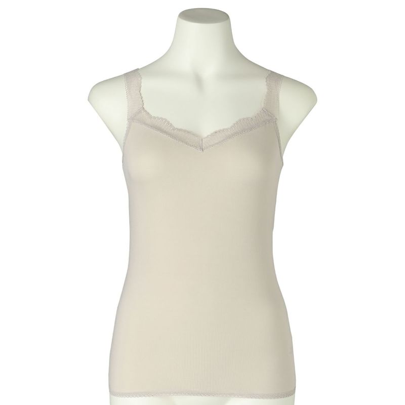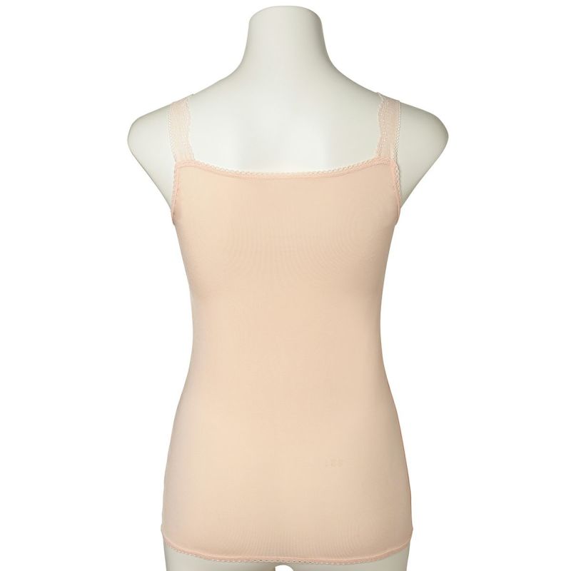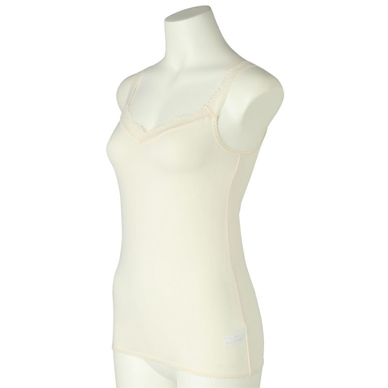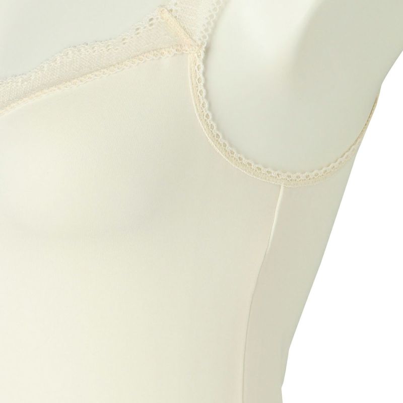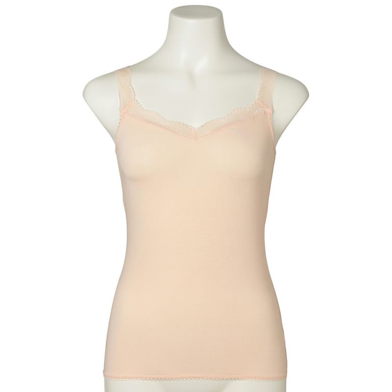 伸びがよくサラッと着れほどよくフィットする素材を活かしたキャミソール。胸元にはストライプ調のすっきりした柄ゆきの身生地同色の幅広レースをあしらいスタイリッシュな印象に。