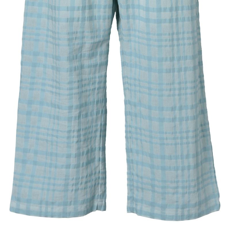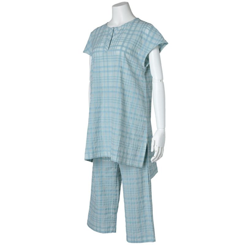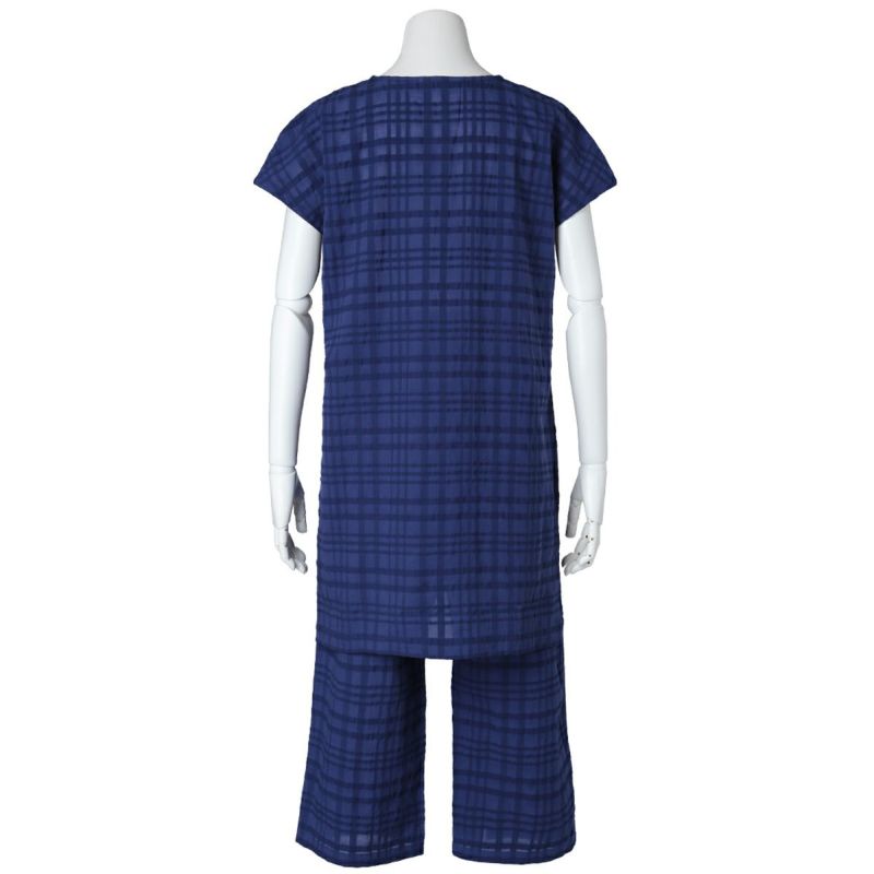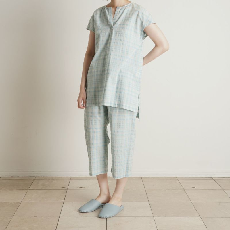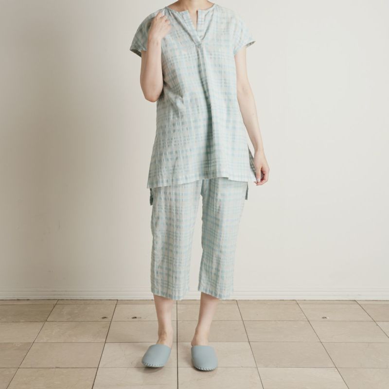 ゆとりのあるサイジングでかぶって楽に着れる半袖パジャマ。トップスは前後差を出し、こなれたシルエットに。後ろはお尻が隠れるくらいの丈感。8分丈ボトムスで足元はすっきりと◎