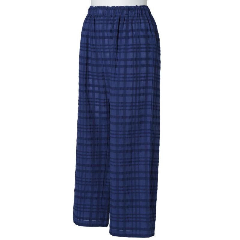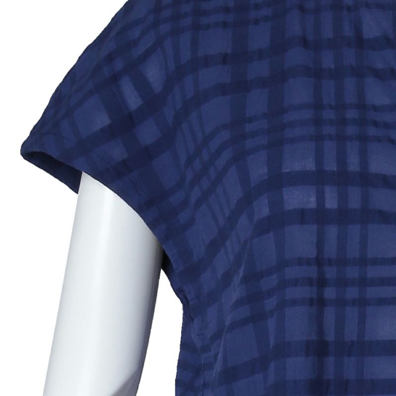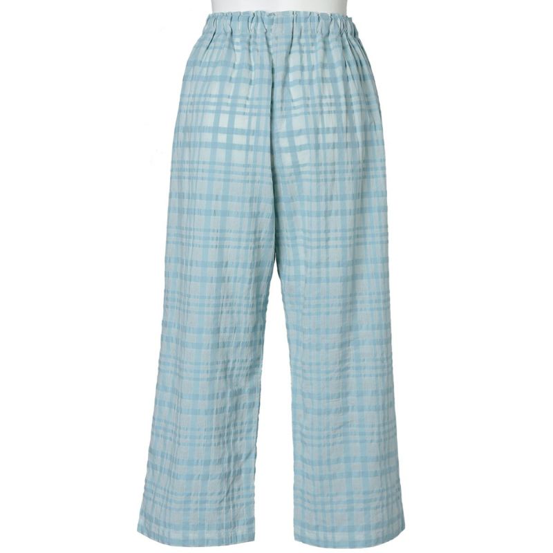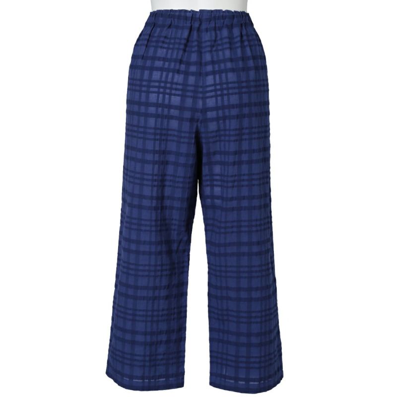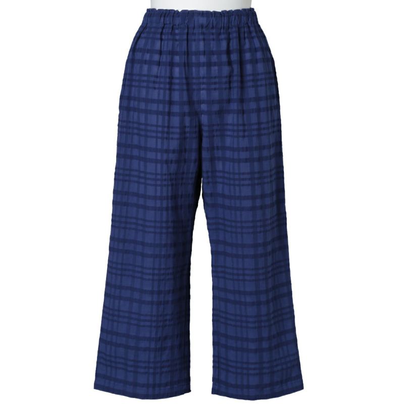 シアー感のある生地にナチュラルなチェック柄がよく映えるサッカー素材。番手の違う先染め糸を使用し、生地の表面に凹凸を出しているので涼しく快適に着用できる。 爽やかなサックスと落ち着いたネイビーの2色展開。