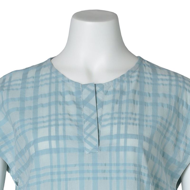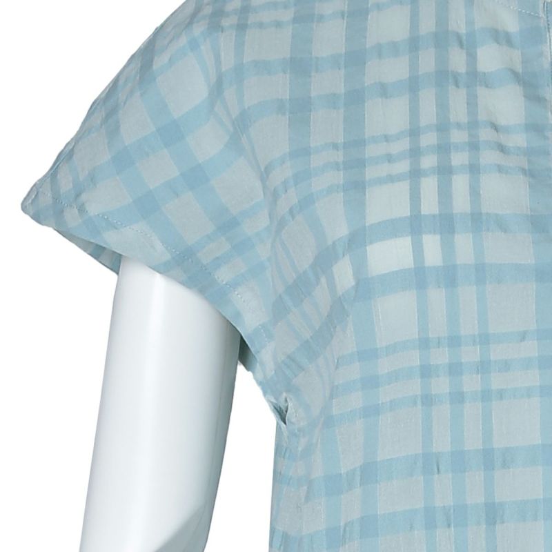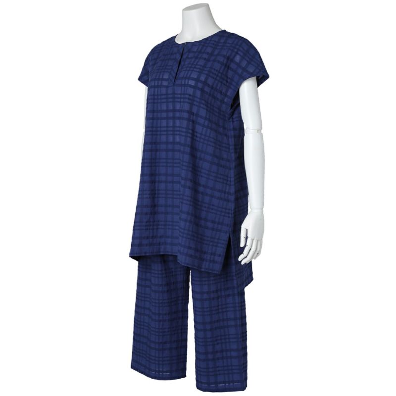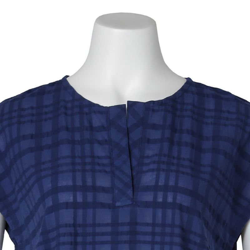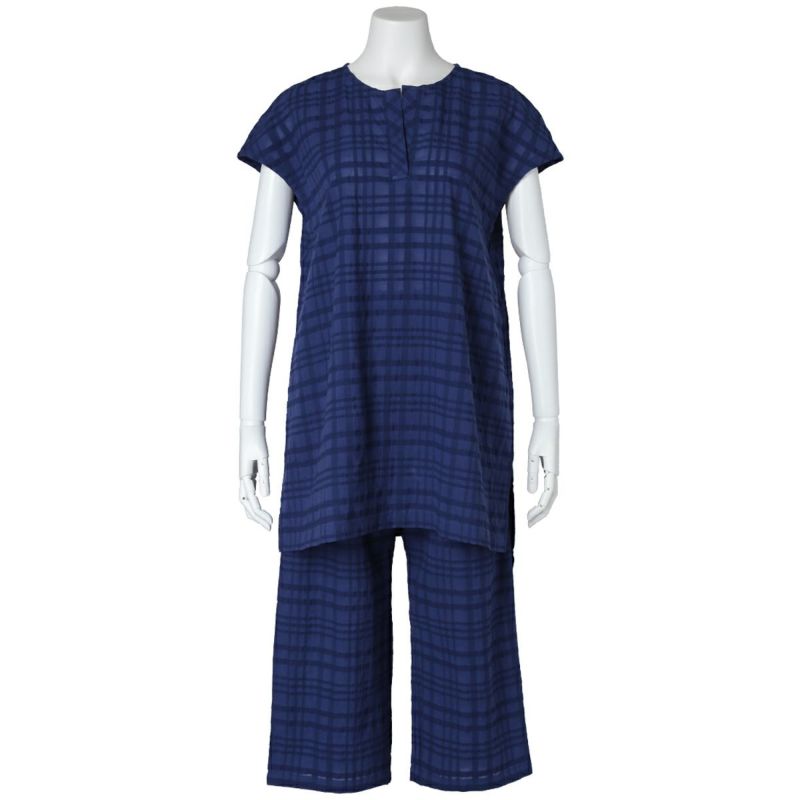 シアー感のある生地にナチュラルなチェック柄がよく映えるサッカー素材。番手の違う先染め糸を使用し、生地の表面に凹凸を出しているので涼しく快適に着用できる。 爽やかなサックスと落ち着いたネイビーの2色展開。