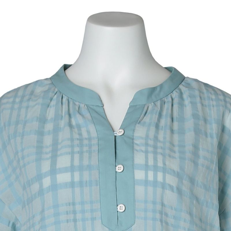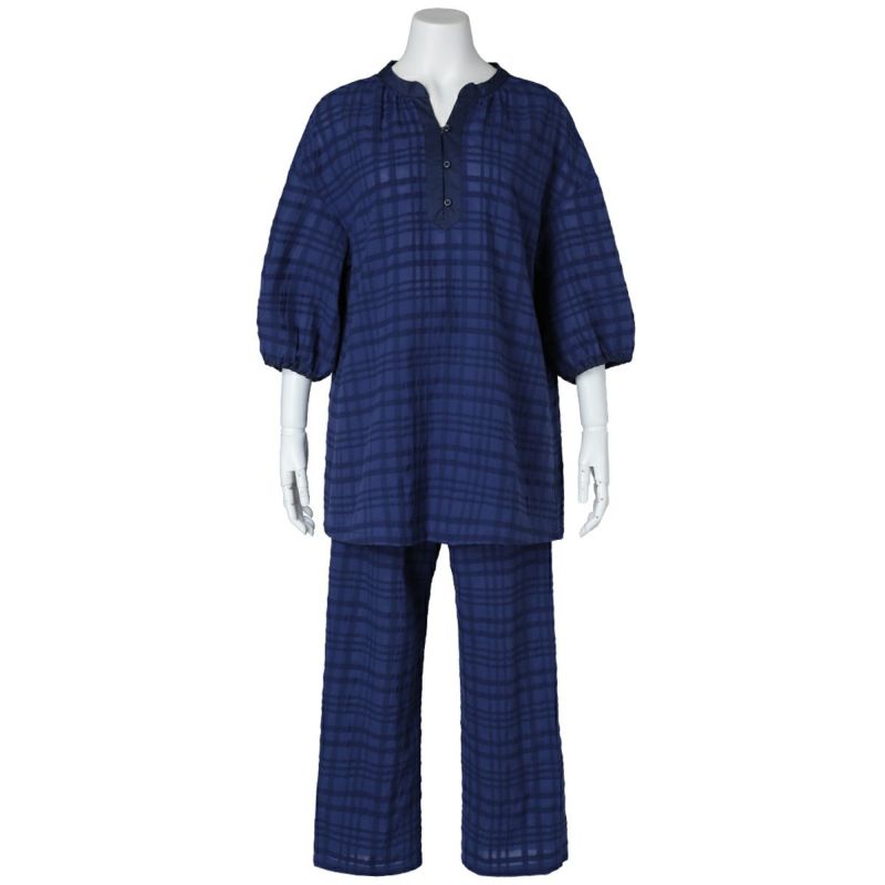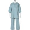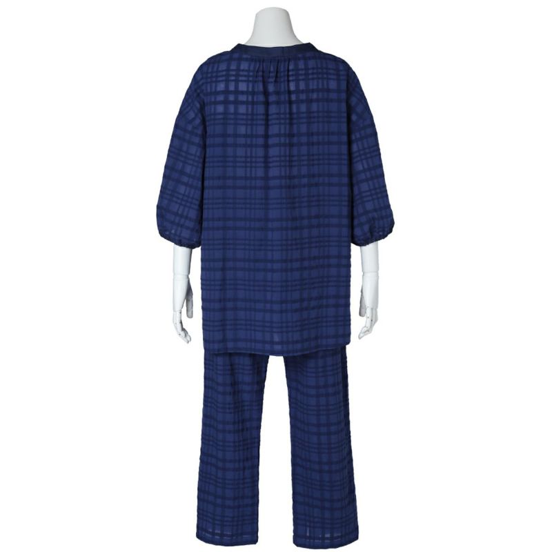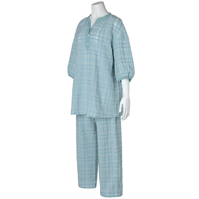 清潔感のあるブラウス風デザインの7分袖パジャマ。首元は涼し気な開きで別布のきれいな仕立てがポイント。ドロップショルダーや袖口のインゴムでギャザーでややパフスリーブに仕上げ、トレンド感のある見え感に。