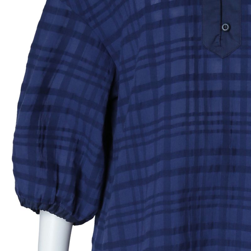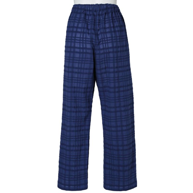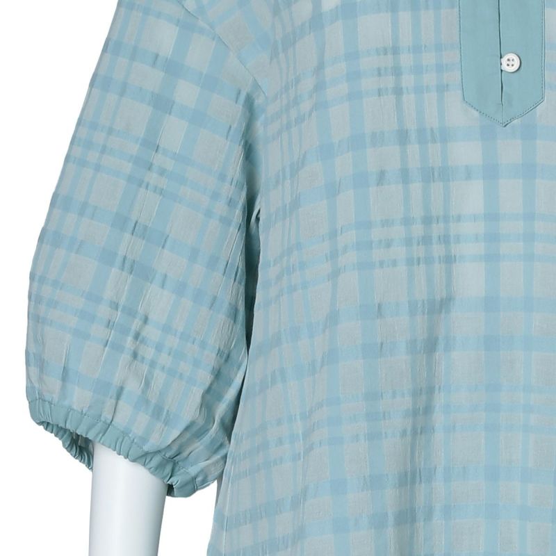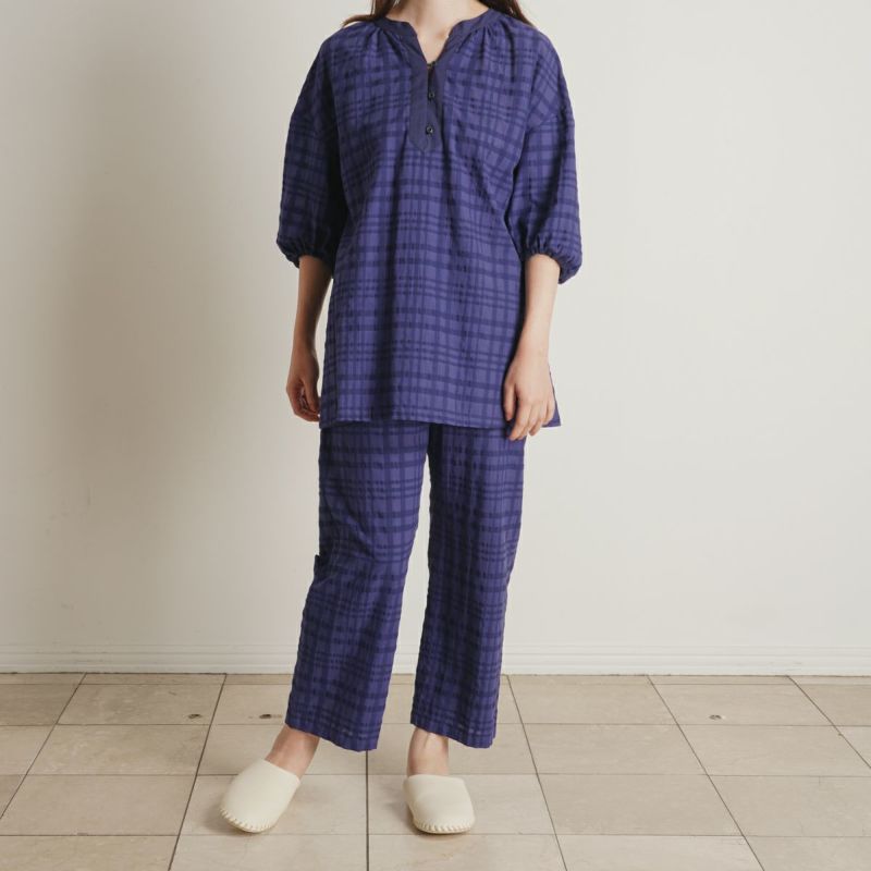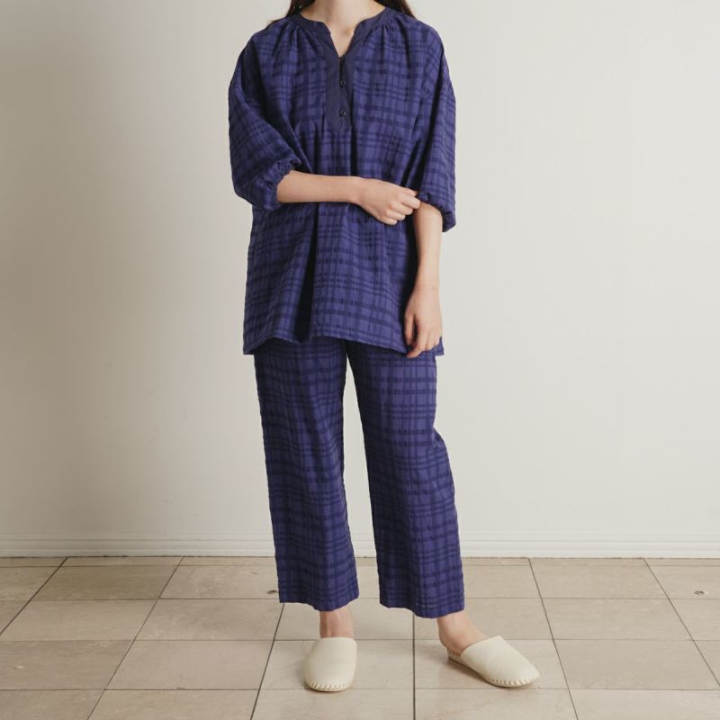 シアー感のある生地にナチュラルなチェック柄がよく映えるサッカー素材。番手の違う先染め糸を使用し、生地の表面に凹凸を出しているので涼しく快適に着用できる。 爽やかなサックスと落ち着いたネイビーの2色展開。
