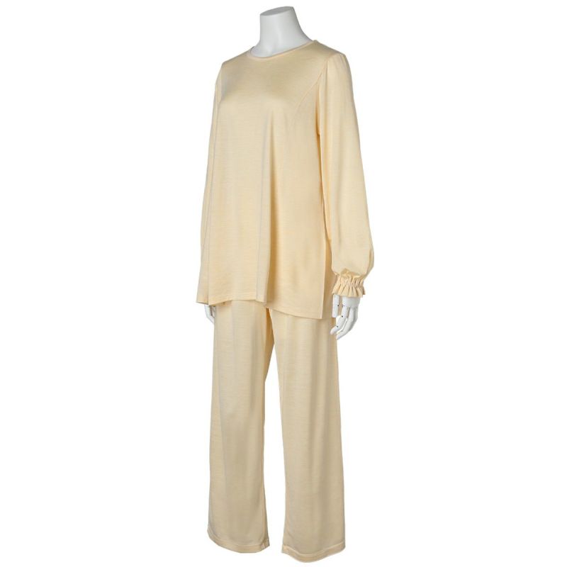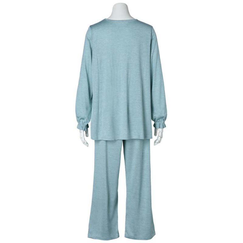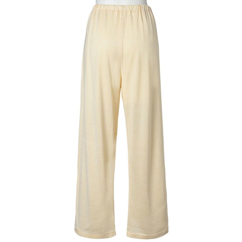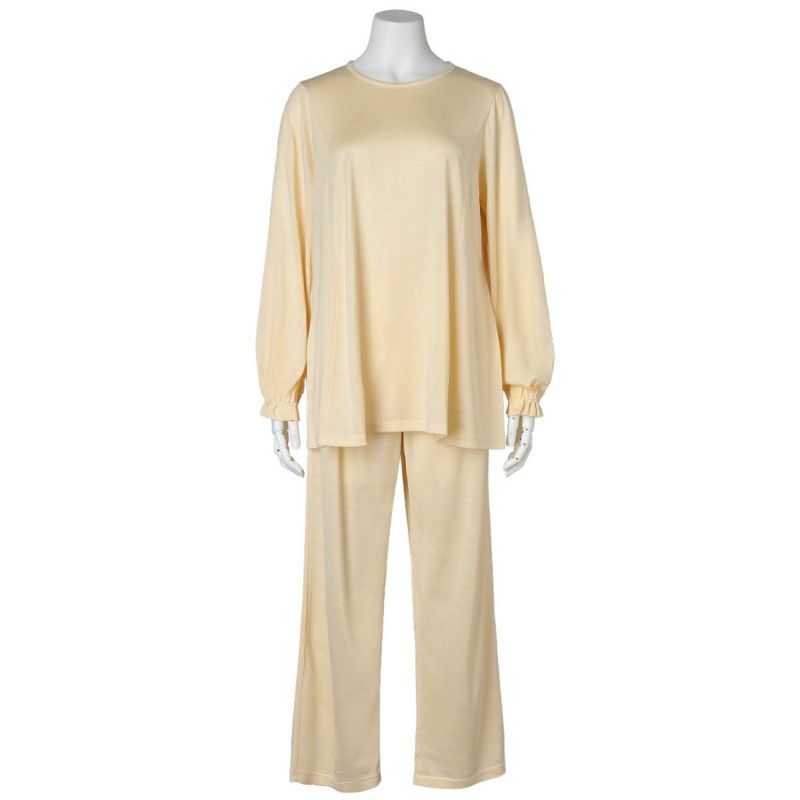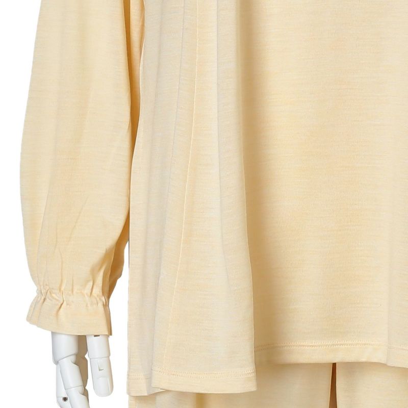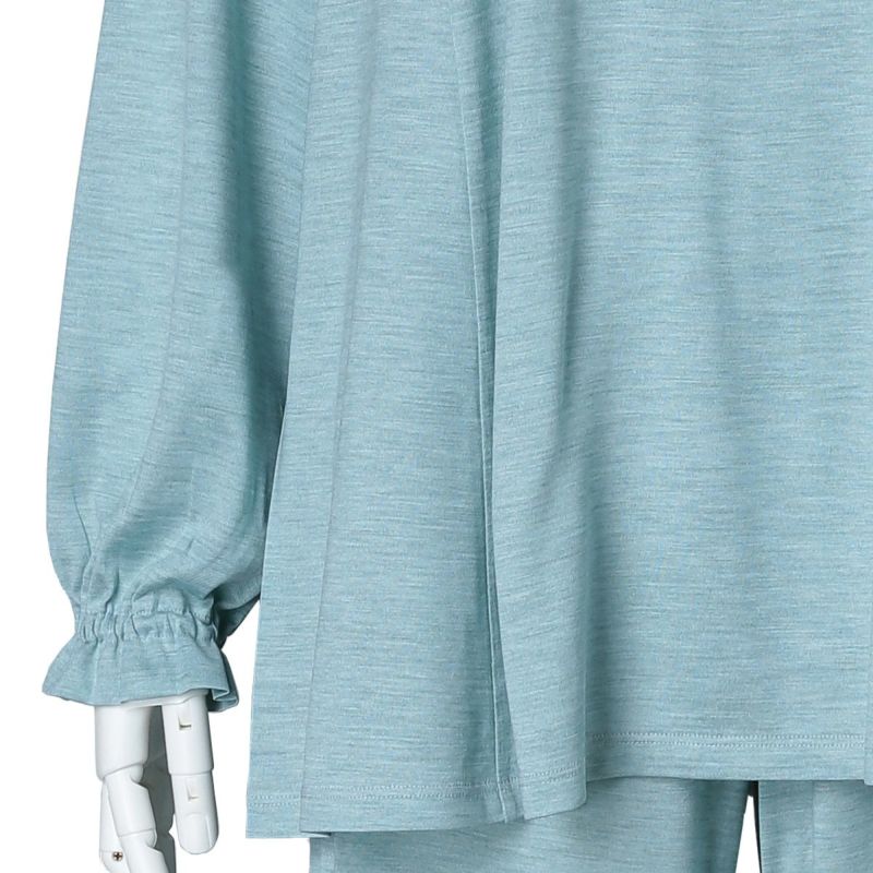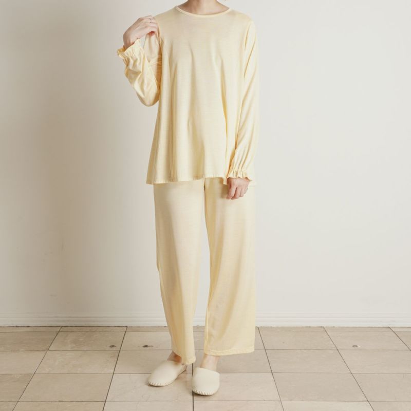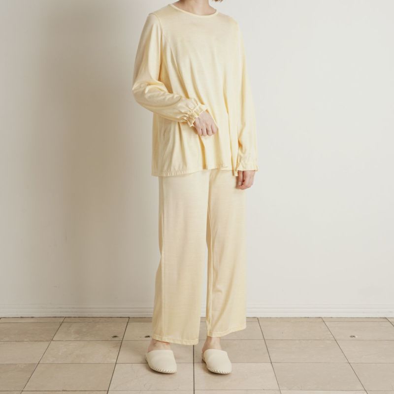 トップスはAラインでふわり広がるエレガントなシルエット。インゴムギャザーの袖口は、フリルのような見え感でさりげない可愛らしさをプラス。ボトムはスタンダードなストレートタイプ。