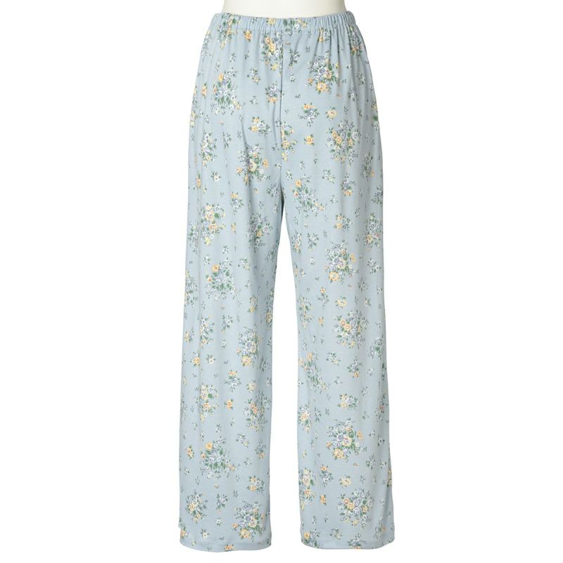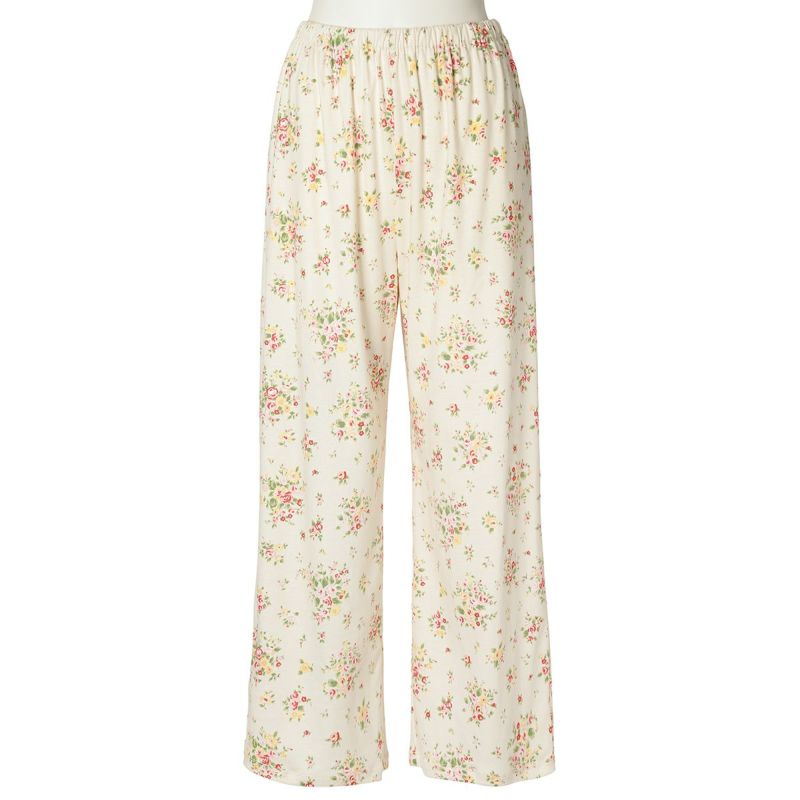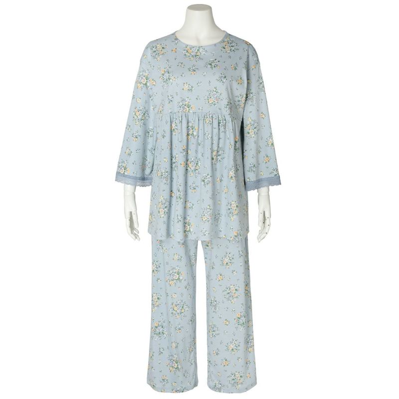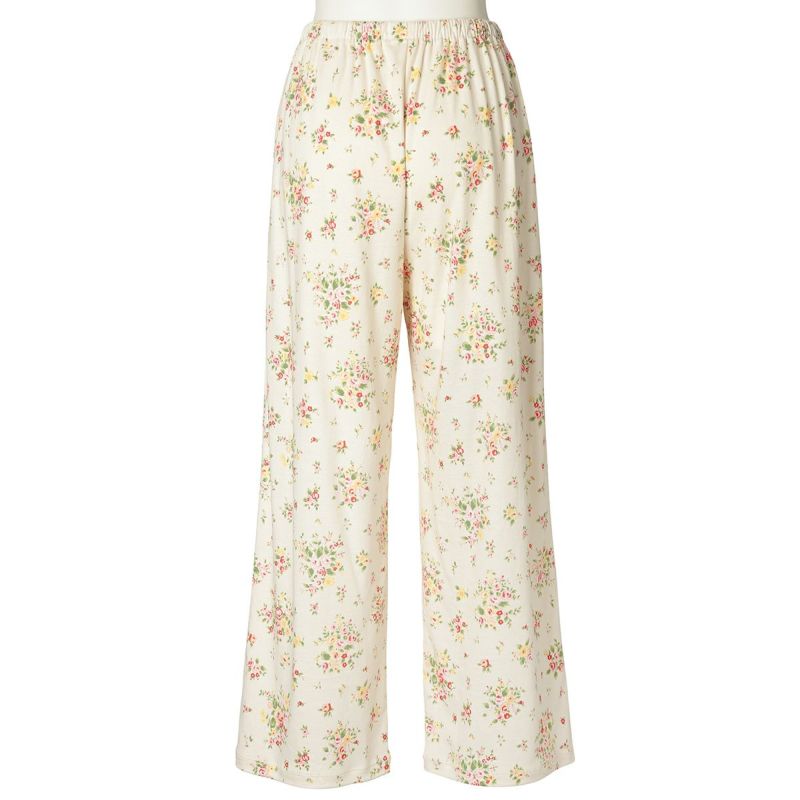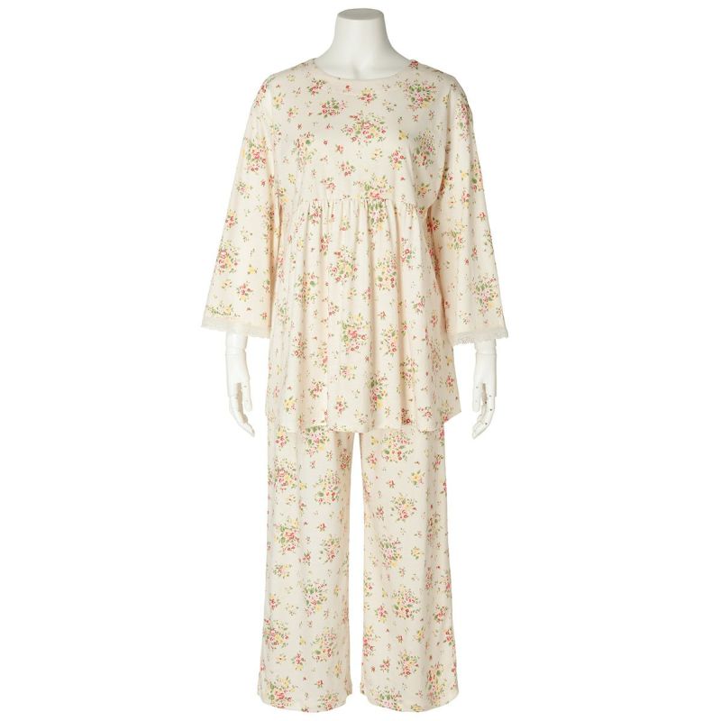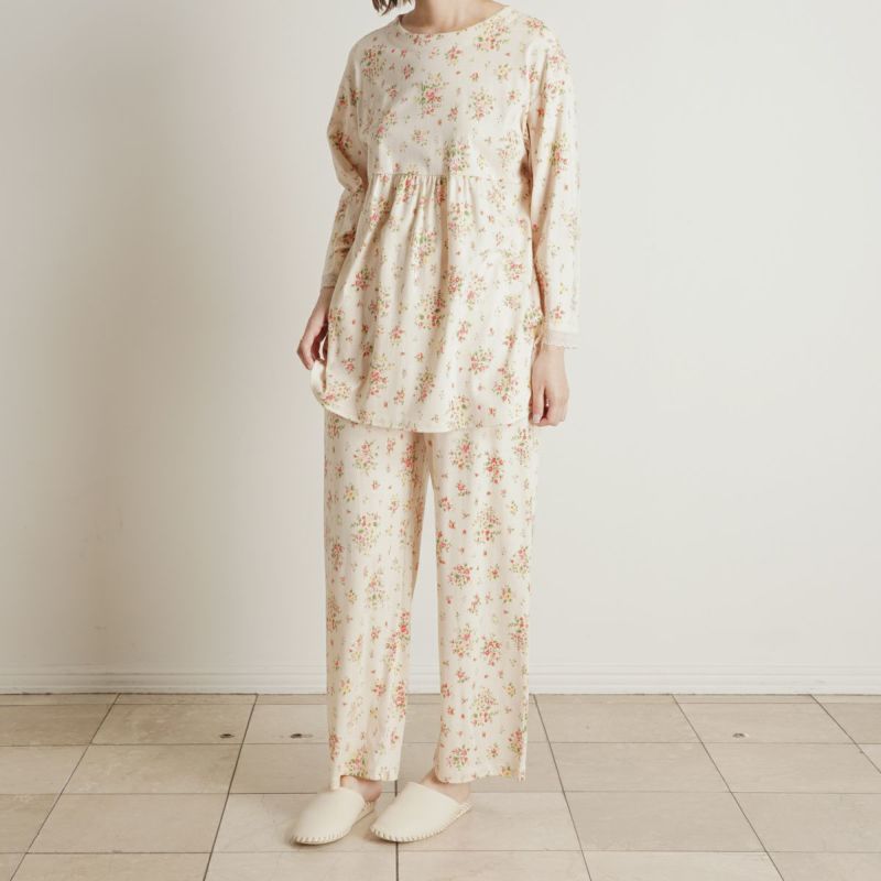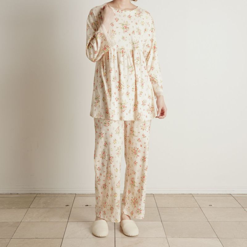 トップスは胸下切り替えの女性らしいシルエット。体型カバー効果も嬉しい。袖口にレースをあしらったエレガントなデザインで手首がすっきりとみえる9分袖タイプ。セットアップのパンツはセミワイドタイプ。