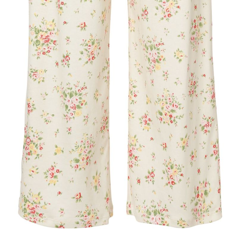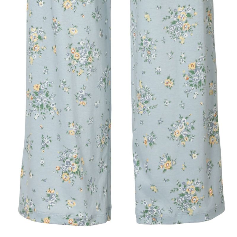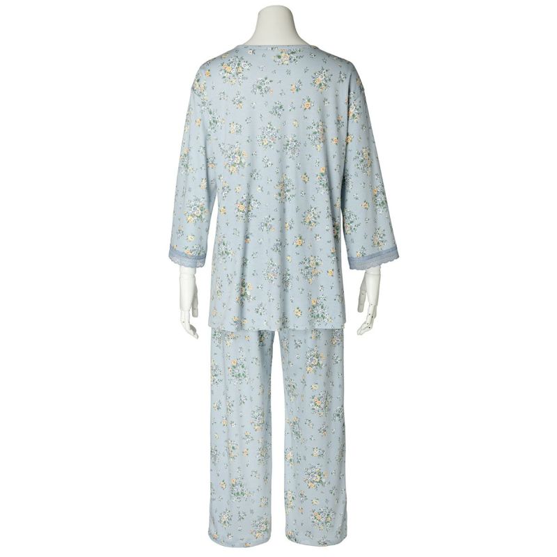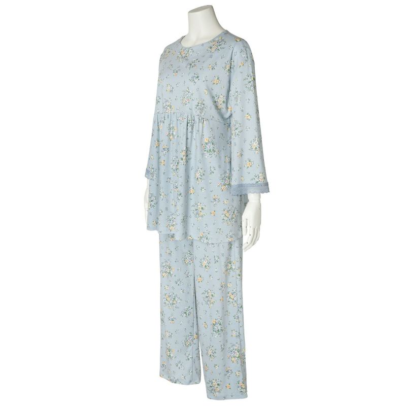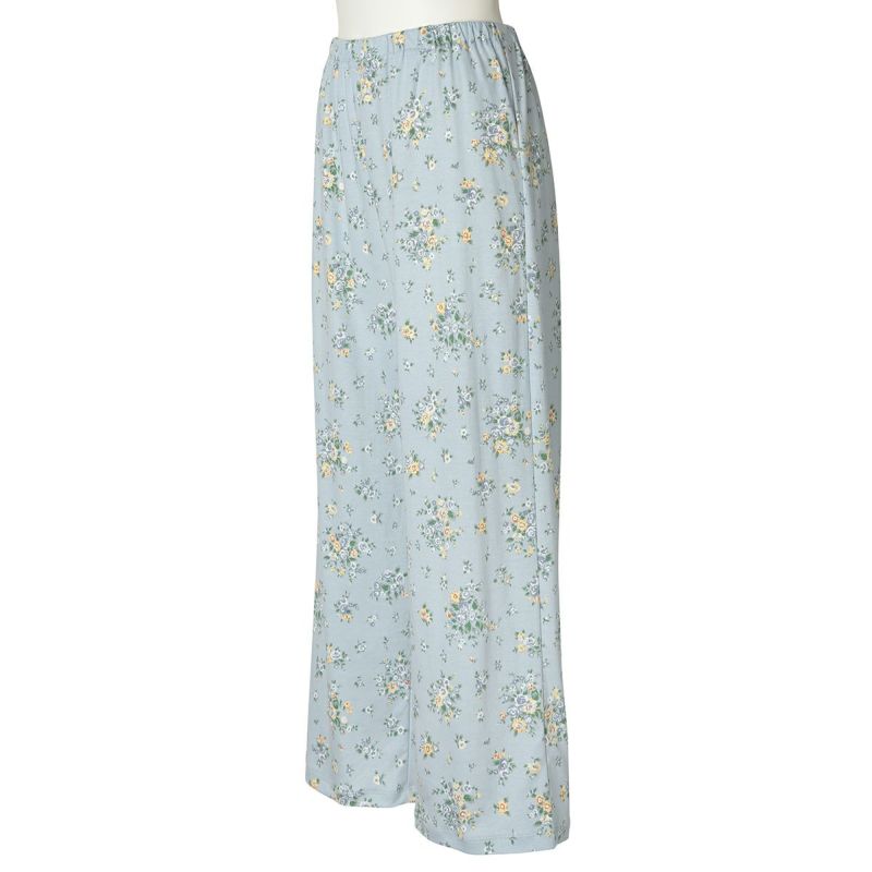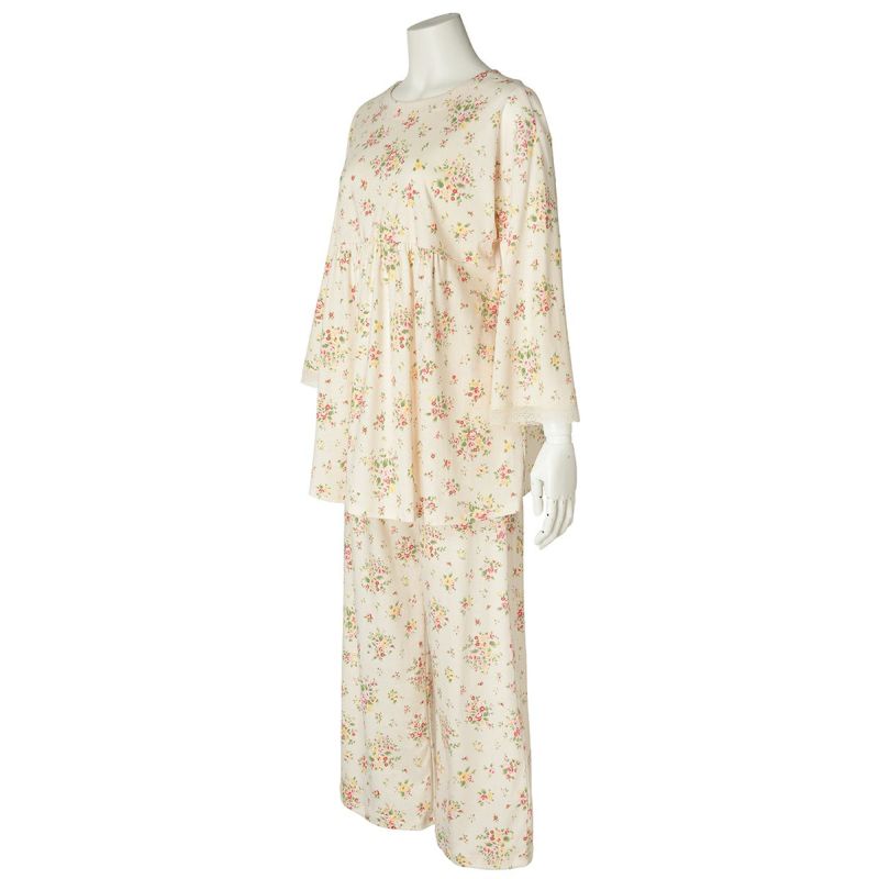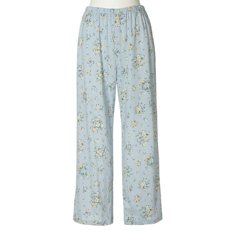 トップスは胸下切り替えの女性らしいシルエット。体型カバー効果も嬉しい。袖口にレースをあしらったエレガントなデザインで手首がすっきりとみえる9分袖タイプ。セットアップのパンツはセミワイドタイプ。
