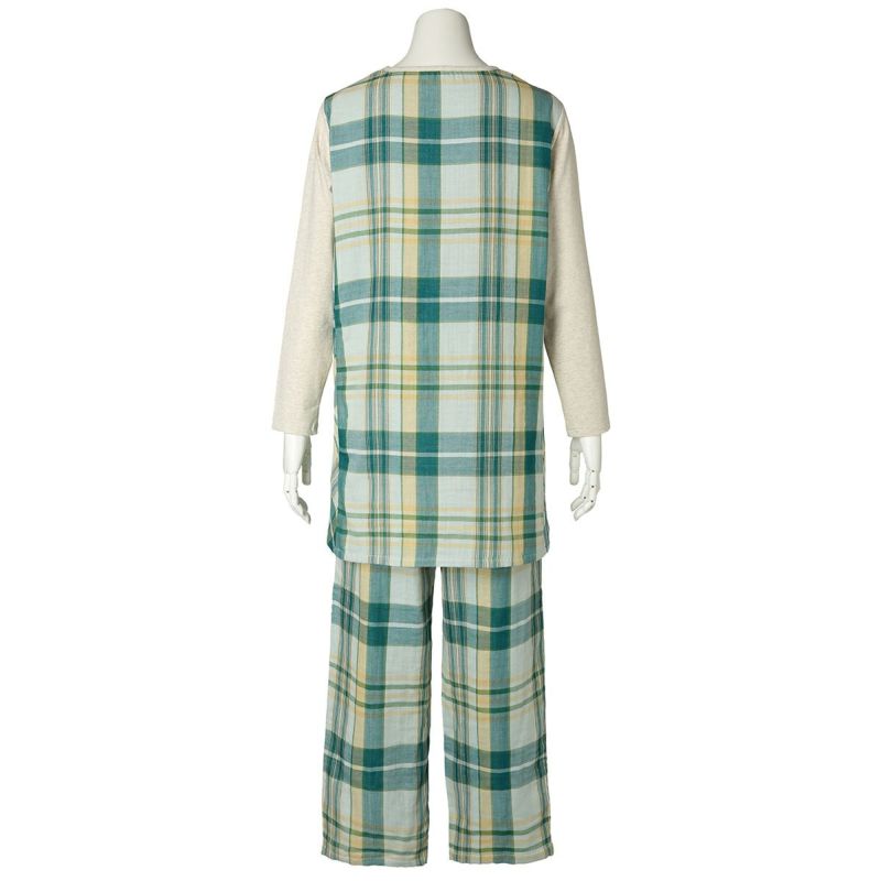 切り替えとギャザーがかわいいチュニックデザインの長袖パジャマ。トップスは裾に向かい広がっているシルエットで気になるお腹周りもカバー。前見頃と袖は体の動きに合わせて伸縮するベア天竺を使用し着脱がしやすく動きやすい。トップスサイドのバイアス使いがポイント。パンツはストレートタイプでバランスよく着こなせます。