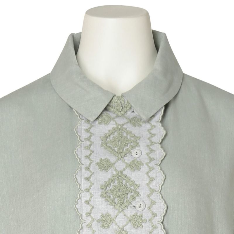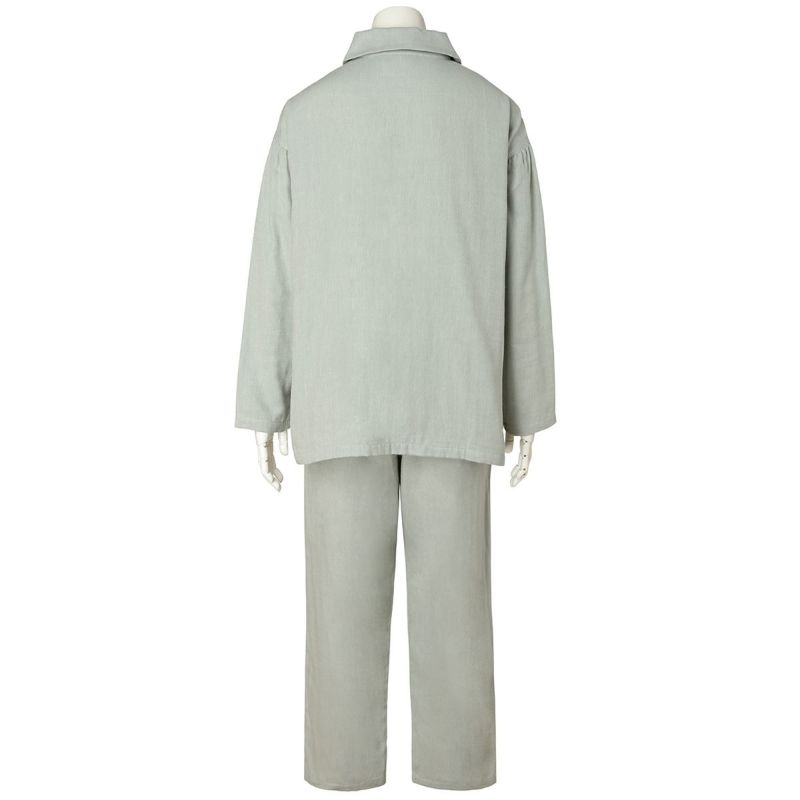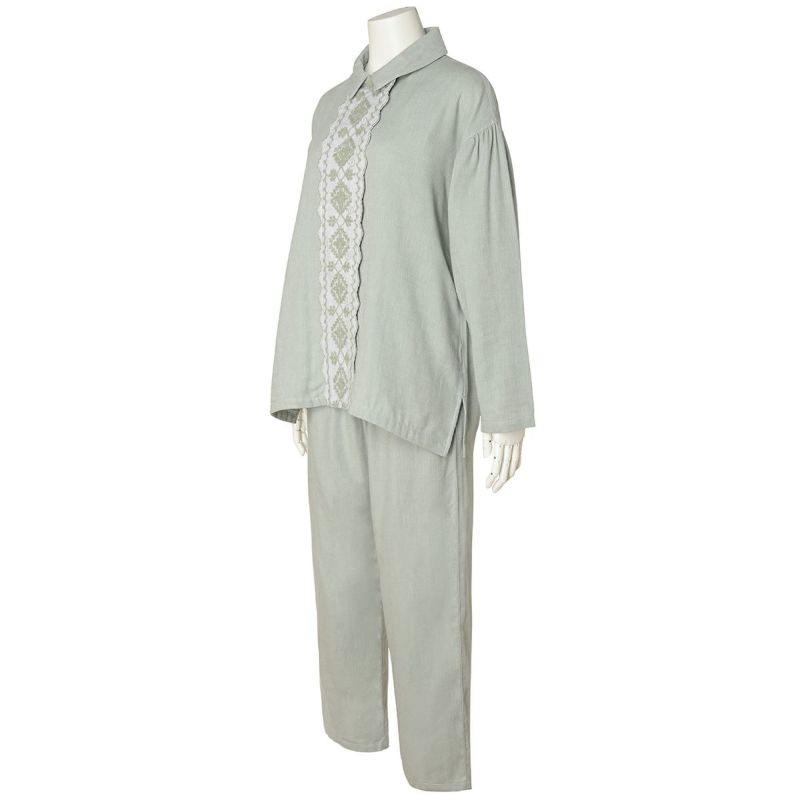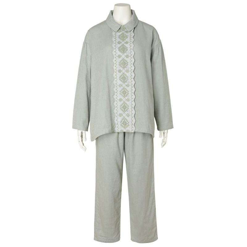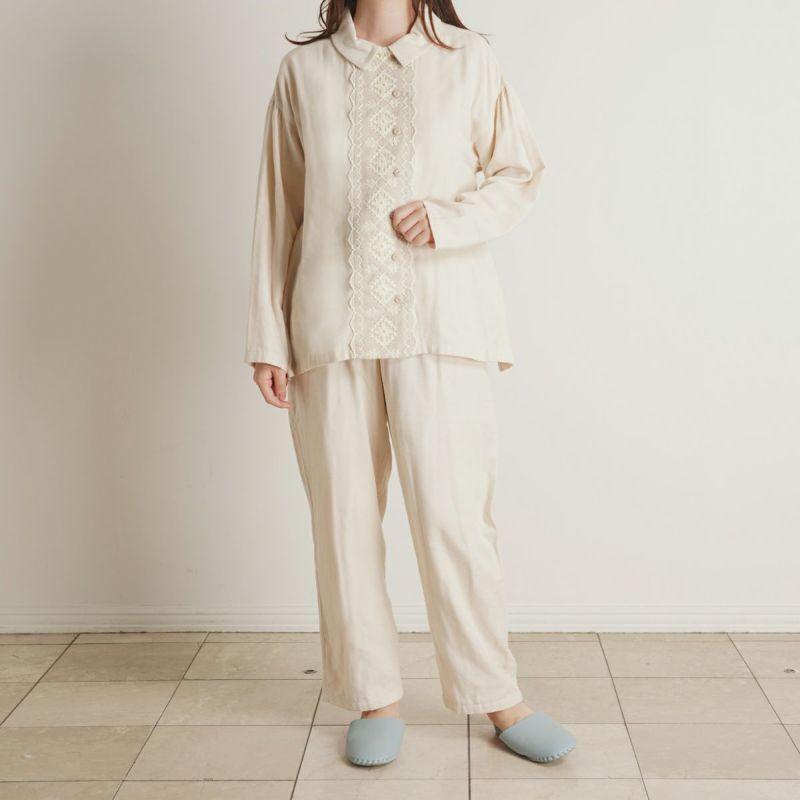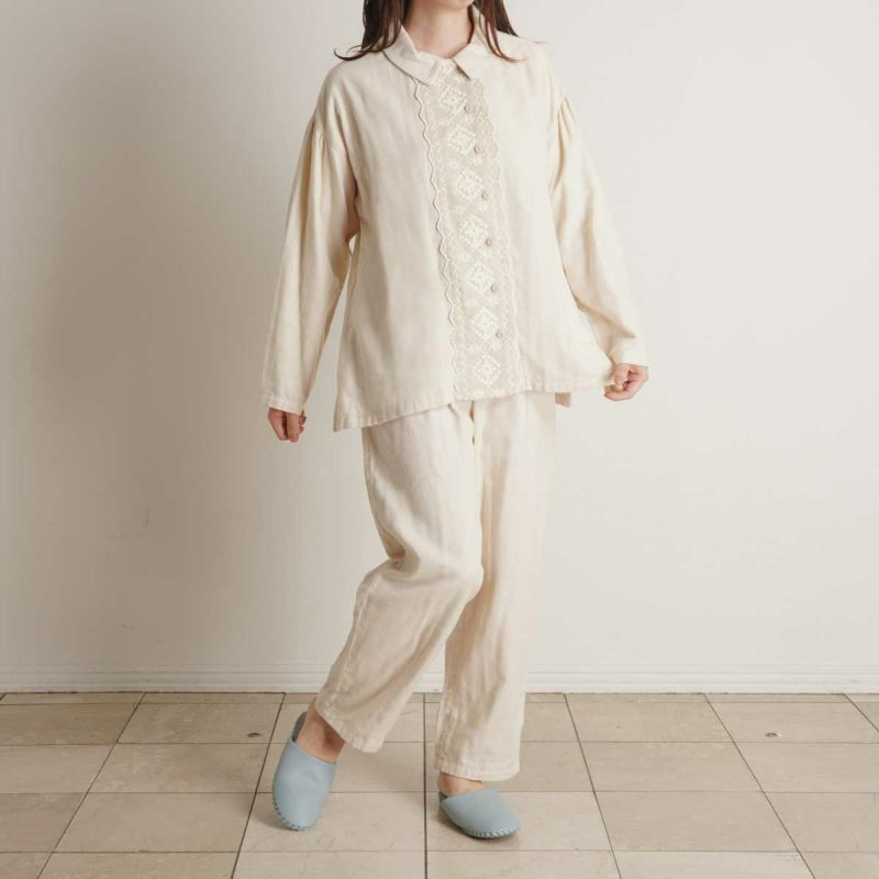 オリジナルのコード刺しゅうのスカラップレースがかわいらしく手の混んだナイトウエアシリーズ。両面に起毛をかけ、あたたかみのあるWガーゼ素材。椿オイル加工をほどこし、柔らかい風合いのシャンブレーWガーゼ。ナチュラルな素材感を活かしたアイボリーと表情のあるペパーミントの2色展開。