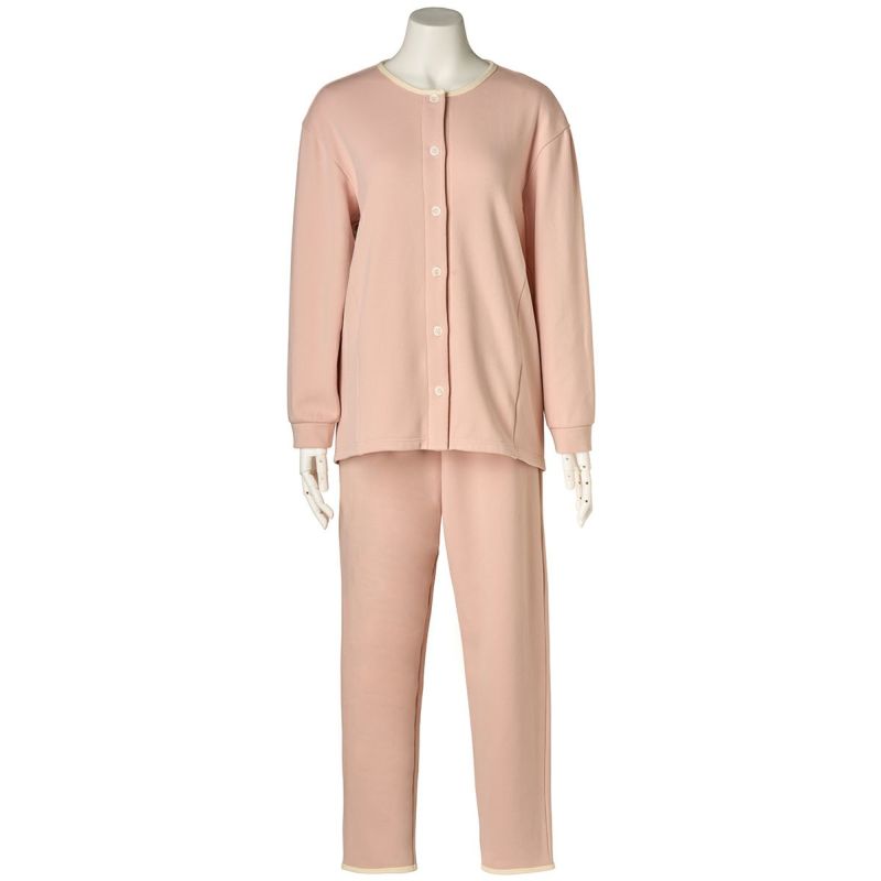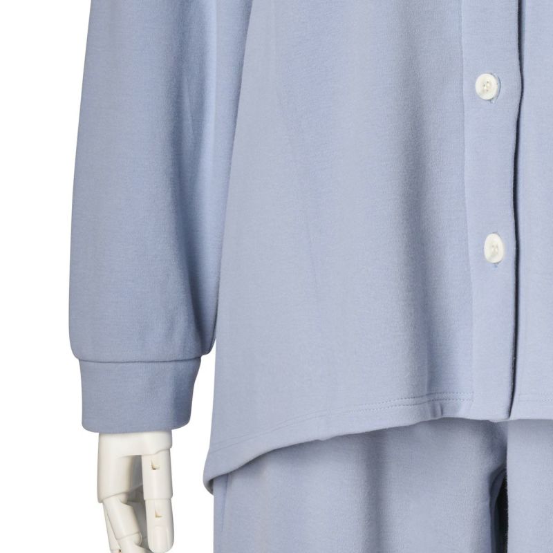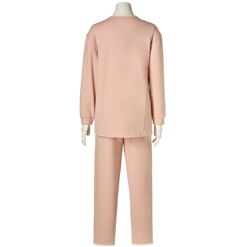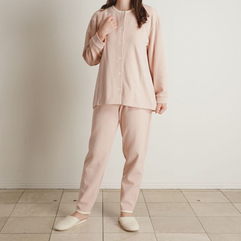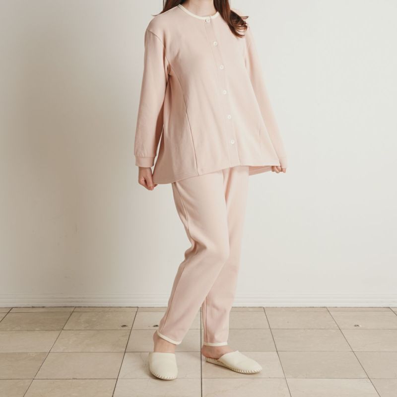 リラックスして着れるゆったりしたシルエット。襟元やポケット、裾に組み合わせた綿100%のワッフルがポイントに。トップスの裾はラウンドカーブでお腹、腰回りをカバー。パンツはウエスト紐付きで調整可能。裾はゴム入りなので就寝時にまくれ上がりずらい。