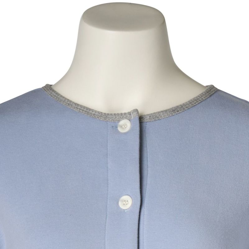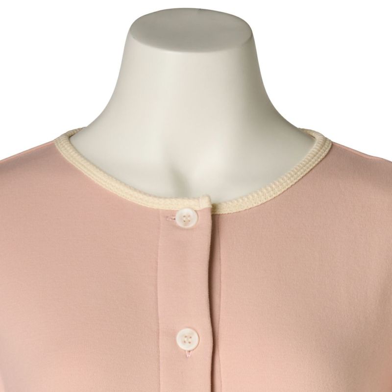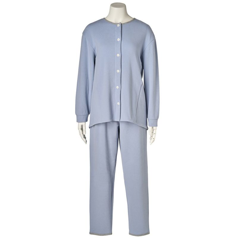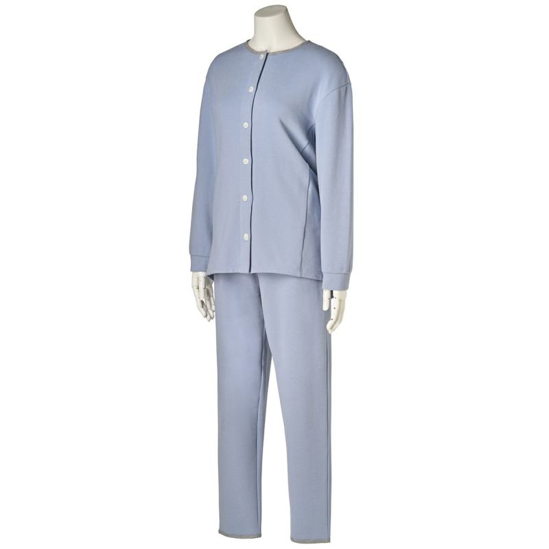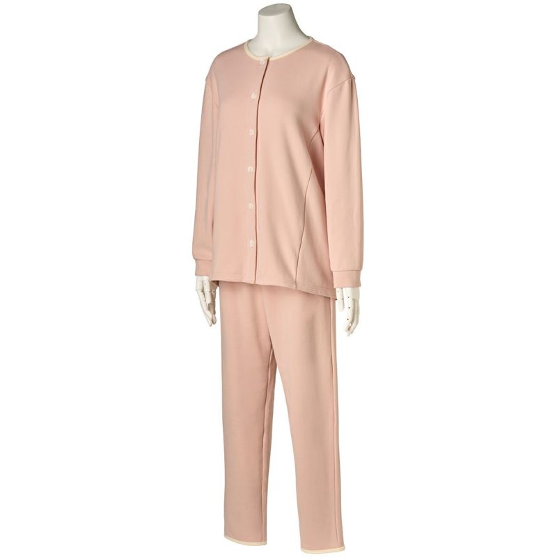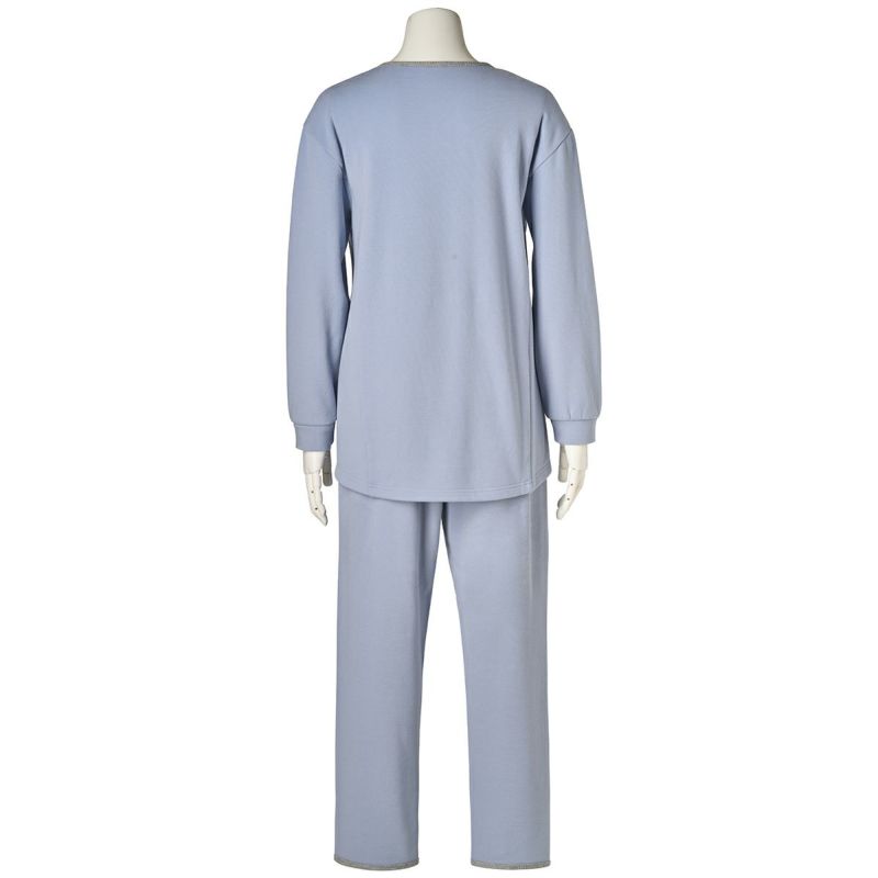 リラックスして着れるゆったりしたシルエット。襟元やポケット、裾に組み合わせた綿100%のワッフルがポイントに。トップスの裾はラウンドカーブでお腹、腰回りをカバー。パンツはウエスト紐付きで調整可能。裾はゴム入りなので就寝時にまくれ上がりずらい。