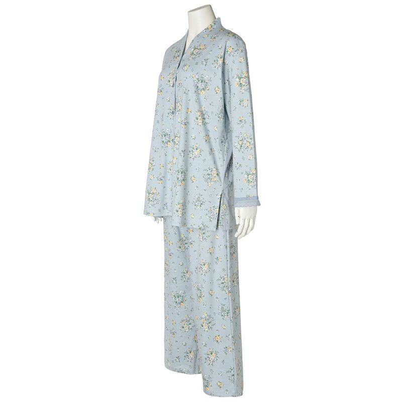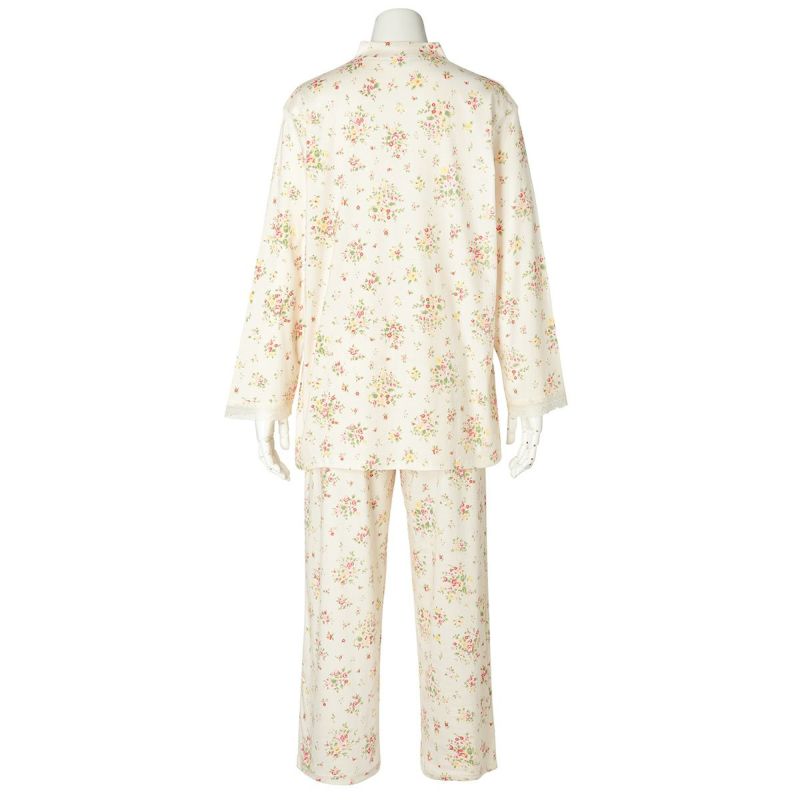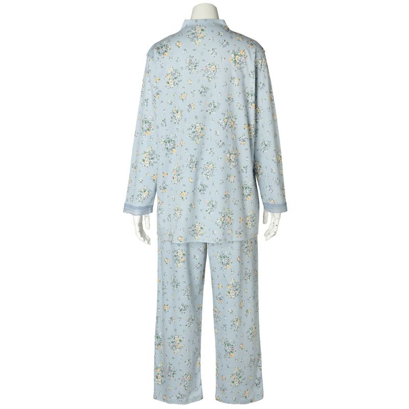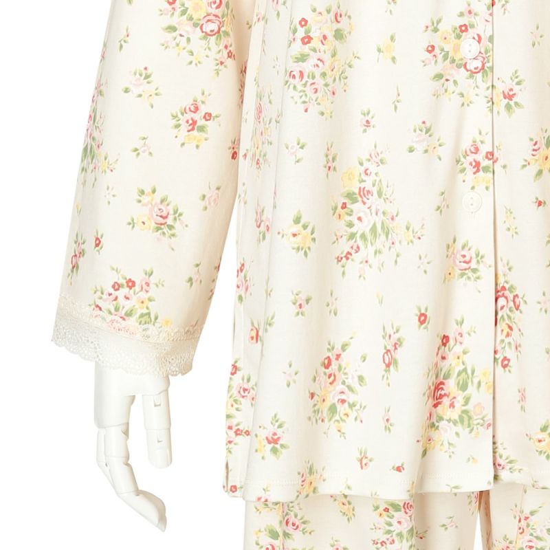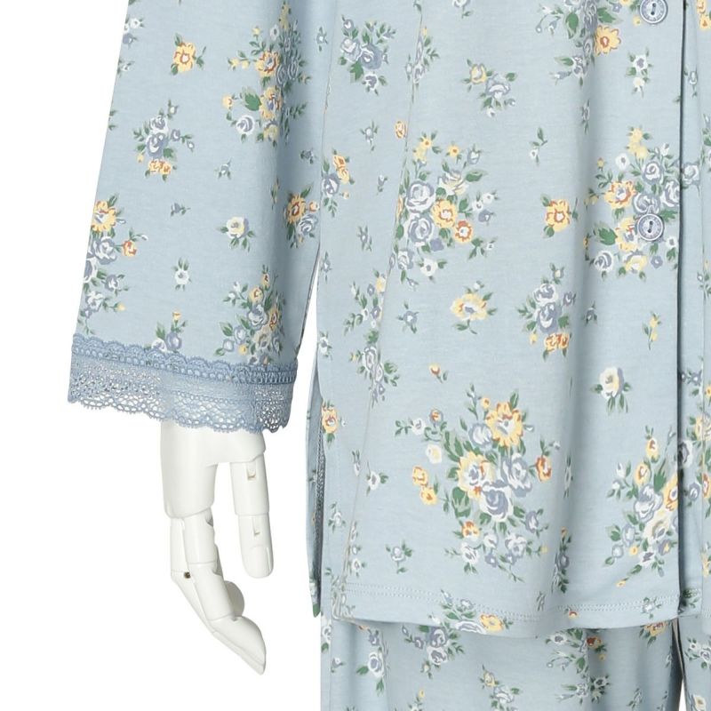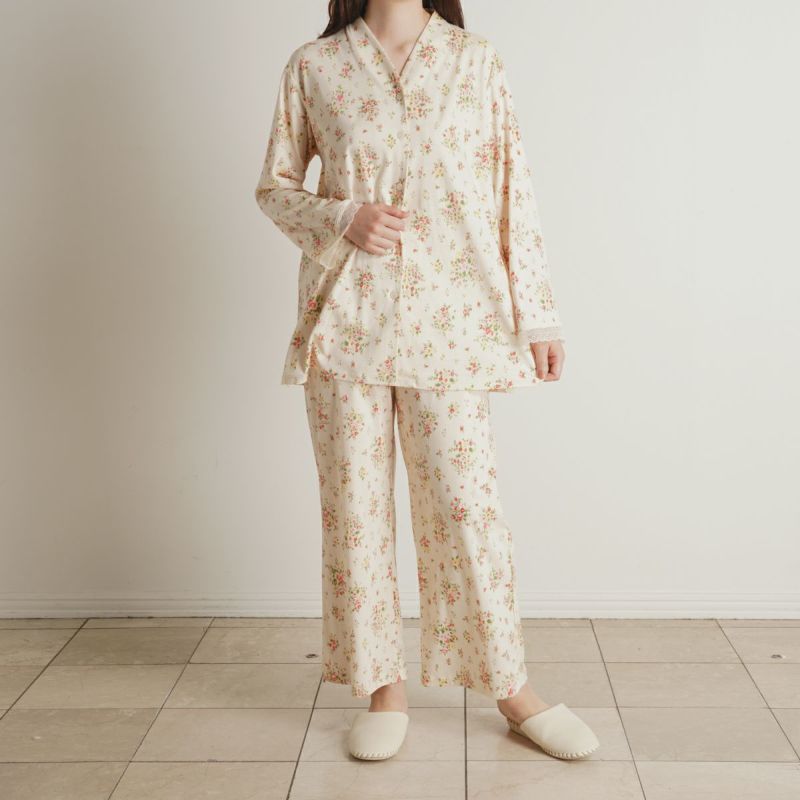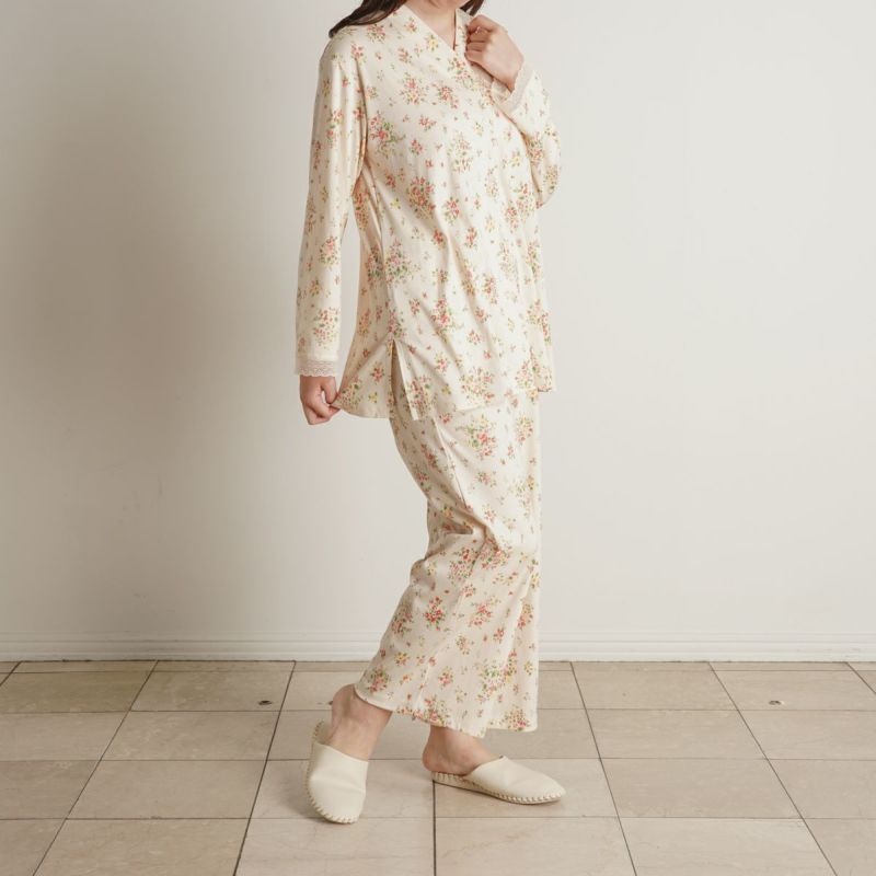 首に沿った襟開きがエレガントな長袖パジャマ。ドロップショルダーでリラックス感のある着心地。トップス裾サイドにはさりげなくスリットにし抜け感を。ボトムスはフルレングス丈。表面に施された加工により防しわ効果も。袖口のレースもポイントです。