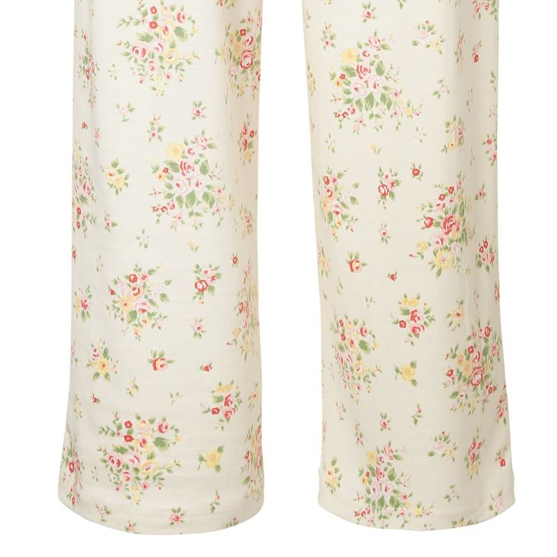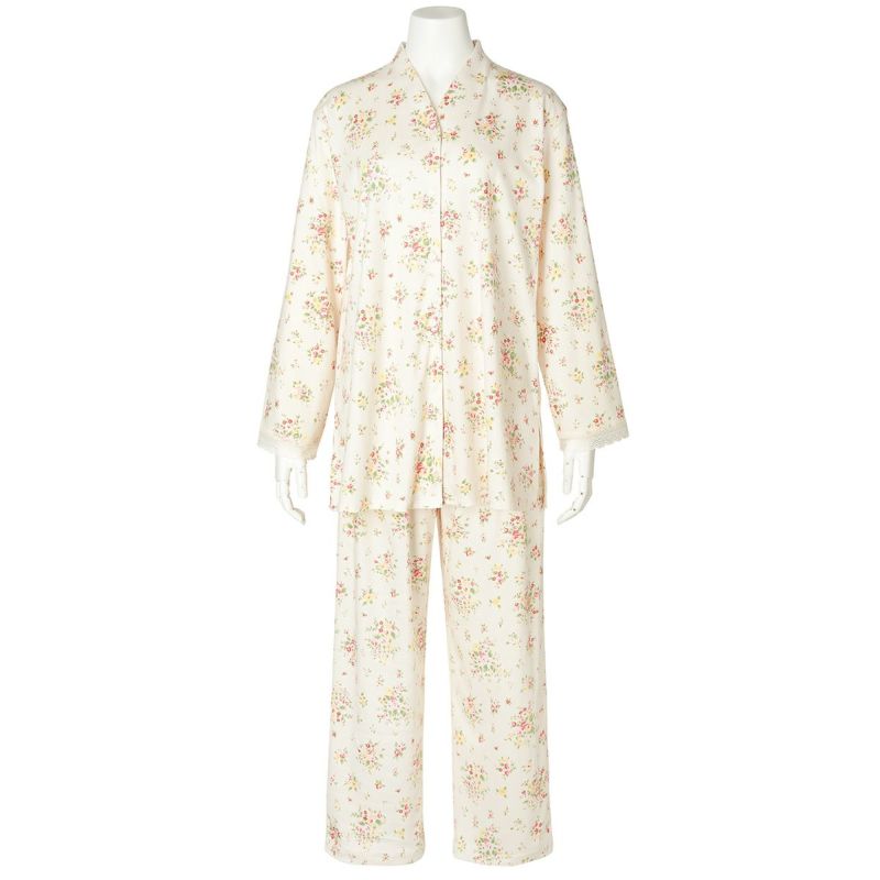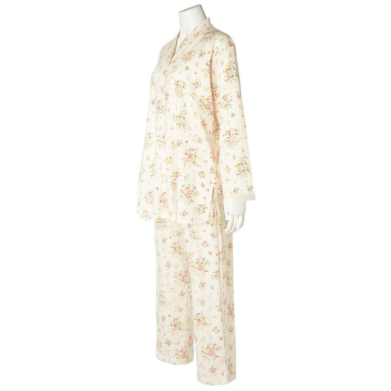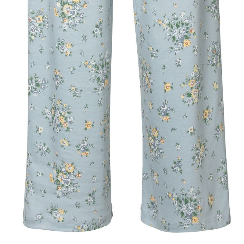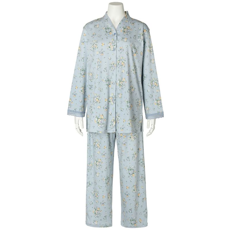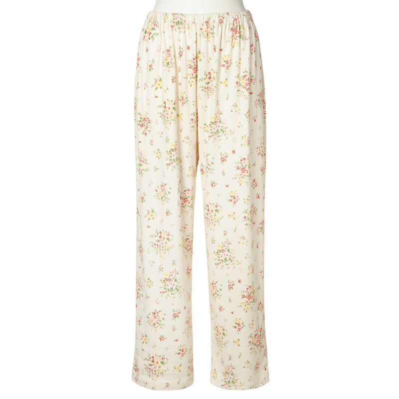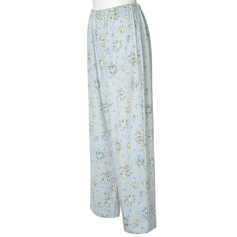 首に沿った襟開きがエレガントな長袖パジャマ。ドロップショルダーでリラックス感のある着心地。トップス裾サイドにはさりげなくスリットにし抜け感を。ボトムスはフルレングス丈。表面に施された加工により防しわ効果も。袖口のレースもポイントです。