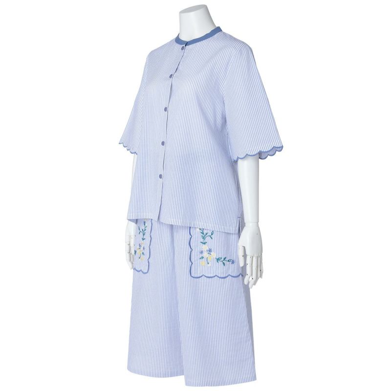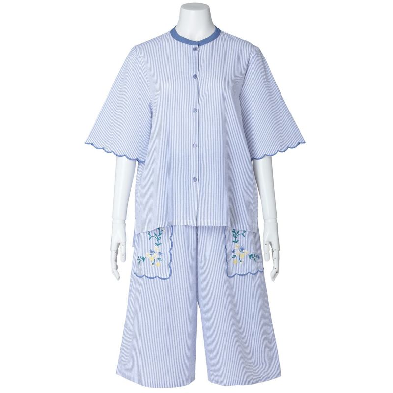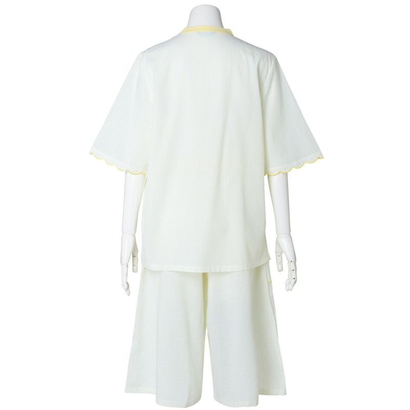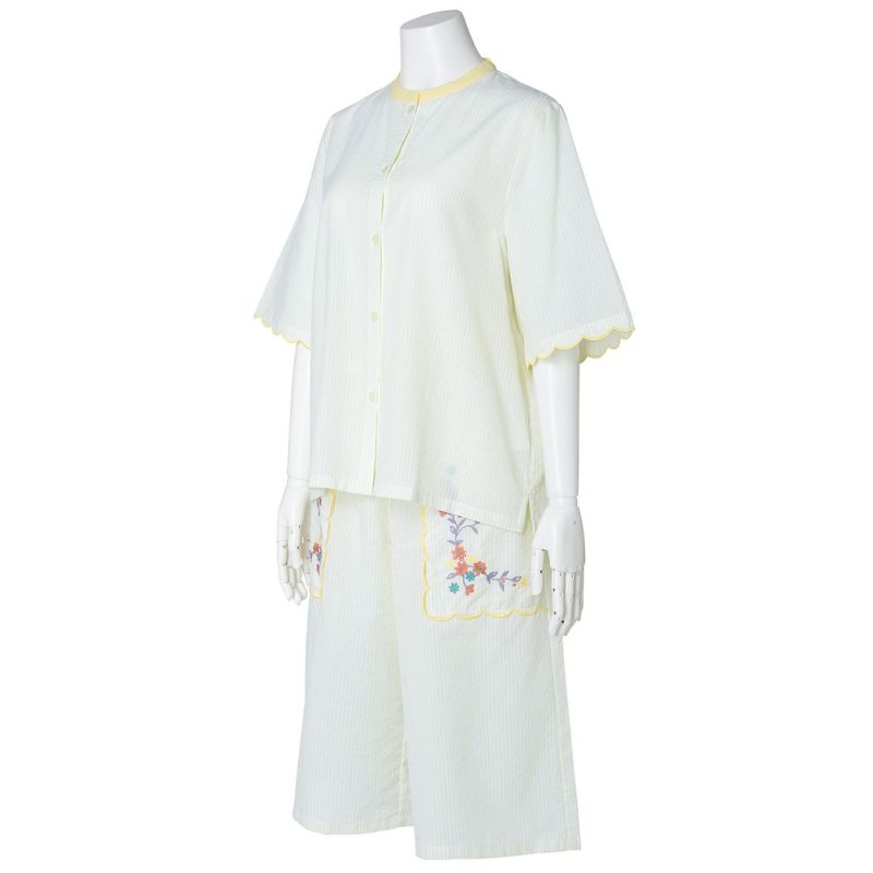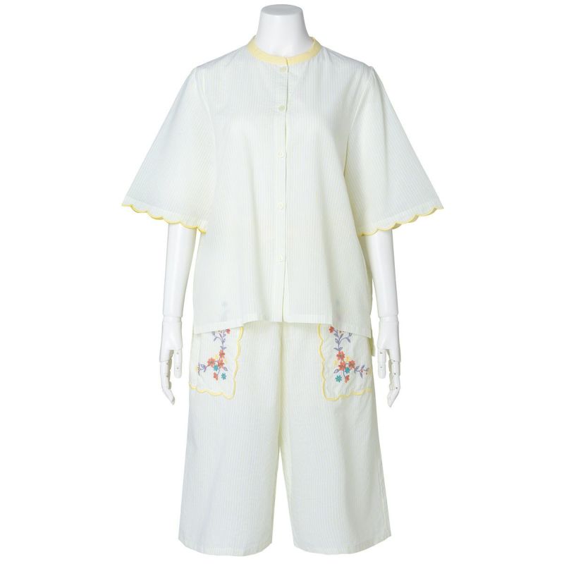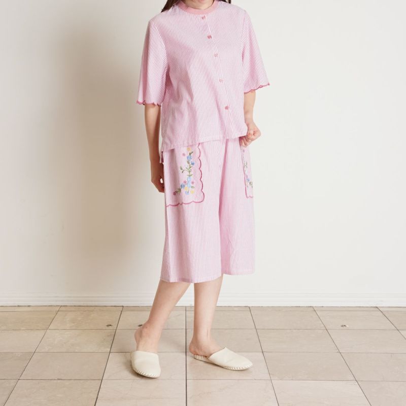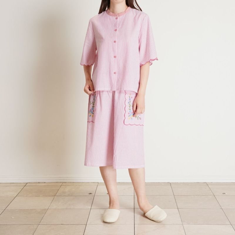 5分袖パジャマは、スカラップヘムで仕立てた袖と刺しゅうの入ったポケットがデザインポイント◎おうち時間もおしゃれに過ごせること間違いなし!6分丈ボトムスで足さばきも良い。機能性&デザイン性を兼ね備えたアイテムです。