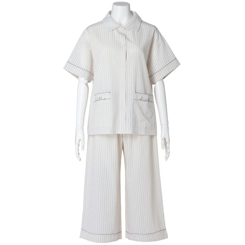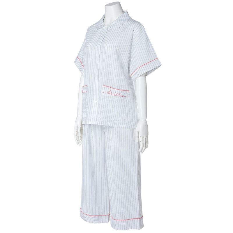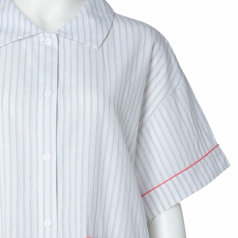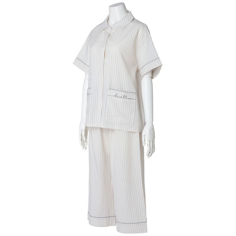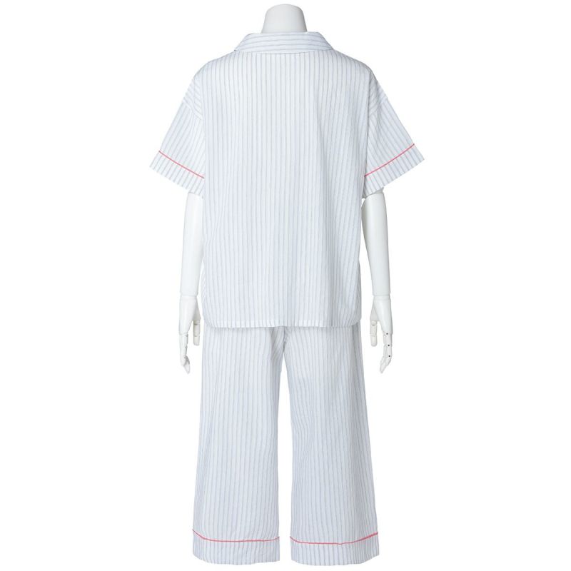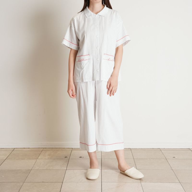 半袖パジャマは、小さめの襟がポイントのシャツデザイン。ボトムスは8分丈のセミワイドシルエット。パイピングとロゴが新鮮なアクセントになり、シンプルながらも洗練された印象に。おうち時間の気分を上げてくれる可愛らしい1着。